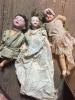 All clothing is original with dolls. One boy in blue sailor outfit with blonde hair and blue eyes, missing a shoe. Two baby girls, one sleeping with an ivory and pink pajama set with brown hair, the other in a dress with a cat on the front with brown hair and green eyes, one of the fingers on the one with the dress is halfway broken. All could use a good cleaning, specifically the clothing. Each has symbol and Jennifer Schmidt signature engraved on back of neck.
