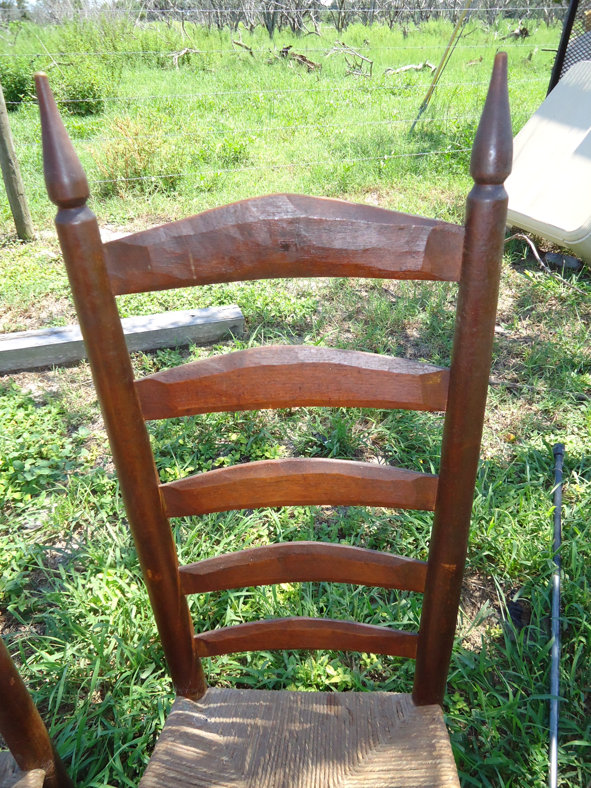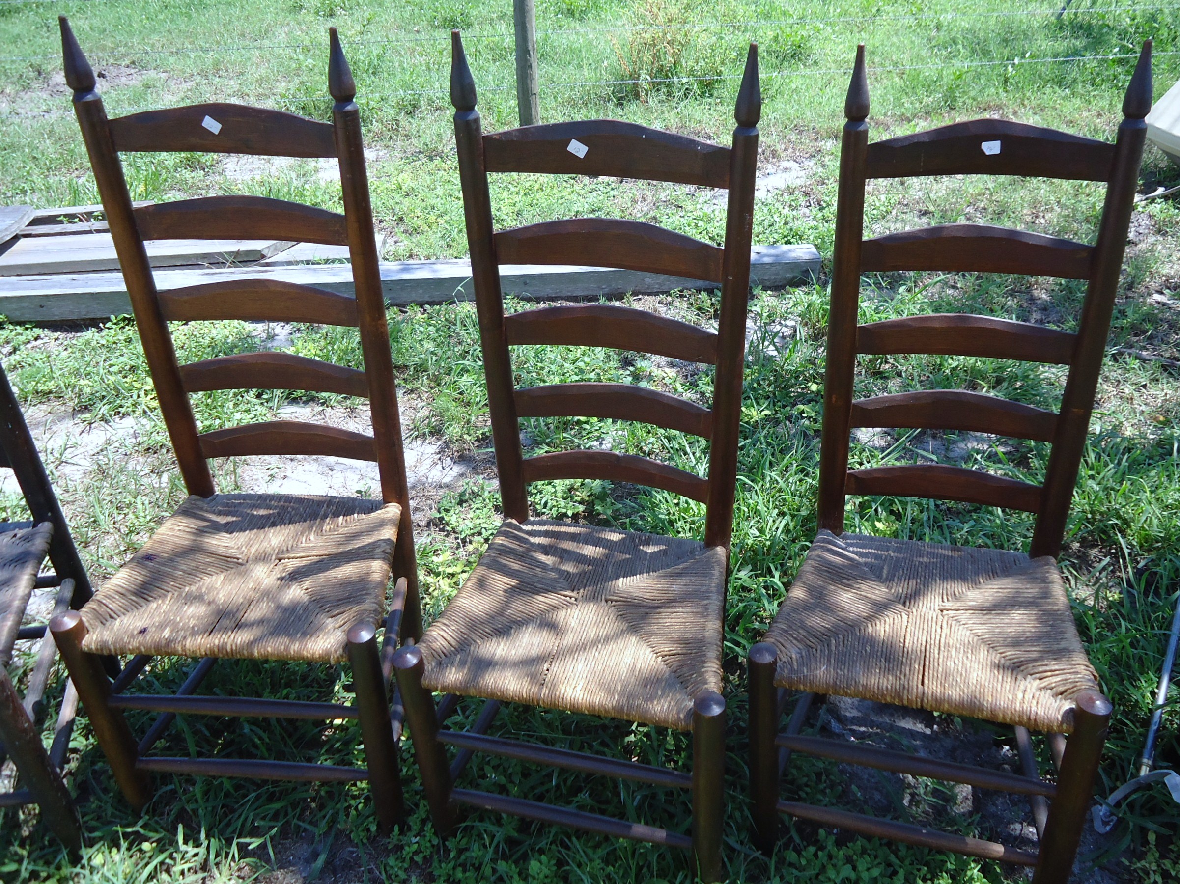 I have 3 of these ladder back hand carved chairs. They appear to have a rush seat. I am not sure of the type of wood used, possibly maple.  I am trying to sell these and need more info. Thank you
