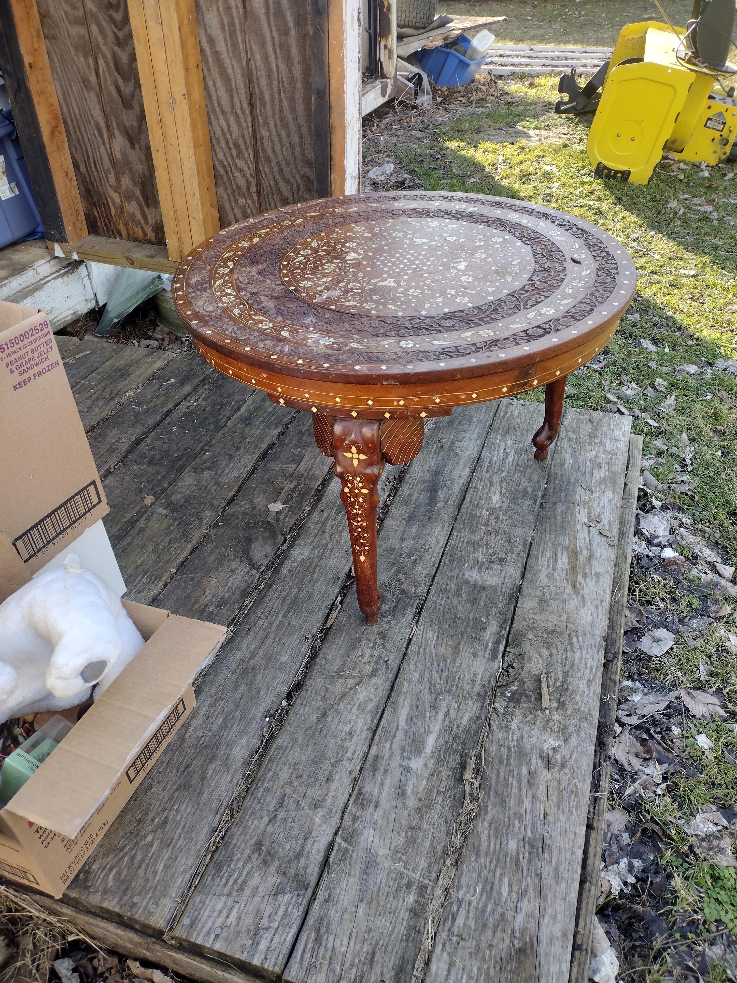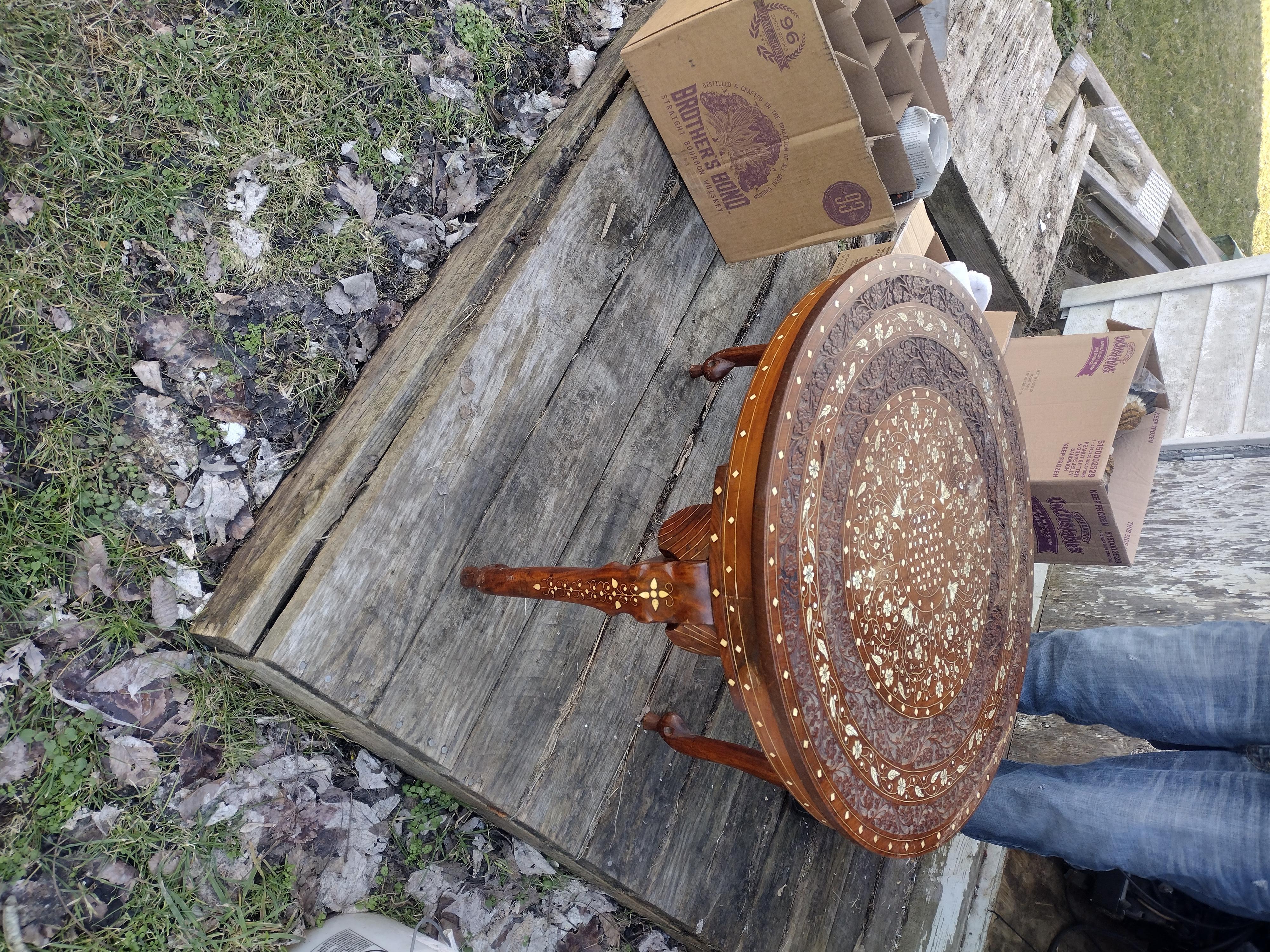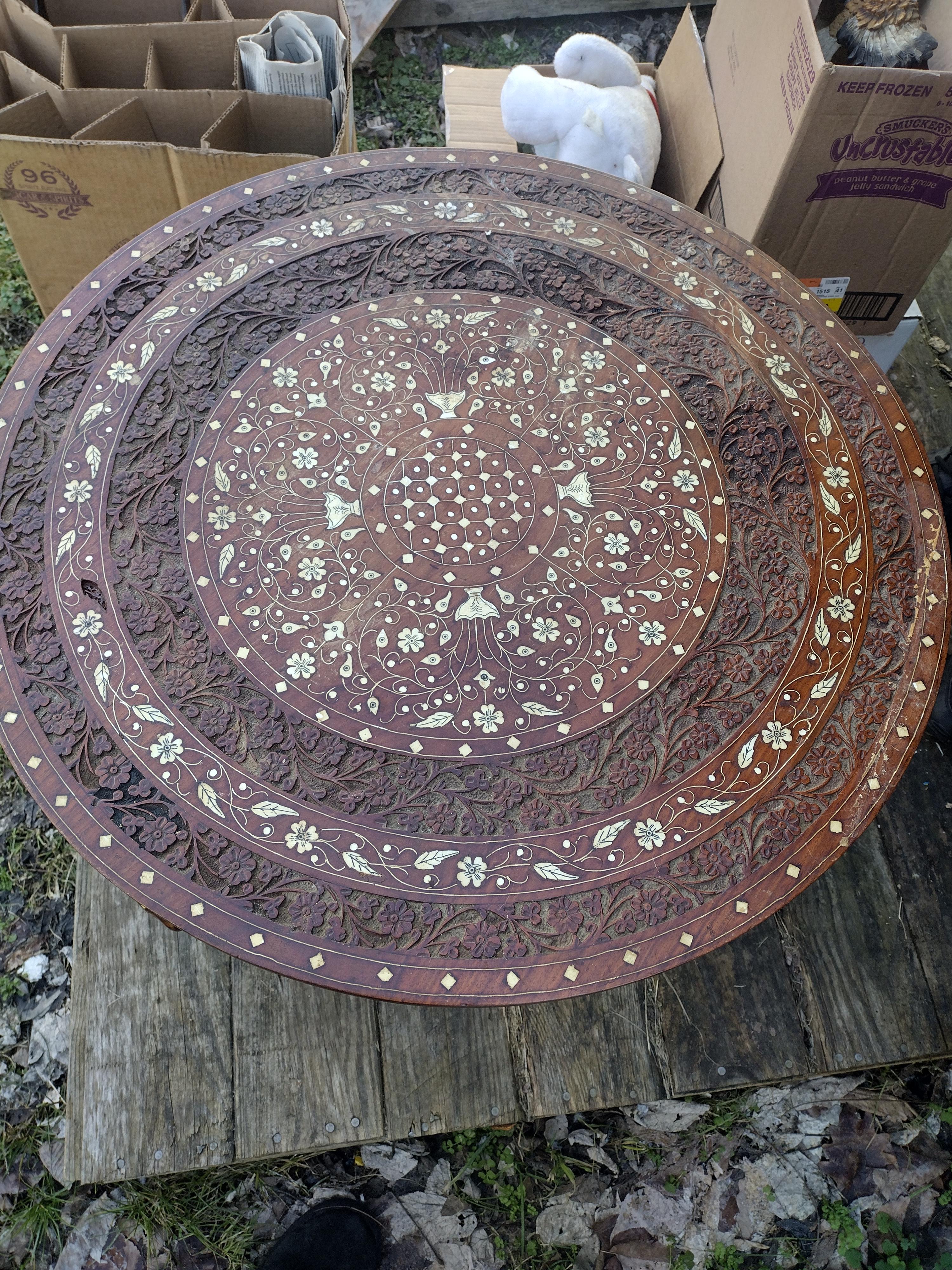 3 legged hand carved wooden elephant table. Beautifully hand carved floral inlay. And what I suspect to be ivory or something similar detail through out .
