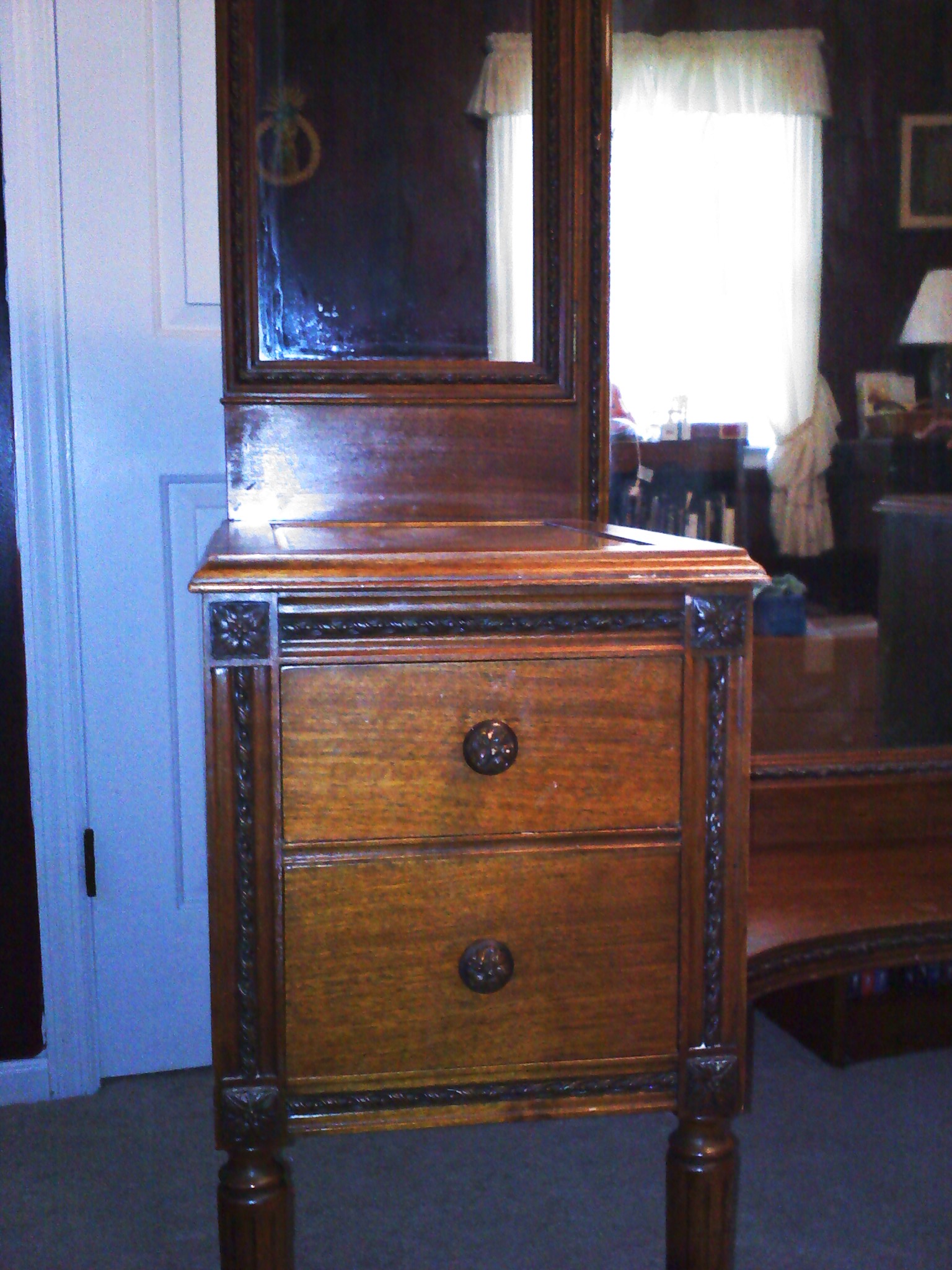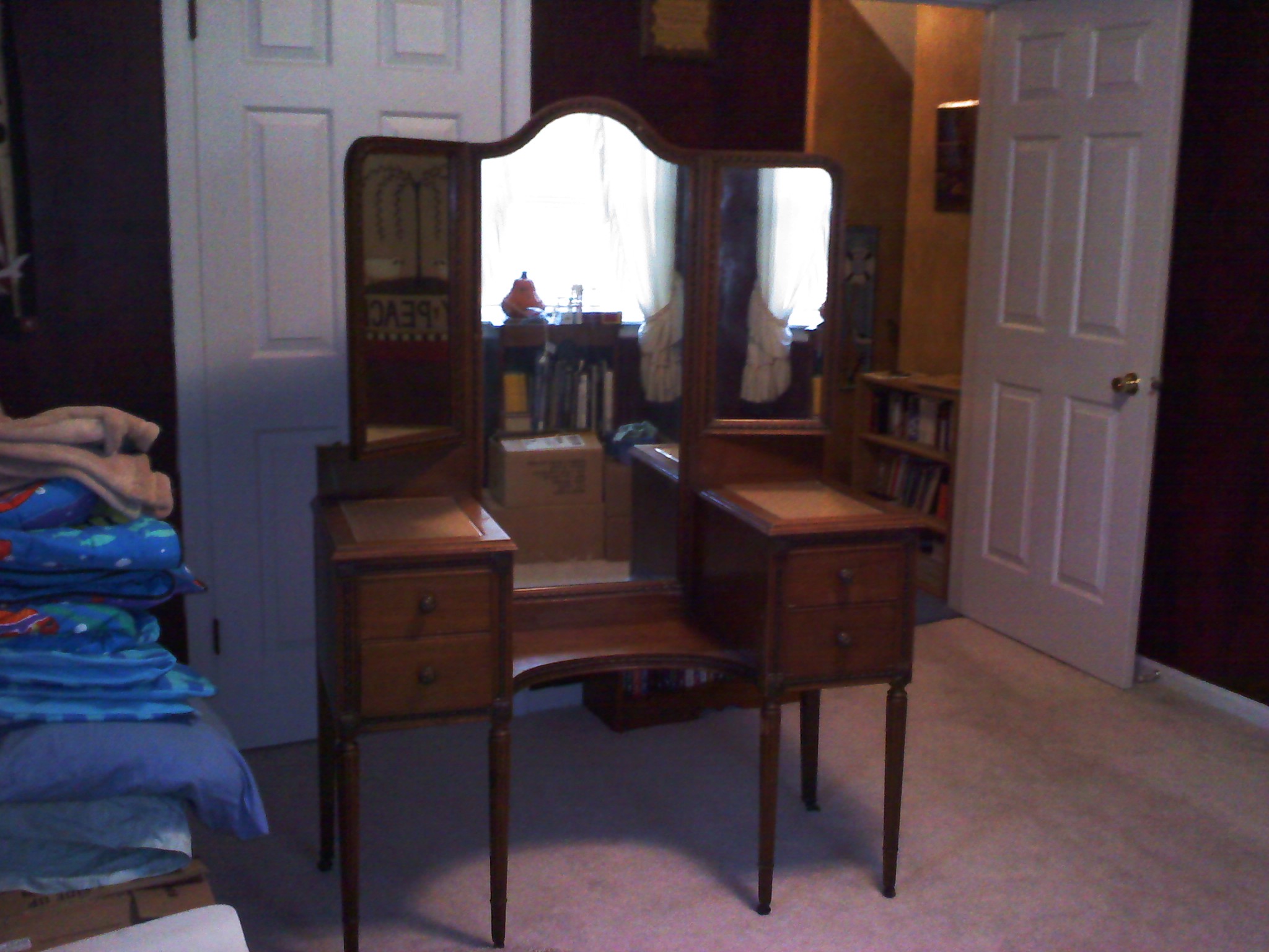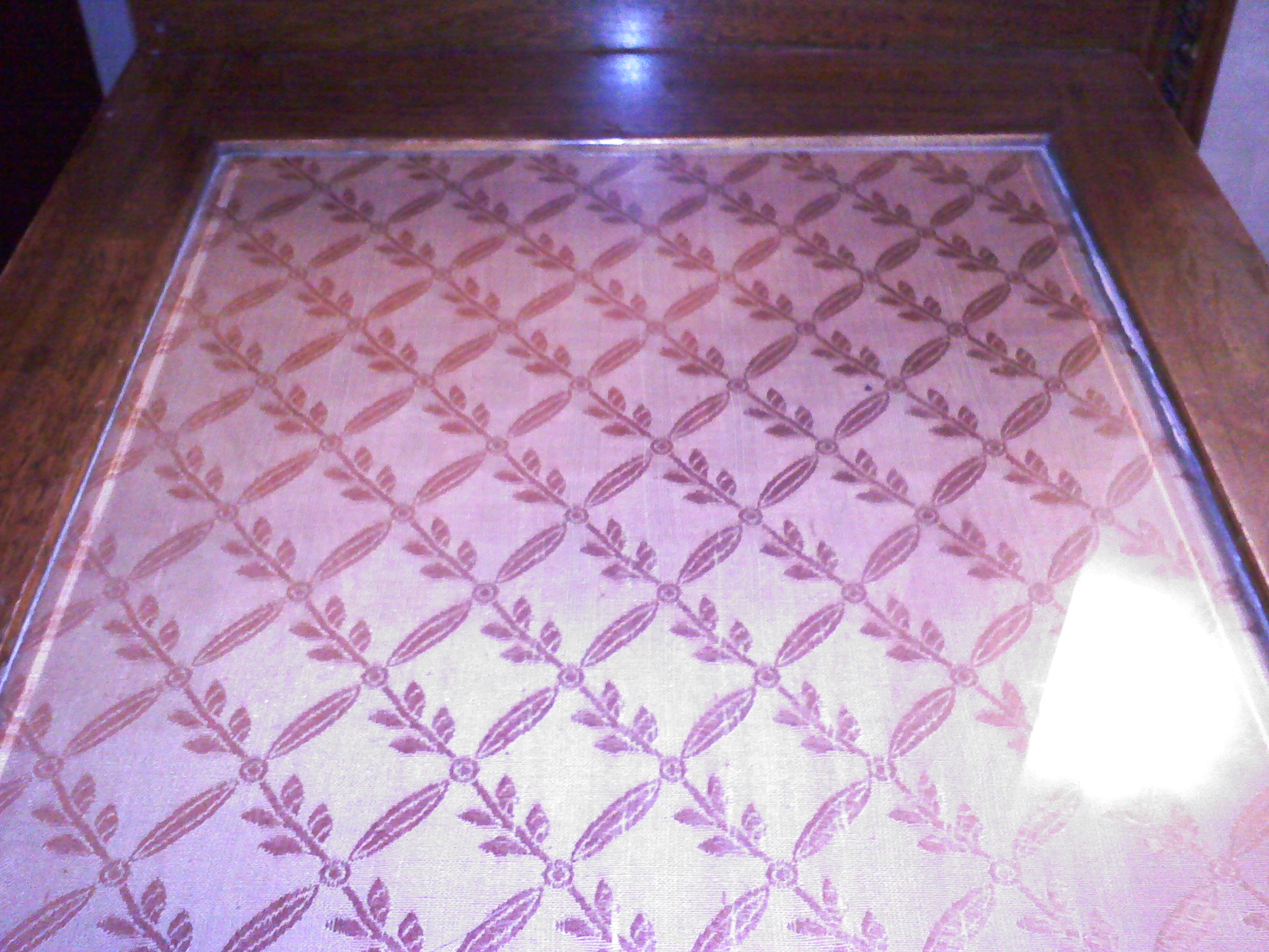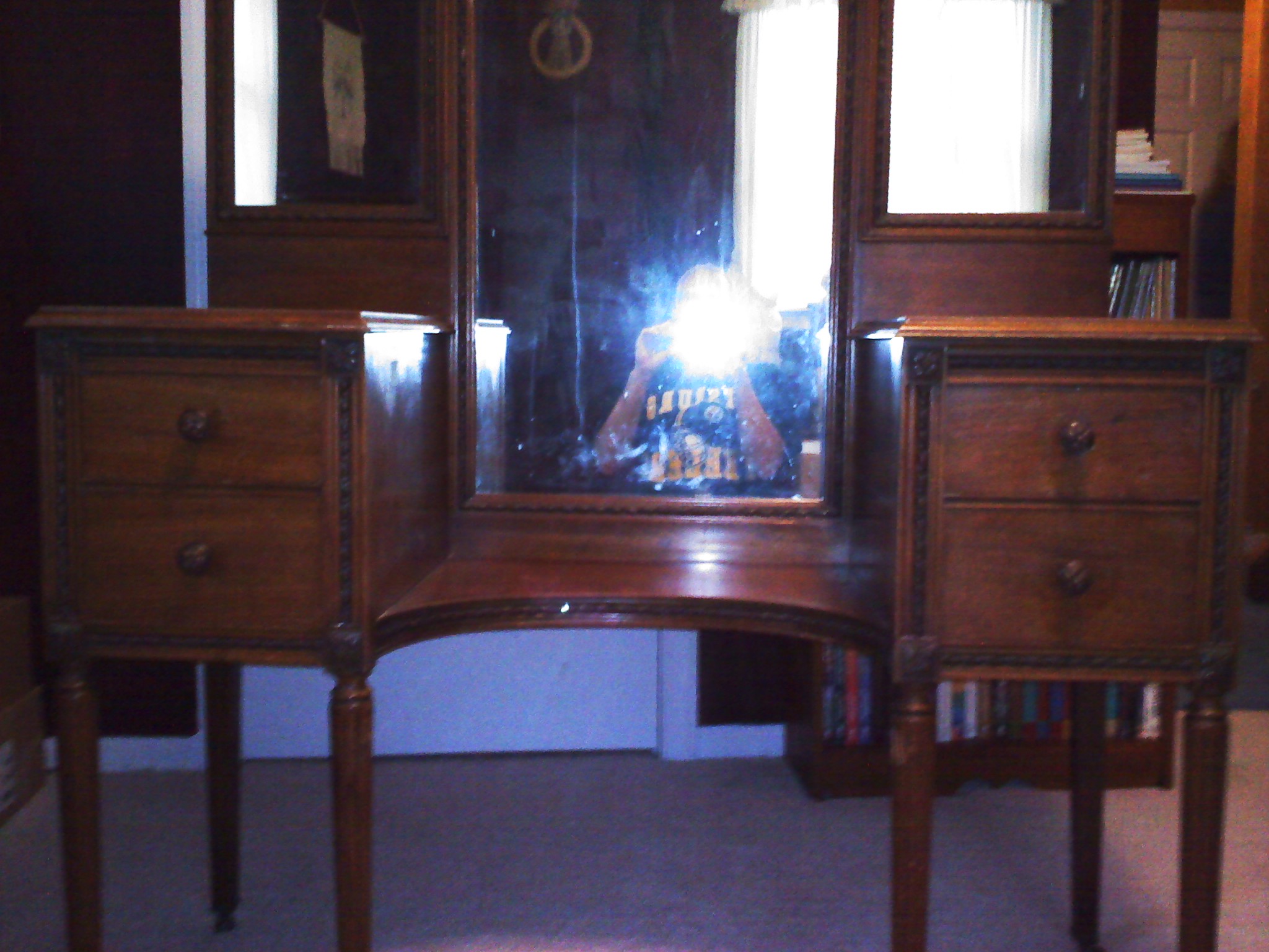 The side mirrors are hinged and fold in. The seat has rushing that is intact but is very brittle and would not support a person. Intricate detailing around the mirrors as well as each area. The side pieces have glass on the top with Fabric inlayed underneath the glass.