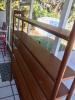 I really don't know much about these pieces except that they are very well made, sturdy and quirky. Not antique, since the armoire is actually a computer desk. the handle on it is turquise and a red "scarab" shaped piece that looks like it was a belt buckle. Doors on the side open up, drawer on each side with a "cherub" like piece on the handle. The wood is in excellent condition with black accents. The desk has 2 pieces that fold up as if to hold a book, however there is no "well" to hold it. On the inside of one is a plaque with initials MDH. Two small drawers in front with antique looking coins as pulls, and 2 "beverage" pullouts. Wall unit is missing a door on lowere shelf.