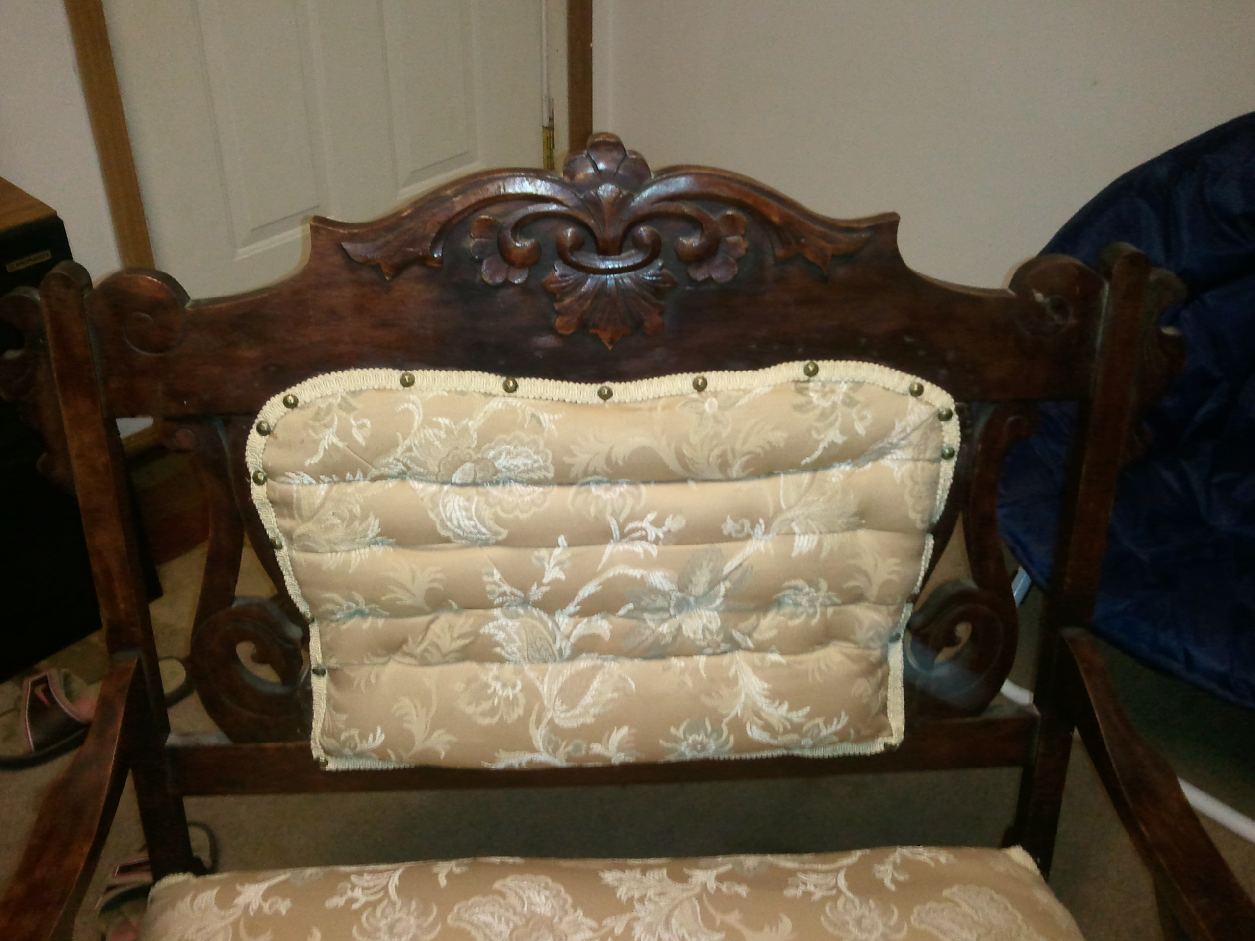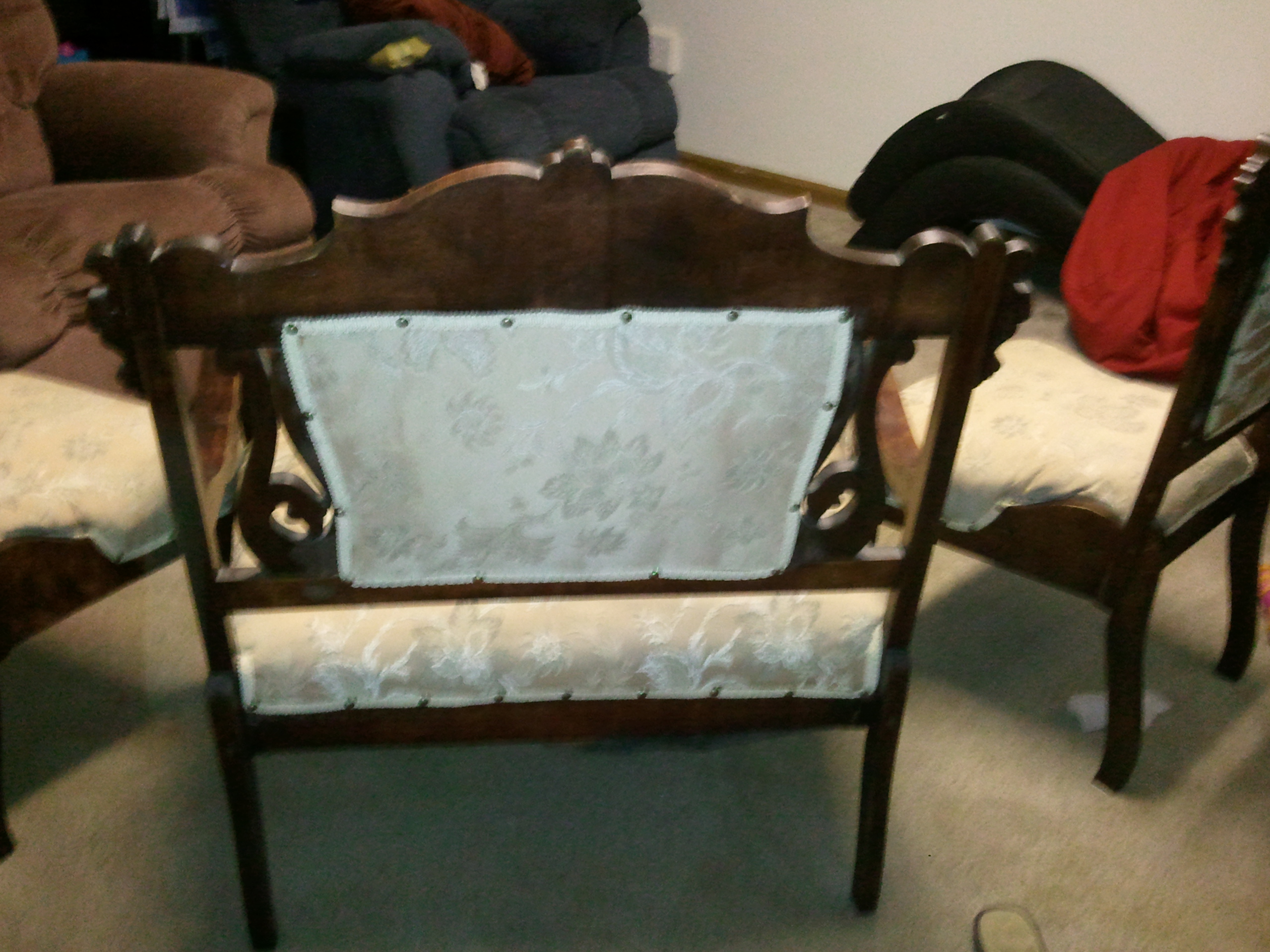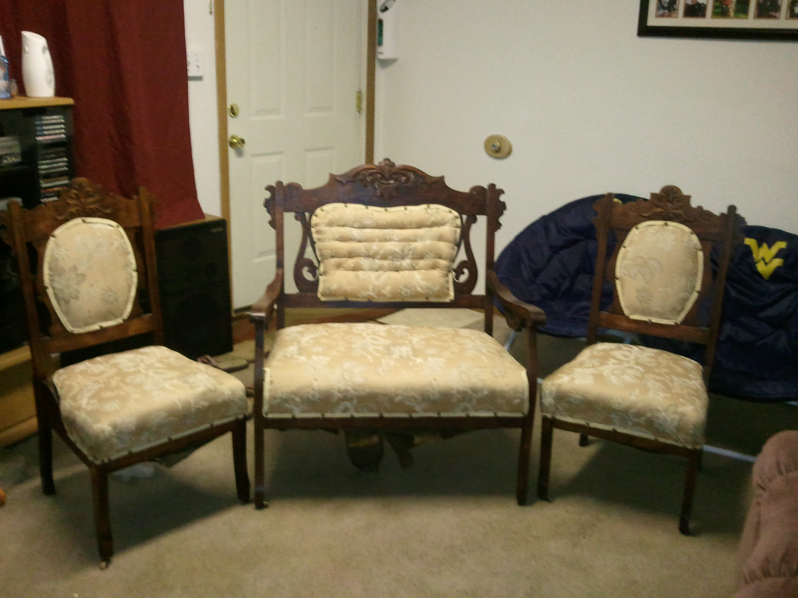 This is a 3 pc Victorian settee set. There is 2 chairs and one larger sofa type chair. There is some scratches as well as the bottom needing stapled back in. There are wooden wheels on the bottoms of the legs.