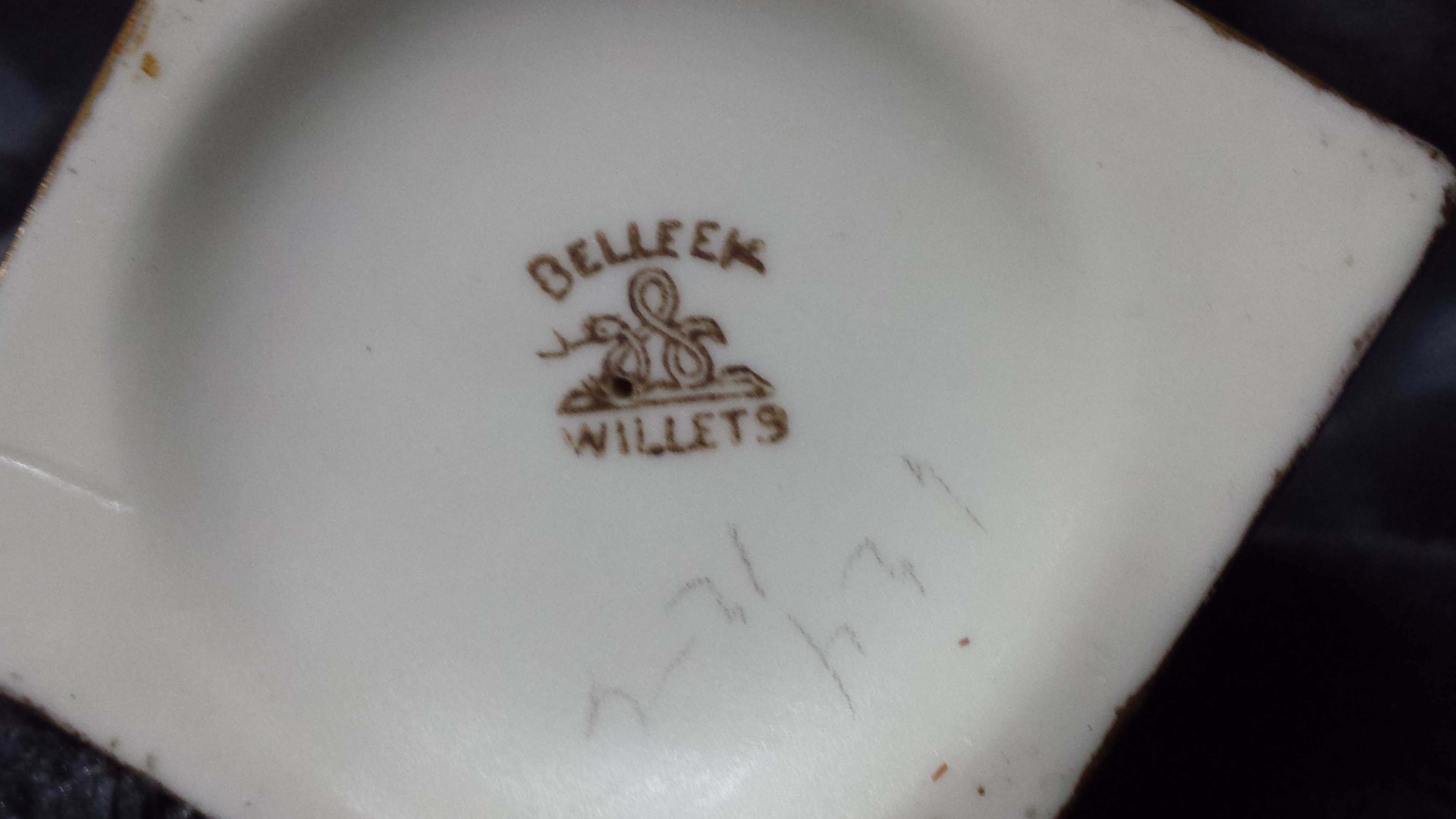 All 3 pieces have square bases painted with thick gold, and are marked "BELLEEK WILLETS" on the bottom. They are individually signed by artist J.C. Von Beutler (alias of artist Joseph C. Beitler) They have no chips or cracks and the paint is not faded. They have light/mint green backgrounds with green leaves and pink roses. They have beautiful cherubs on them. They are painted heavily in gold on bases, handles, edges and lids.