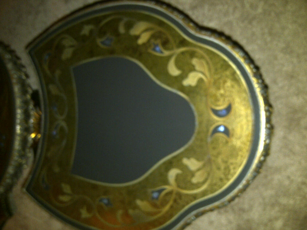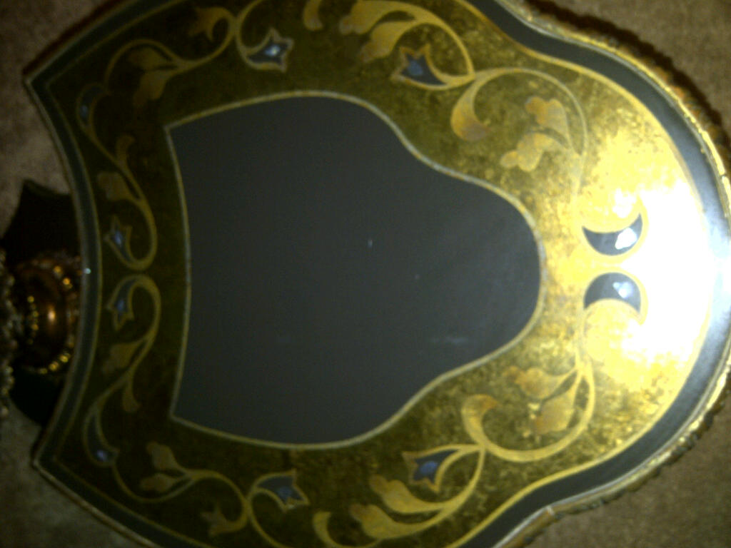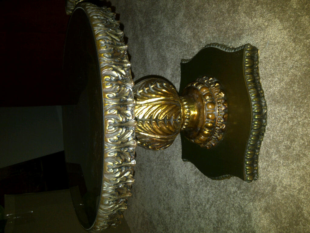 i have a 3 piece coffee table with gold foil, glass top with intricate inlay and mother of pearl esque decorations.  the pieces are very heavy and are made of wood.  each piece has a green pedastal and intricate woodworking all over it.  i am very curious about the orgin and possible value of this table.  Thamk you!