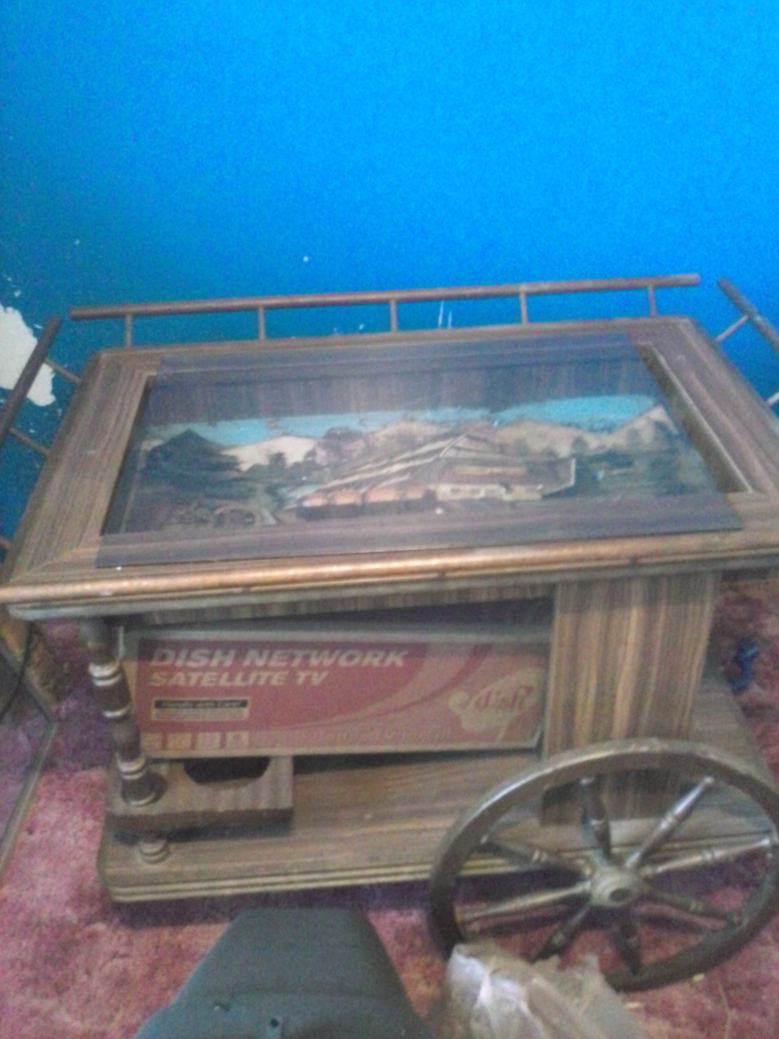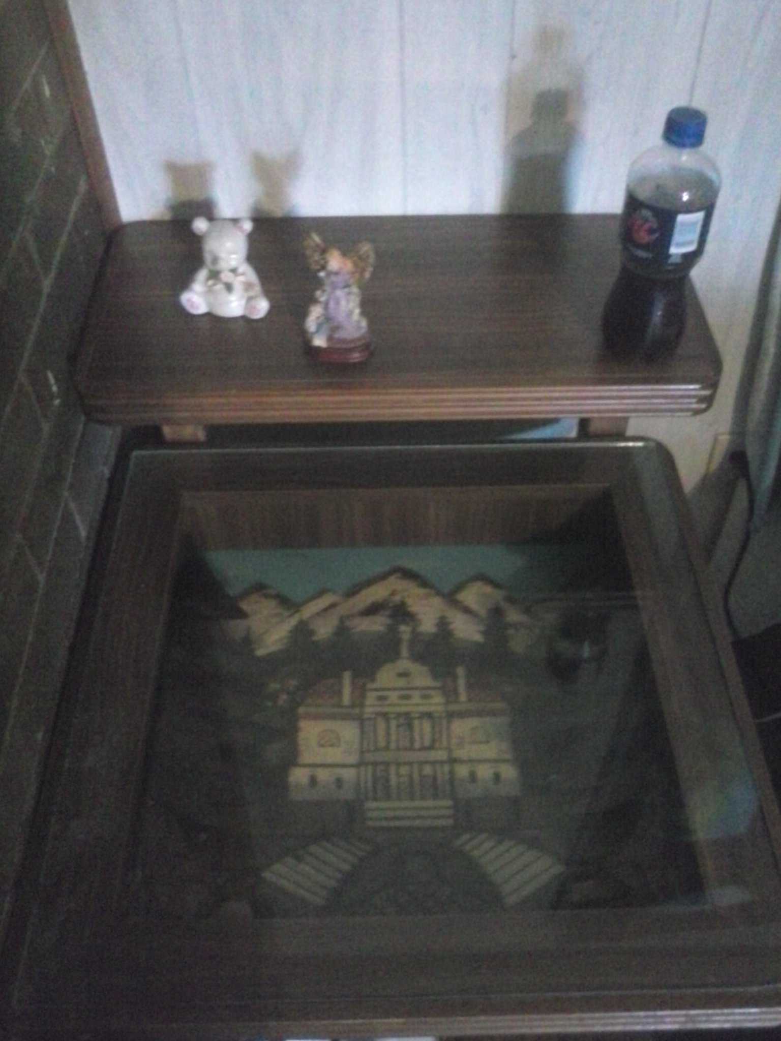 Coffe table, end table, and a cocktail cart. Bought in Germany during the 80s. Very heavy, dark colored wood. All three has glass tops. Underneath the glass tops, there are displays carved out.