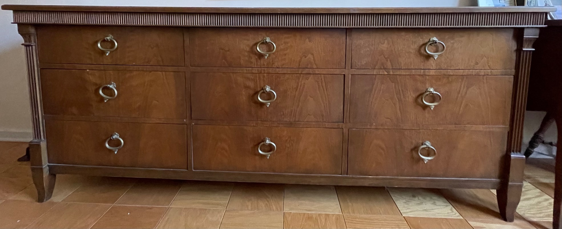 3 piece bedroom set with 9 drawer dresser/commode, 3 drawer chest with sliding doors top section and bed with headboard and support.