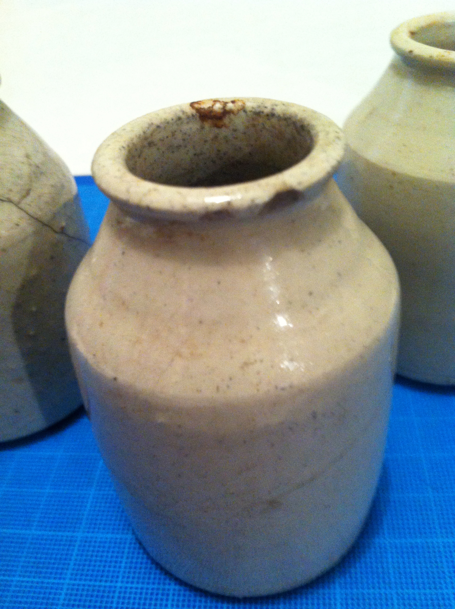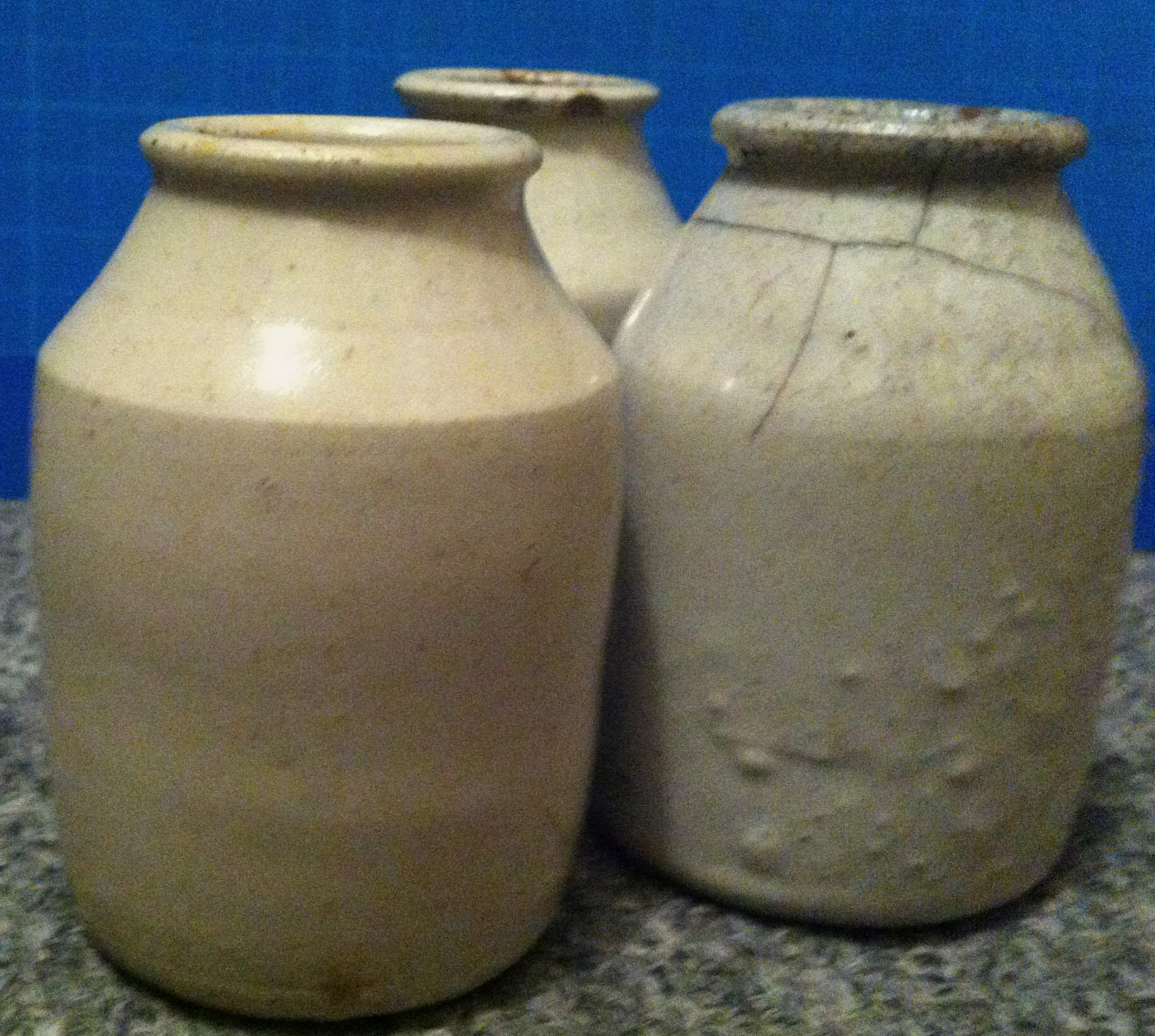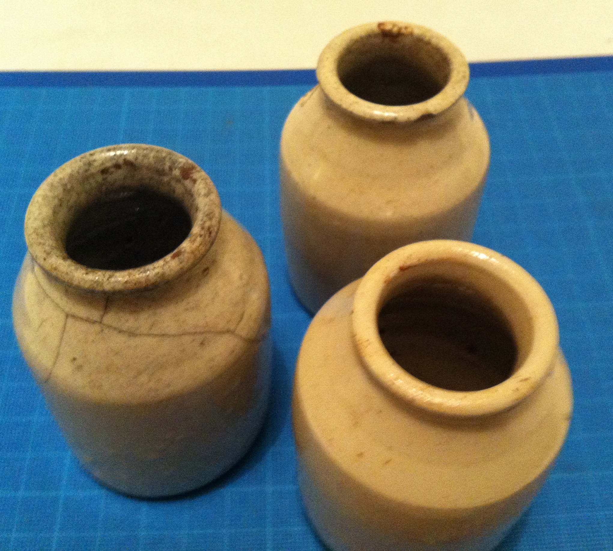 They are in variable condition...The smaller one is lighter in colour and has a finer lip. Other than being soiled from age and being buried it is in very good condition. The other two have superficial lines around the outside but they do not affect the inside...They can hold water without any leakage.