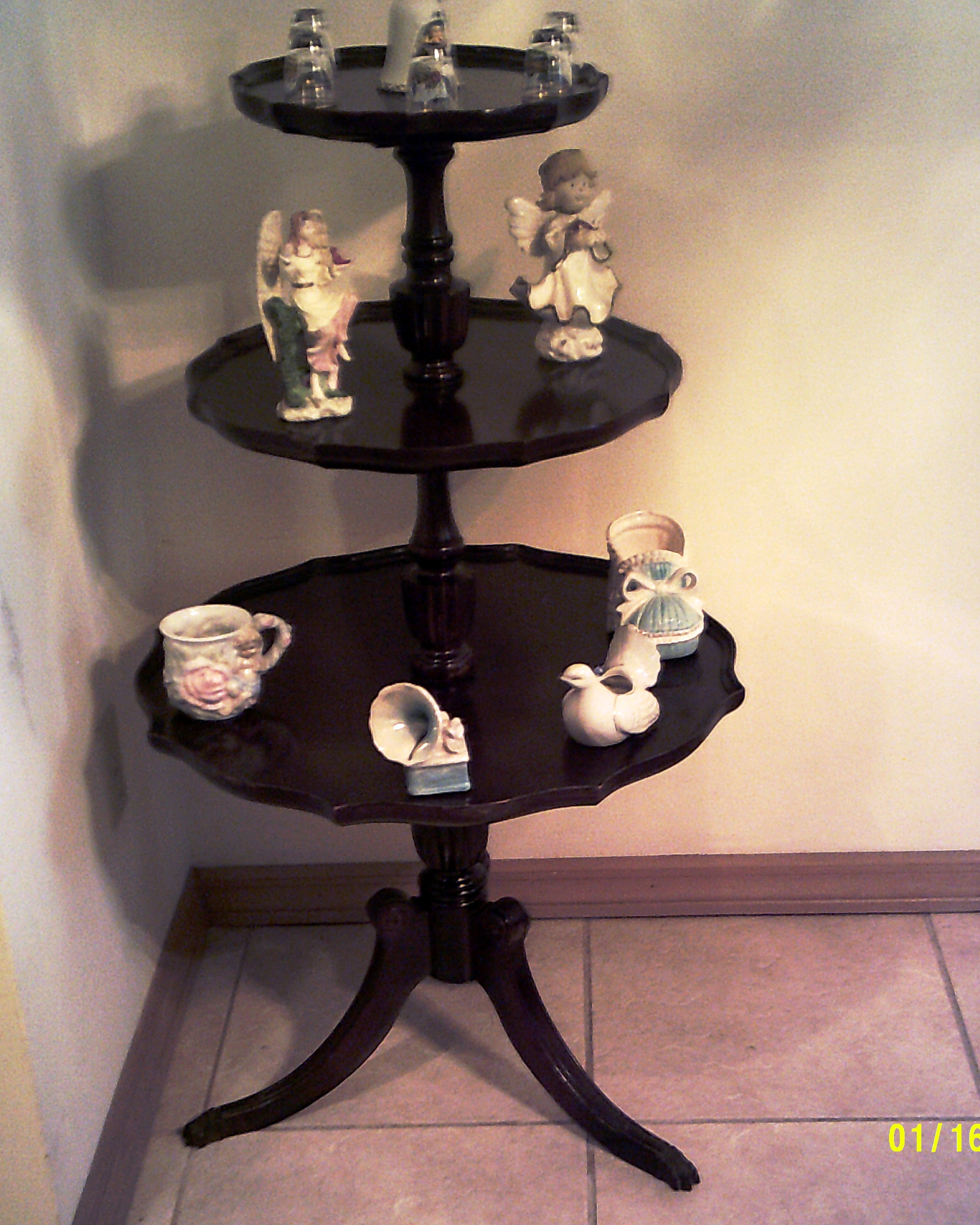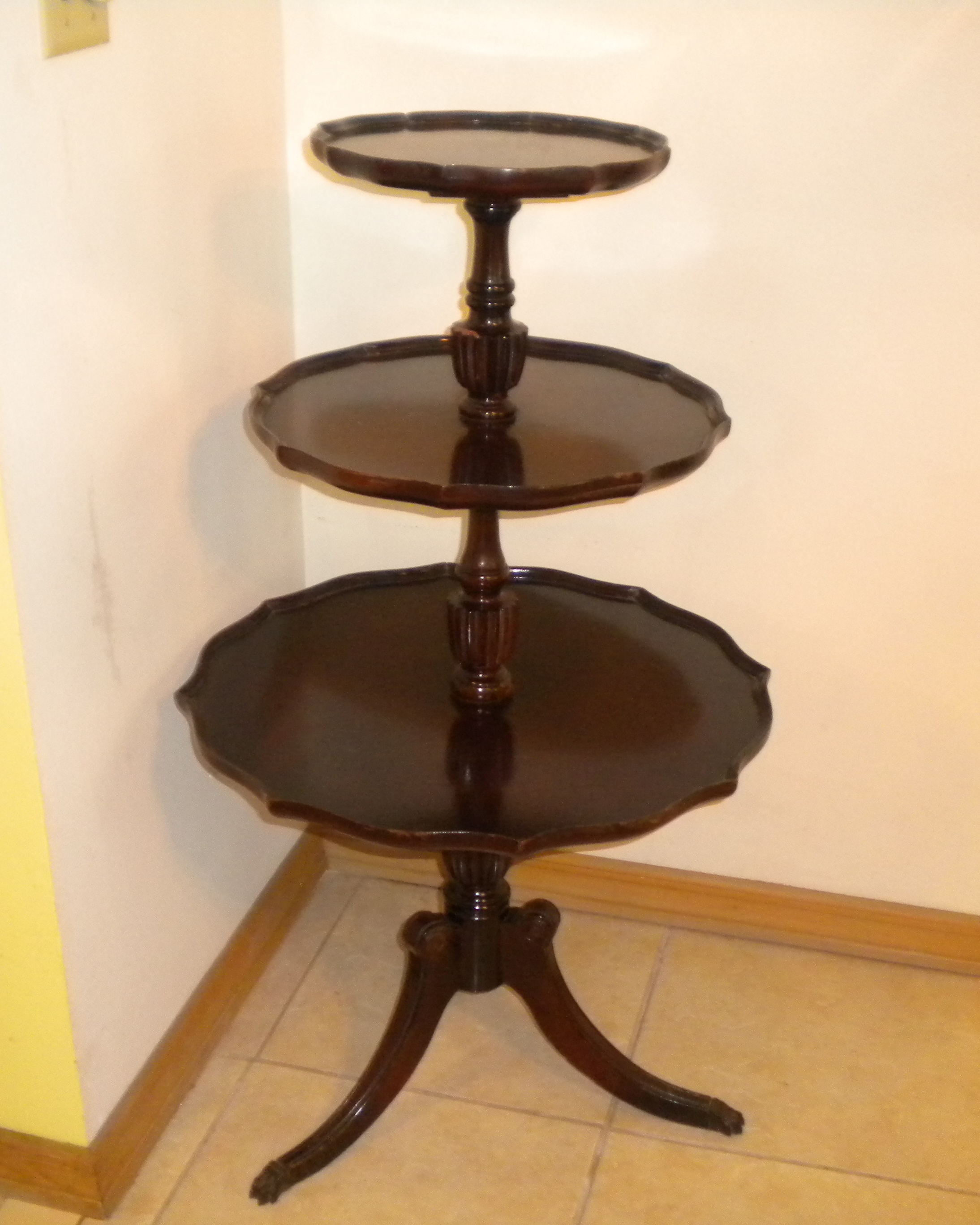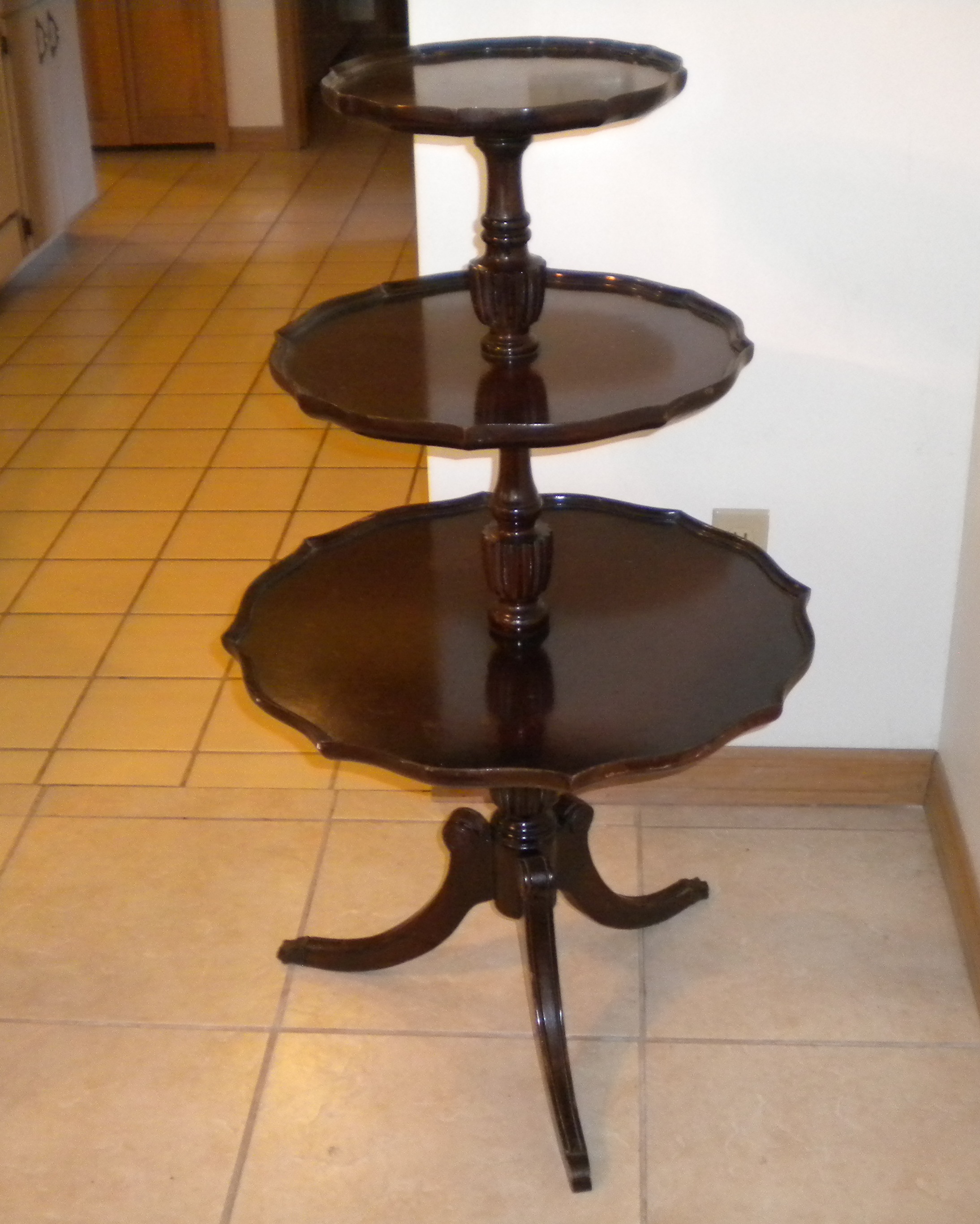 This 3 legged stand has been in the family for many years, and is still in excellent condition and it is sturdy, apart from a few tiny marks here and there. I think the tiers can be separated for packing. {not 100% sure}. I don't know exactly how old it or what its worth is.