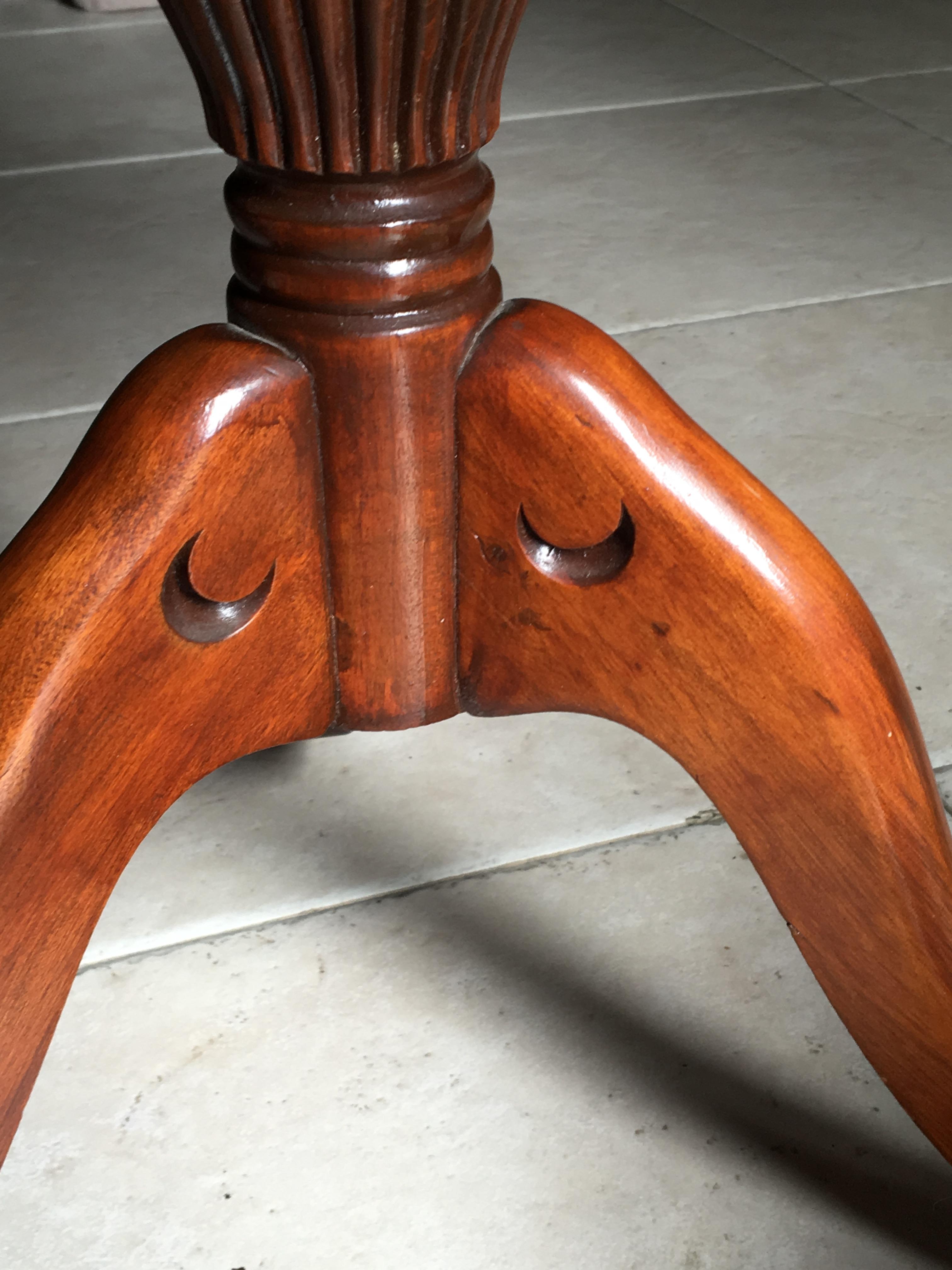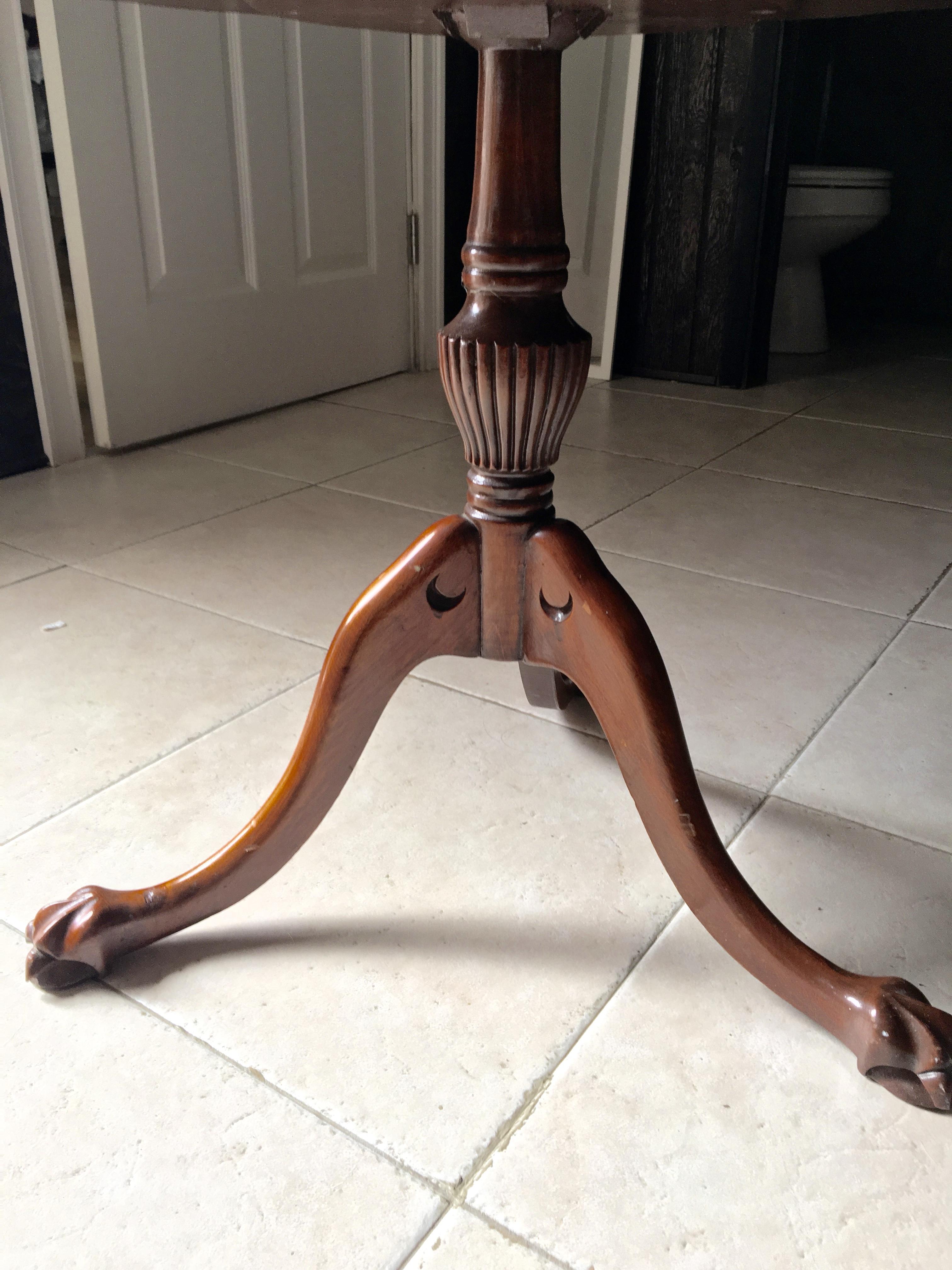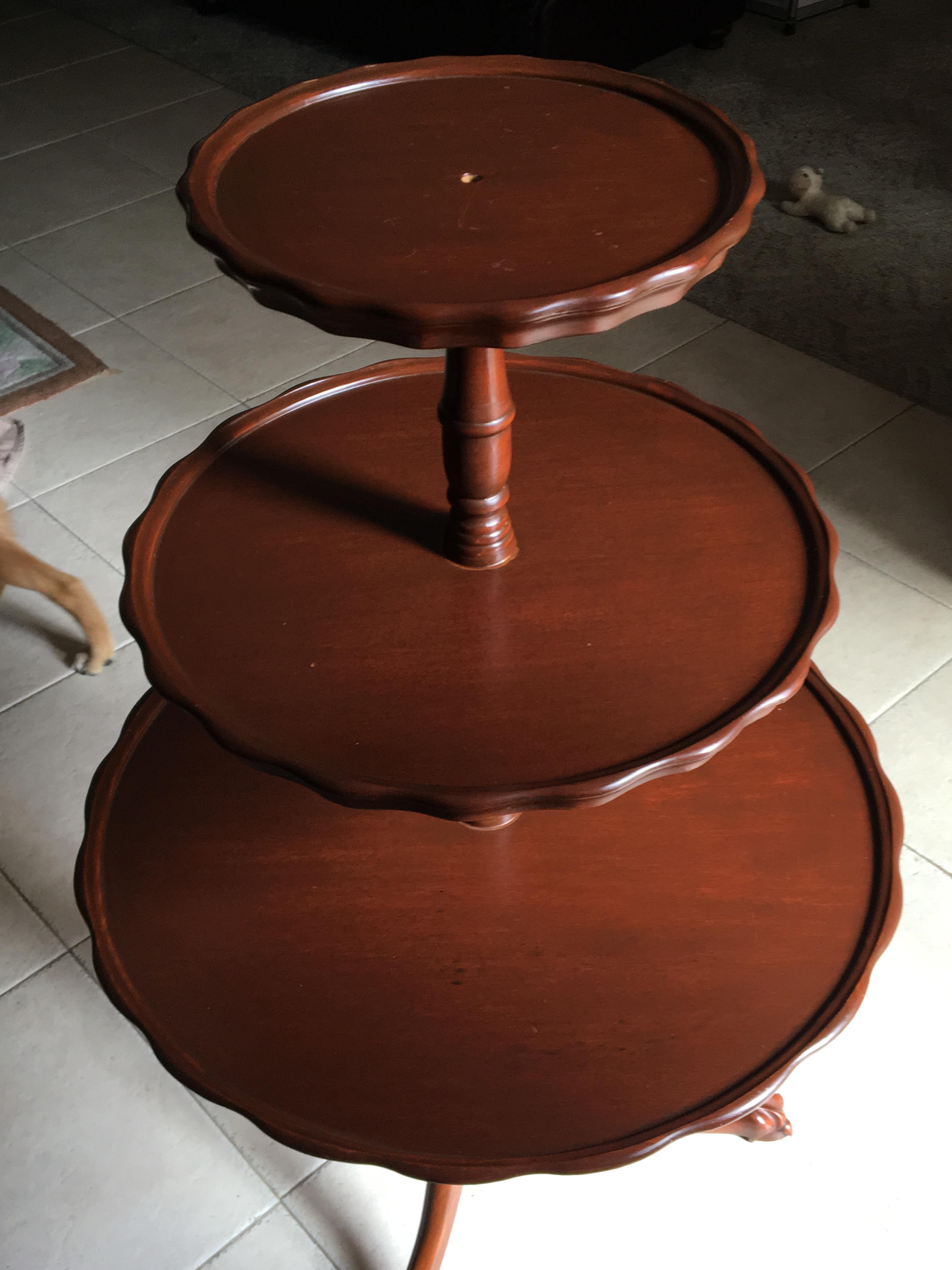 Mahogany, Ball and claw foot. Three tiered, has a carved half moon on legs. It measures 41" H, 24"Diameter. There is a small hole on top tier, I dont know if it is missing something. Thanks
