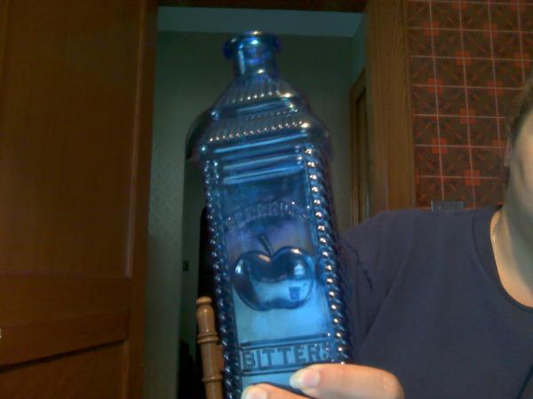 And finally, I have a blue Berring's Apple bitters bottle, also about 10". The Apple bitters bottle is square, it says Berring's Bitters. Apples are embossed on 3 of the 4 sides. The top is marked PHILa.