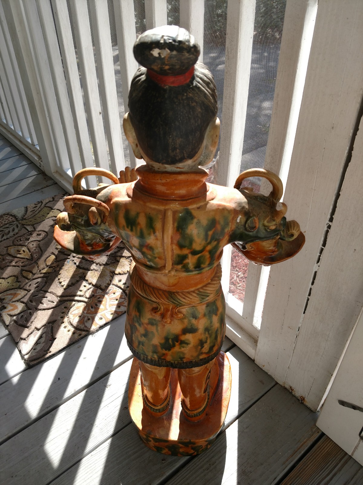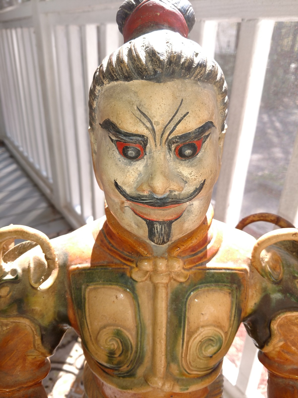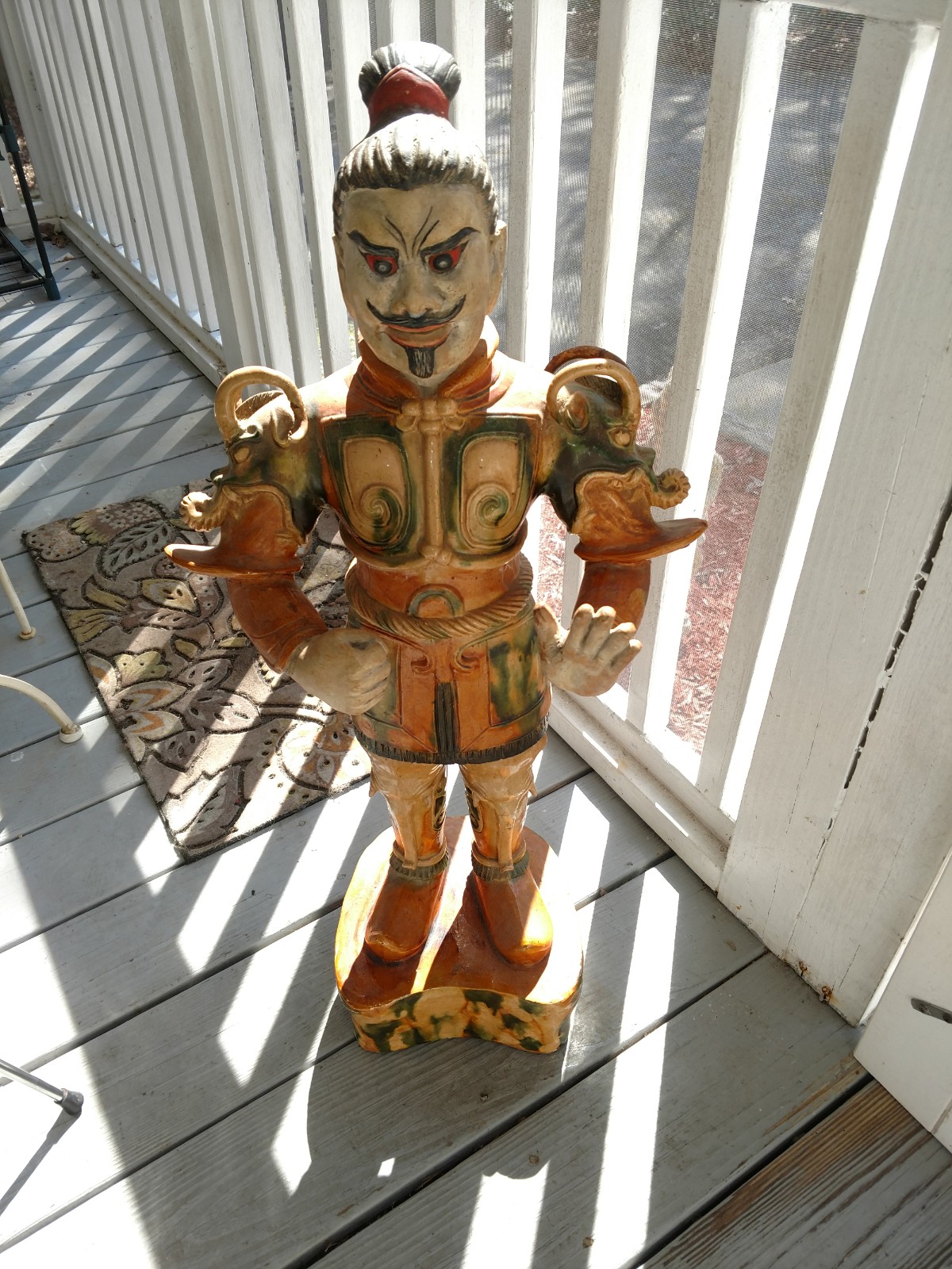 Just picked this up at an estate sale. It looks Mongolian to me, but I'm not sure. There is a piece of the shoulder armour broken but we have the pieces so it can be repaired. Otherwise it appears to be in great vintage condition. It's 31" tall. I called Wildwood Imports and gave them the number. They said it has to be about 45 years old because that would have been one of their first pieces like that and they are 50 years old, but sold lamps for the first couple years. I have no idea how old it was before they imported it, so still doing my research! Anyone who recognizes this piece and has some ideas, let me know!