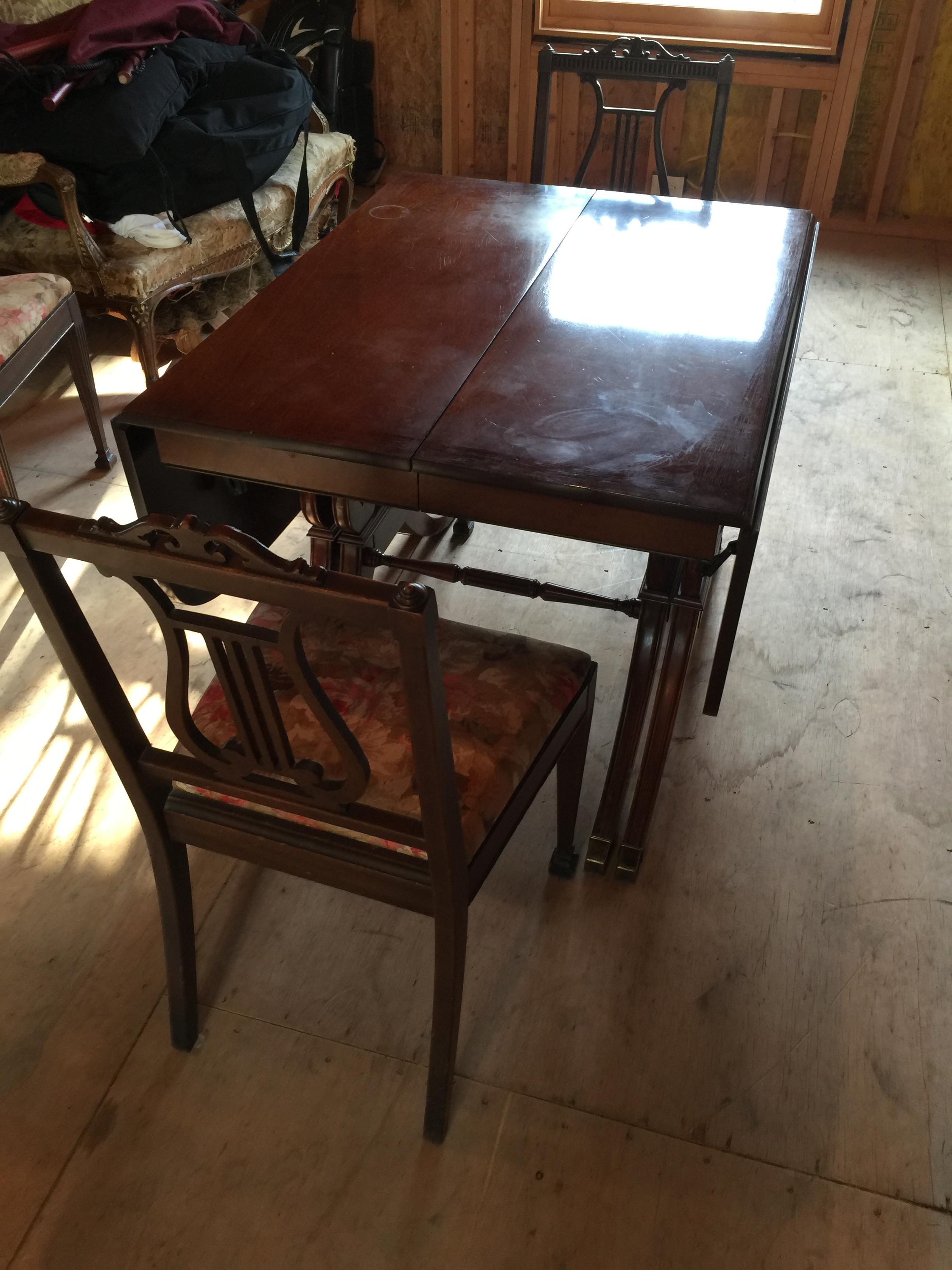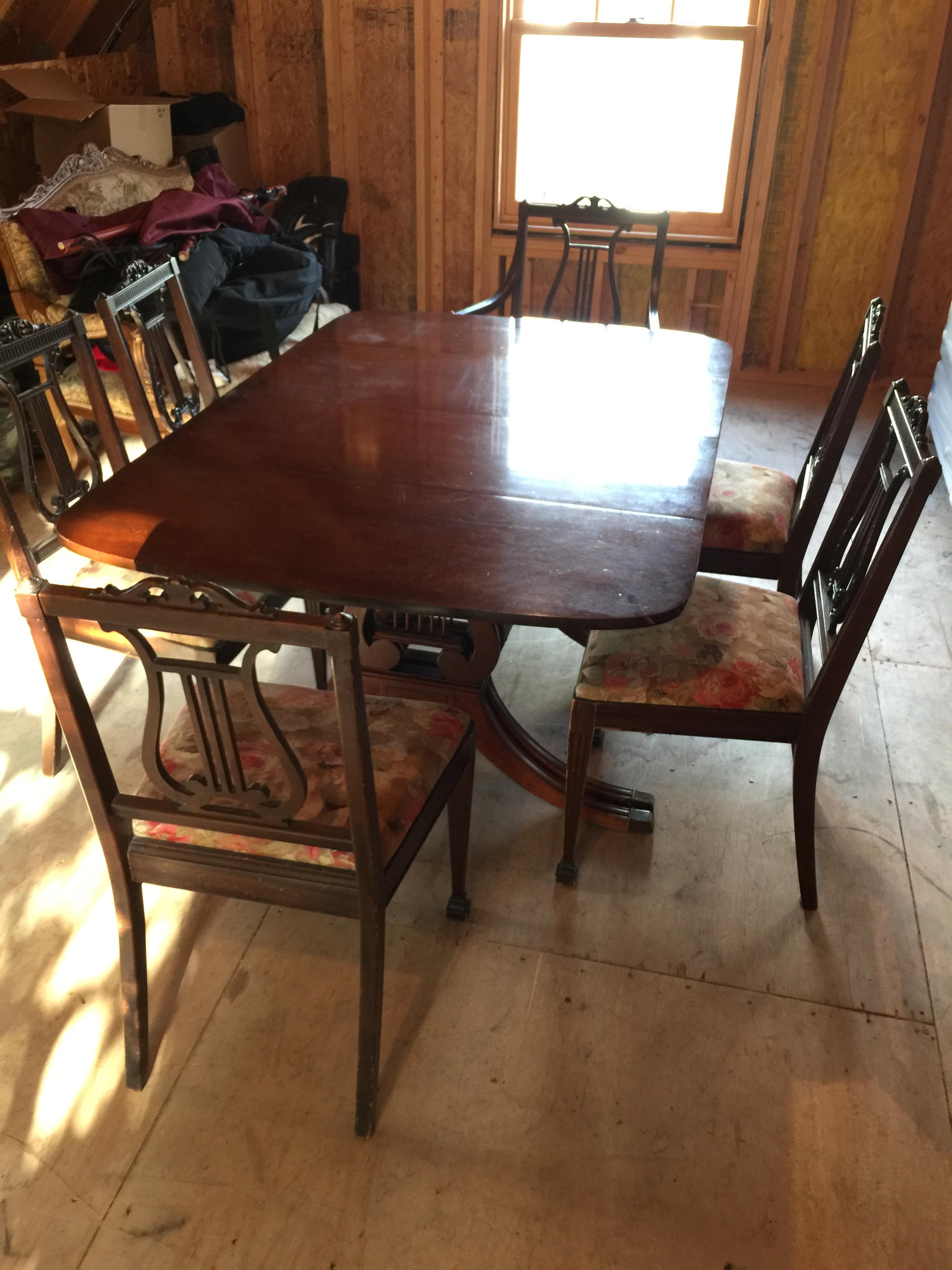 355-3B New Travis Court Collection by Drexel Dining Table Set with 5 chairs plus 1 head chair. Has three leaves and at greatest length is 100" x 42" and then reduces to 88" x 42", then to 76" x 42" then 64" x 42", then to 34" x 42" at smallest. Has all original pads to put under tablecloth. Needs some refinishing work due to scratches and other minor damage but otherwise in excellent condition.