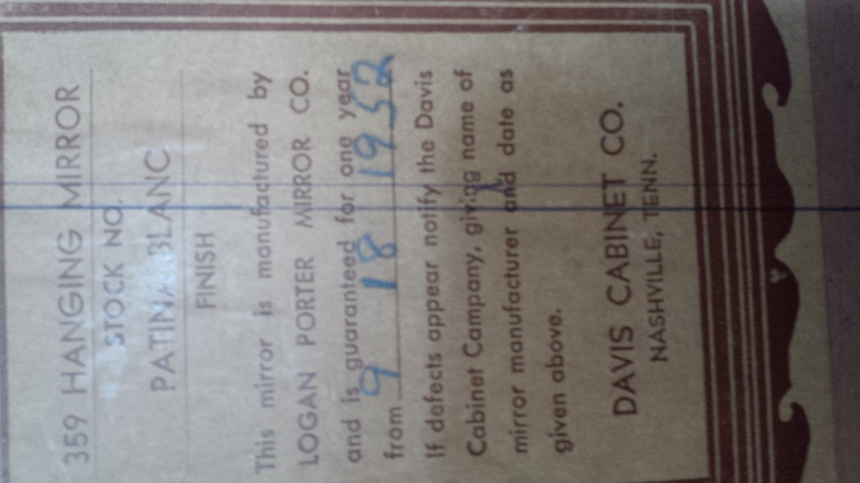 I have a Davis Cabinet CO. mirror made by Logan Porter Mirror Co. Stock number is 359 Hanging Mirror. It was made 9-18-1952. Looking for an appraisal. Photo included.