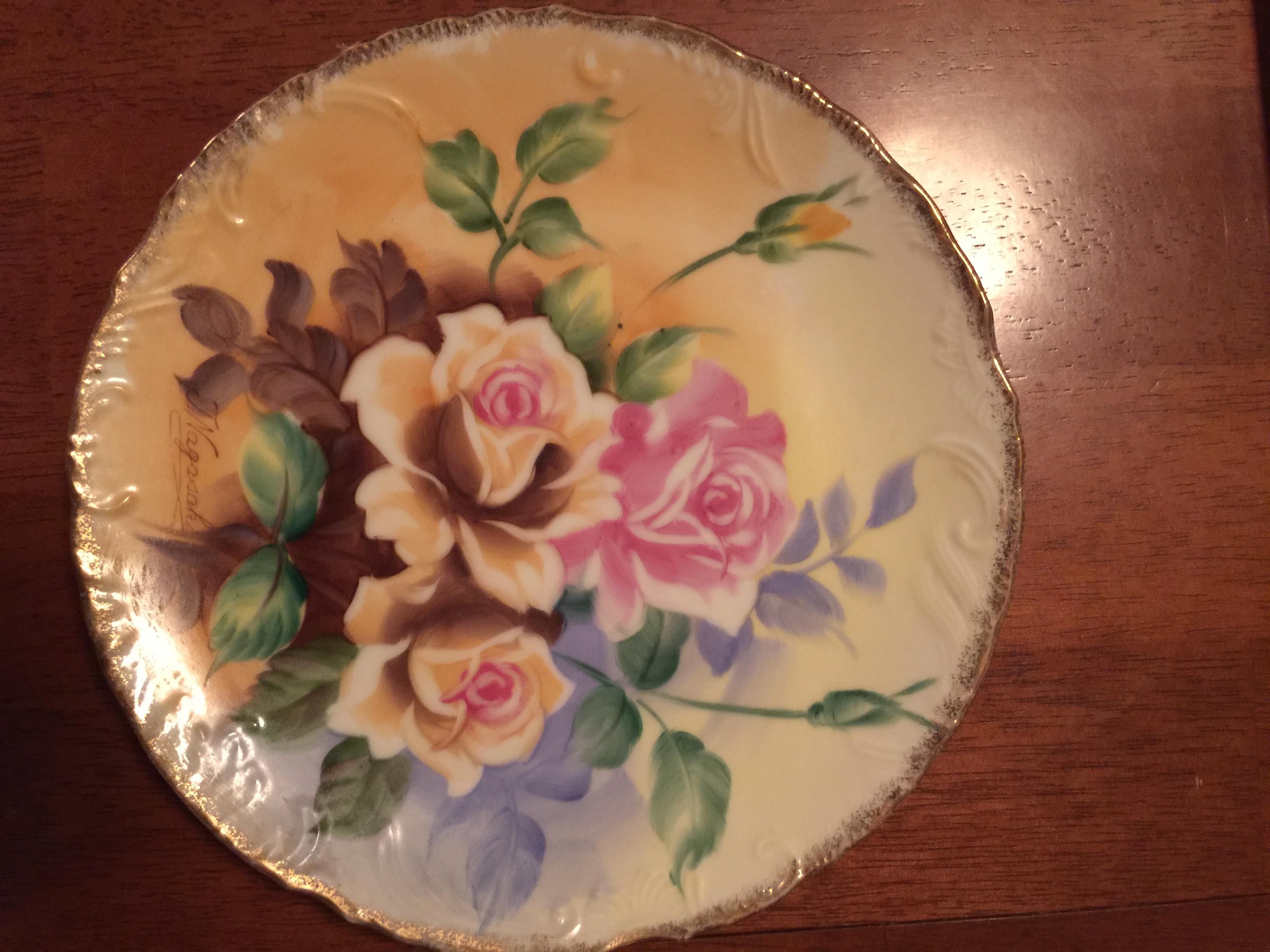 1. Light pink & dark pink Roses on yellow & blue background. Brighter colors. 8" signed by T. Shibuta?. Scallop- ish edge, gold rim.