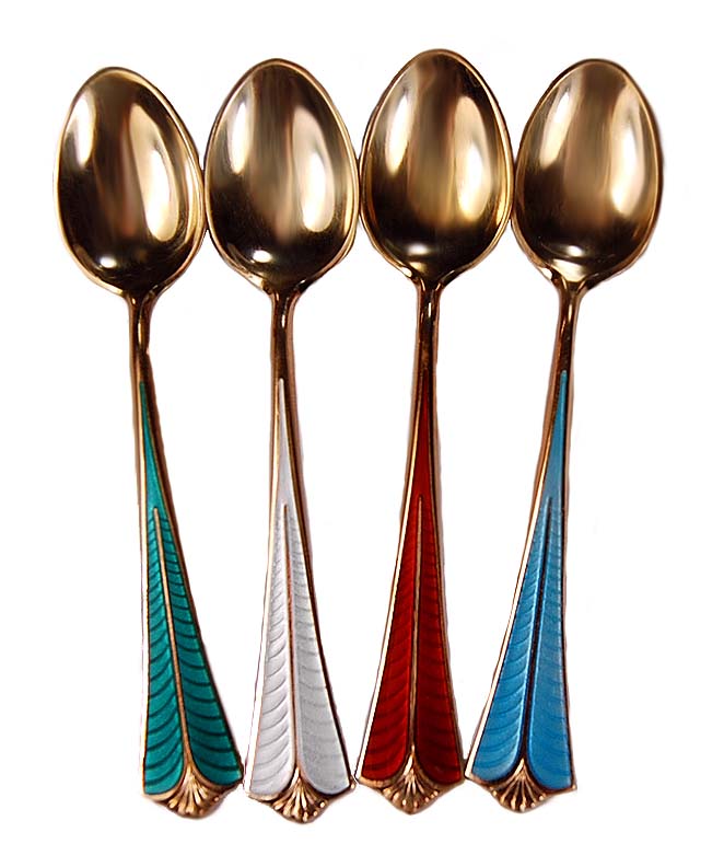 very rare to find unusual antique Sterling silver 925 marked DA for David Andersen, hallmarked artist Bjorn Sigurd Ostern brilliant multicolored enamel spoons with burnished gold wash surface, the colors are teal, turquoise, garnet red and silver white, with a gold washed top and in excellent condition!