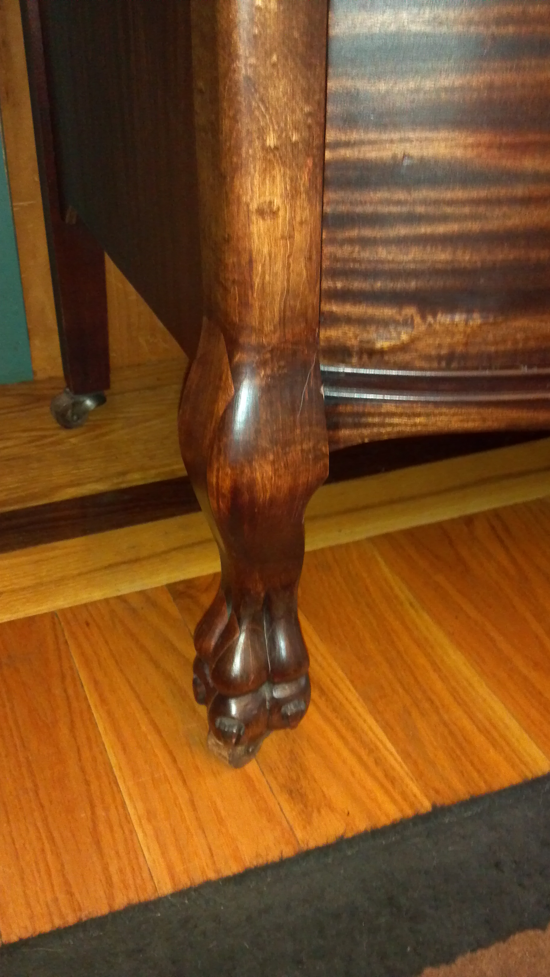 Solid wood dresser with an elegant oval mirror. Very well made, great condition. Original silvered mirror, beveled. Dove tail joints. Claw foot legs in front. Glass pulls.