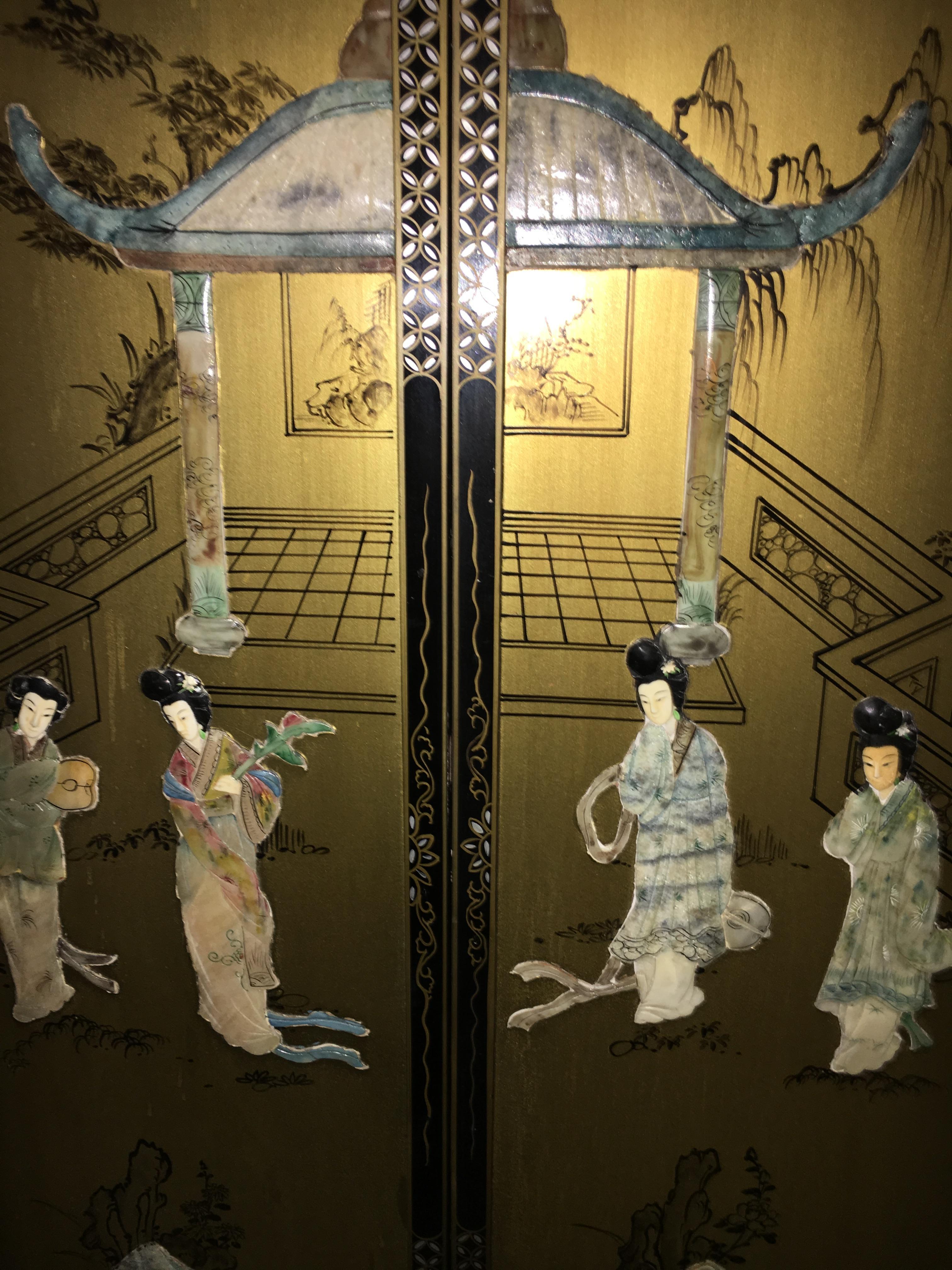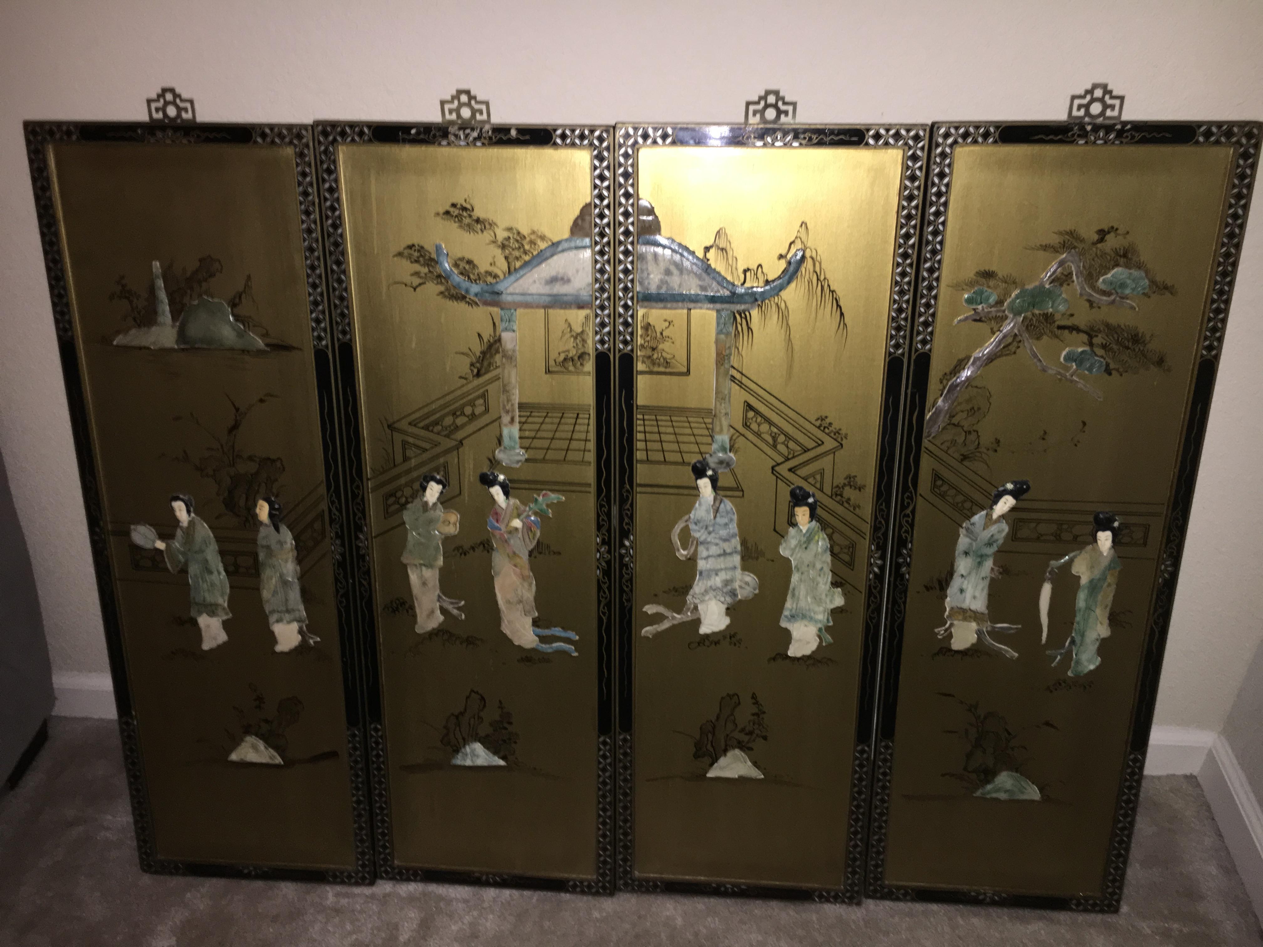 Purchased in the San Francisco, Ca area in the ‘70’s. There are 4 panels 36” tall and about 11” wide. Hand carved jade and not sure what else. Please see photos. Thank you.