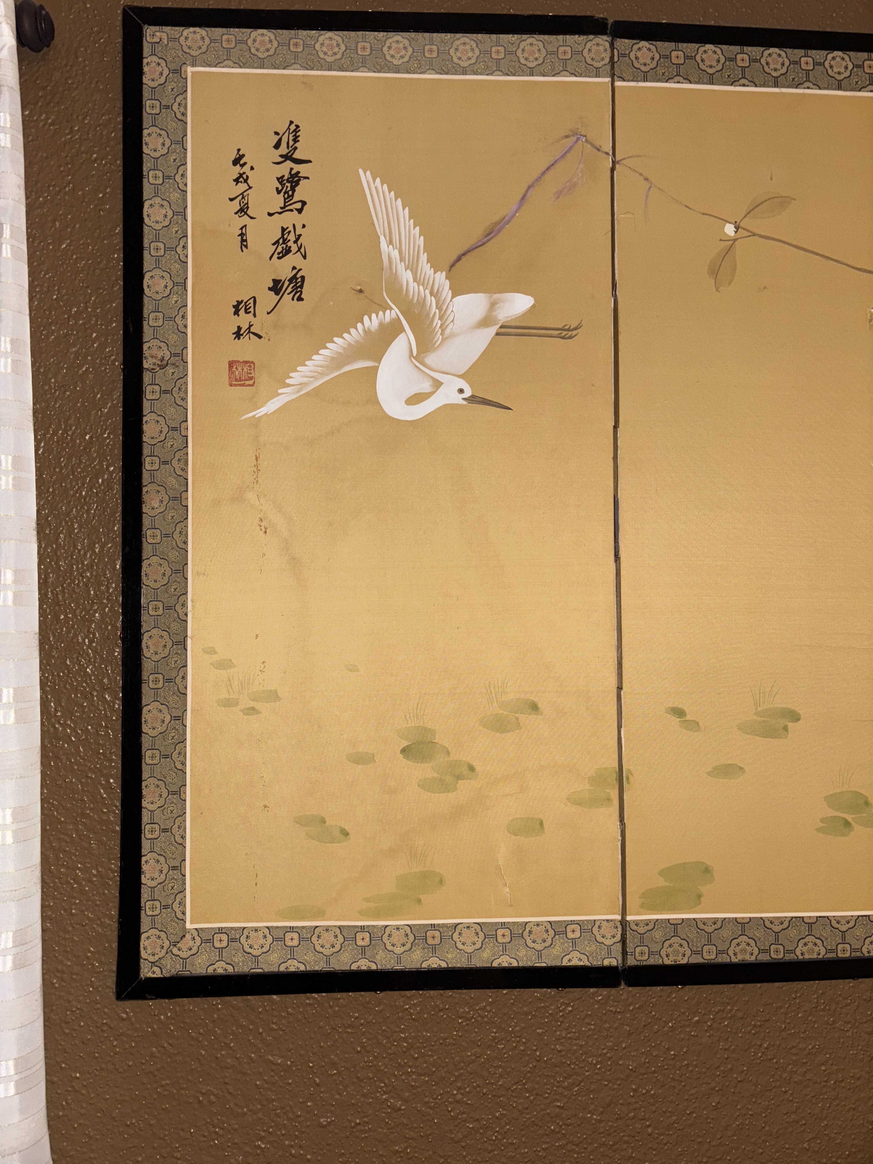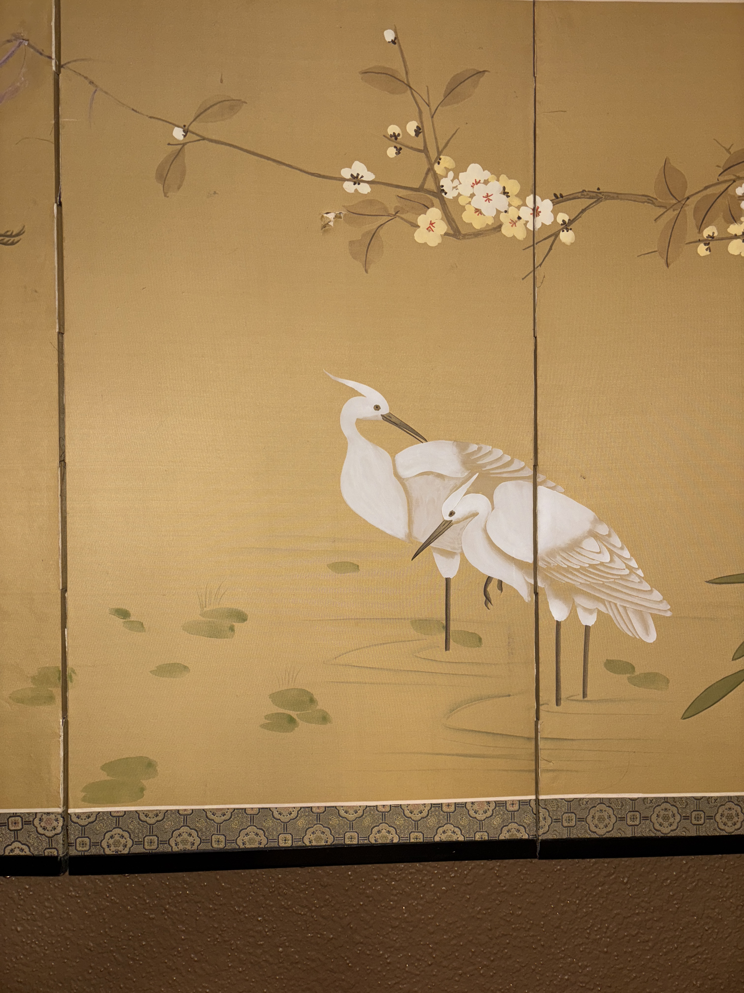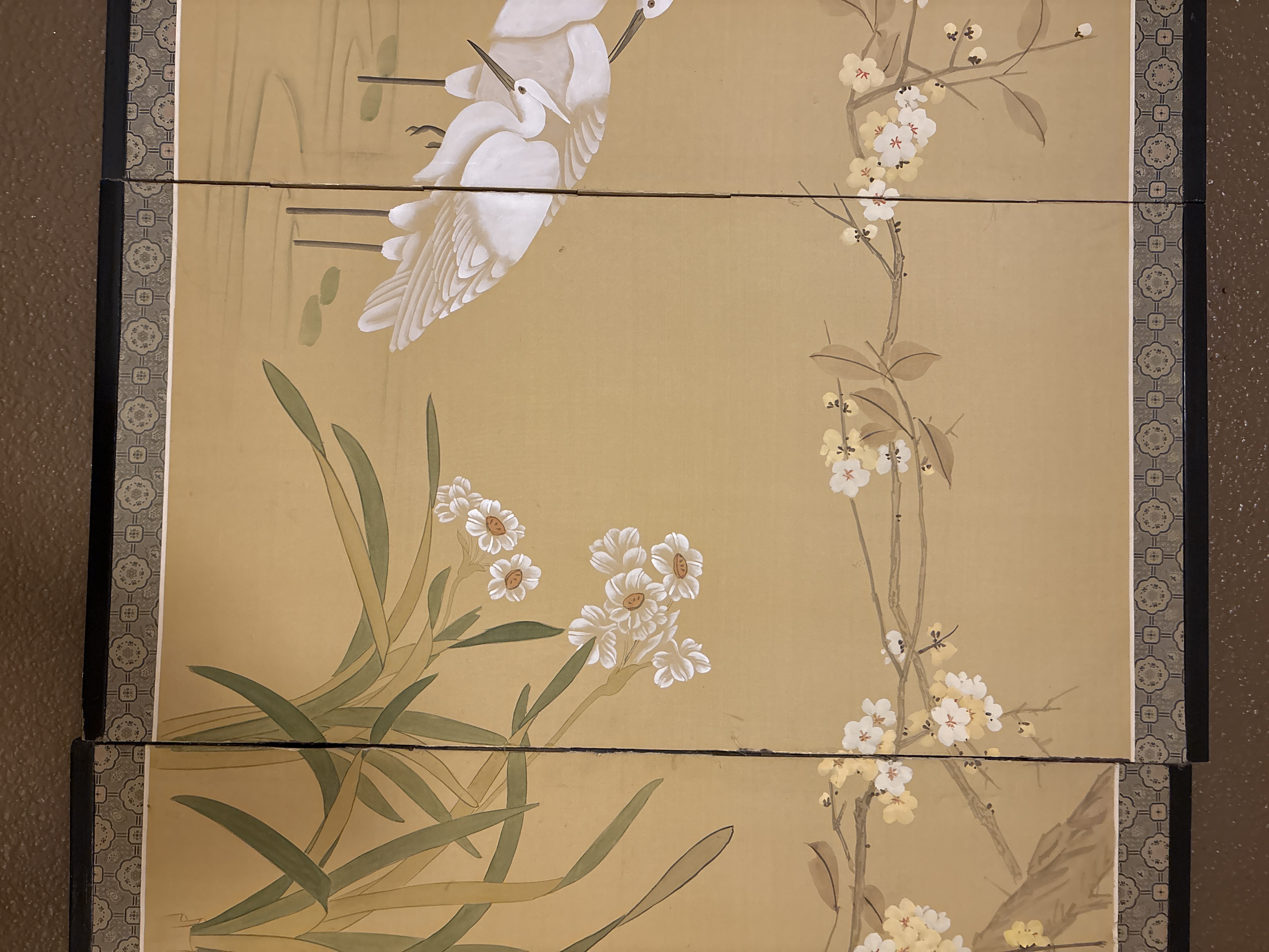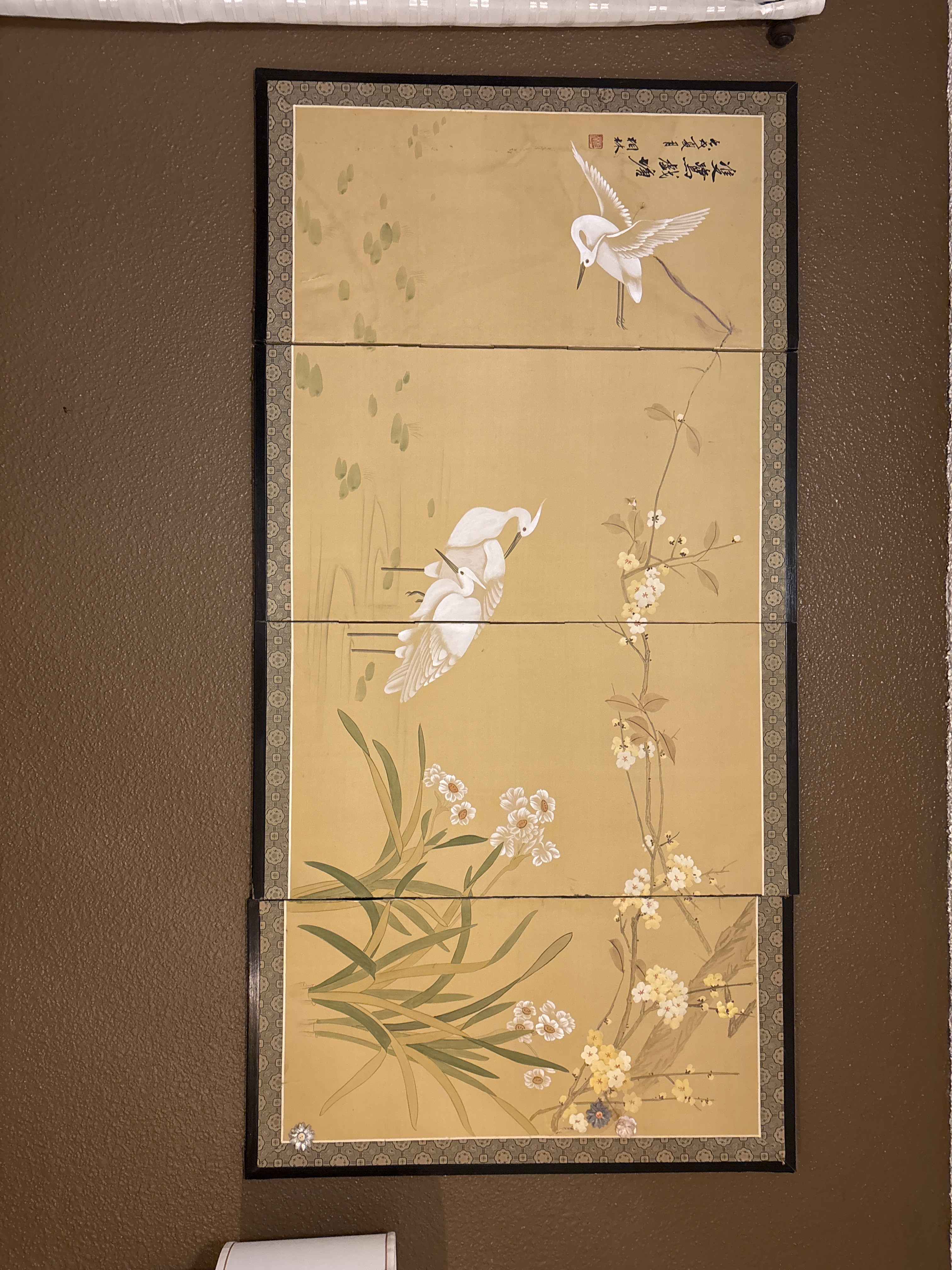 Physical Description: This is a four-panel Japanese hand-painted screen, featuring intricate designs of birds and floral motifs. The overall dimensions are approximately 79 inches wide and 39 inches tall. The screen is constructed from paper and wood, with a gold and olive green color palette enhancing its aesthetic appeal. The panels are adorned with beautiful depictions of birds, particularly egrets, amidst a backdrop of delicate flowers and lily pads.