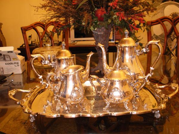 FB Rogers Georgetown teapot, coffee pot, sugar bowl with lid, and creamer with large waiter tray excellent condition