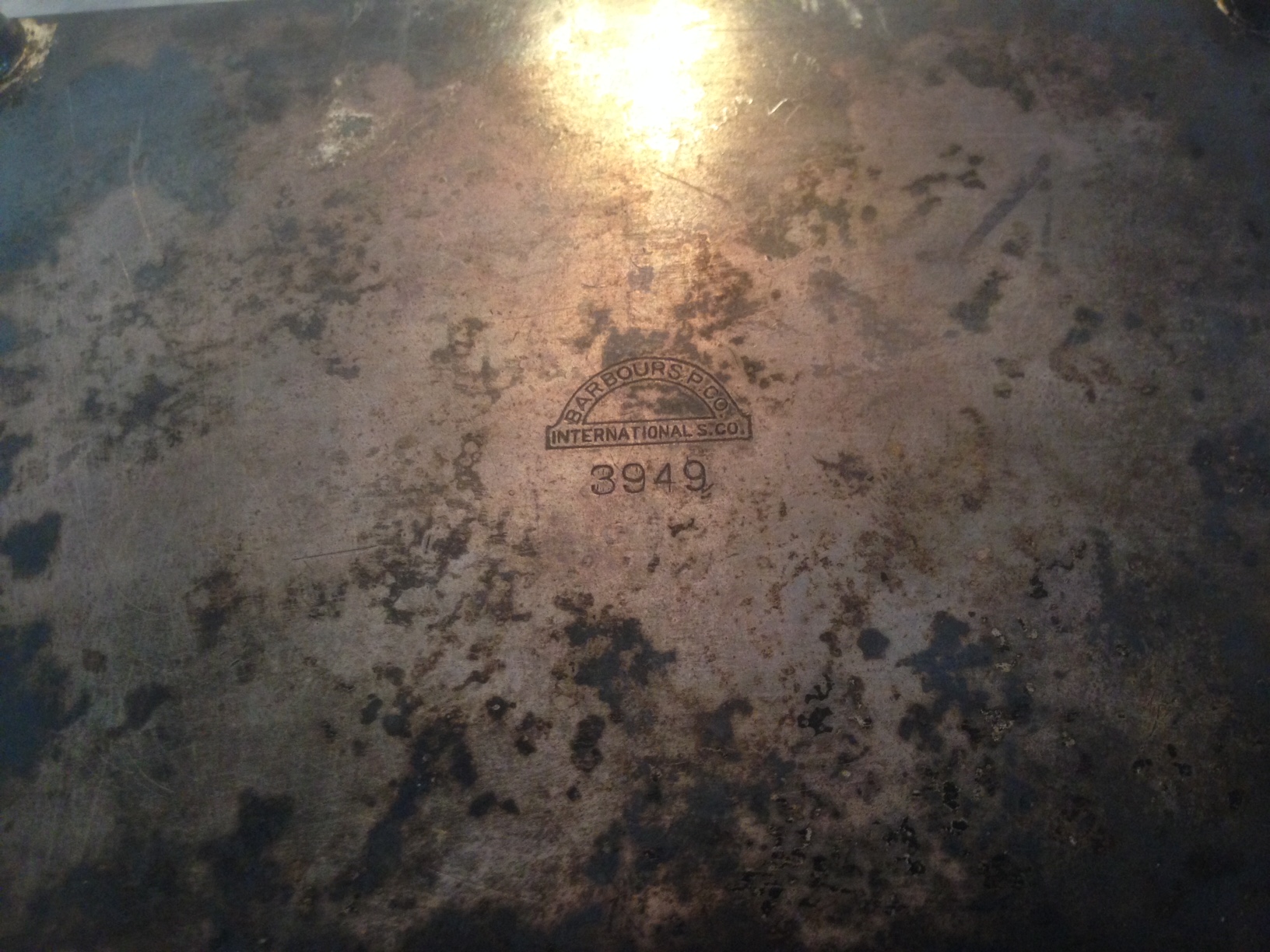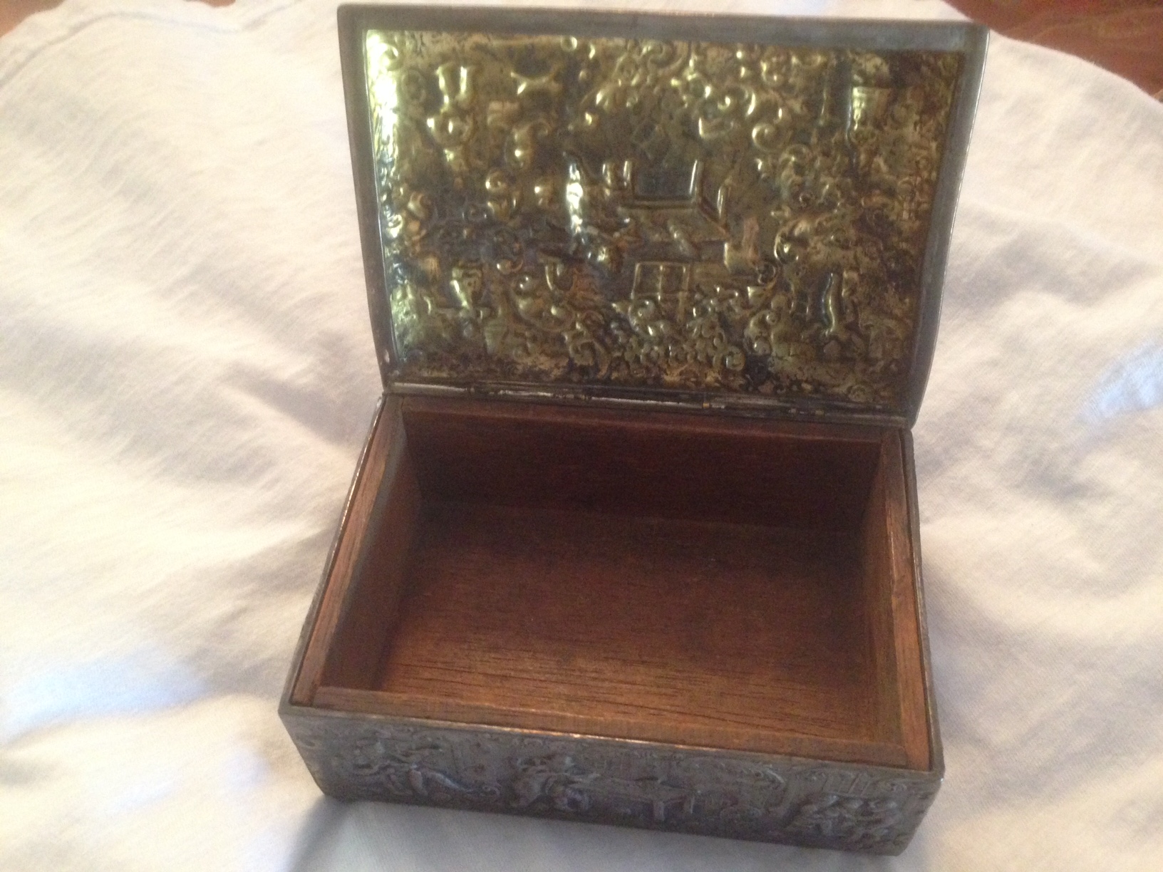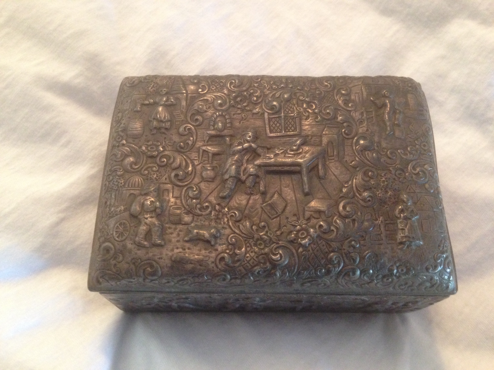 Beautiful intricate silver box with many themes carved out, looks like it depicts a village of some sort (silversmith working at a table 9appears twice on box), Boy walking with dog, woman washing something in a barrel, man dancing,2 men sitting and drinking, husband and wife arguing with houses in the background, a couple dancing, a woman spinning yarn, boy playing the violin). The bottom of the box is bare except for the imprint of the trademark logo- in the shape of a half circle- on the arc on top it says Barbour S.P. Co. and the line underneath the arc says International S. Co. Below that 3949 is imprinted as well. The outside is in good condition although tarnished some. Inside however looks more used. Inside is a wooden liner, apparently to keep cigarettes fresh?