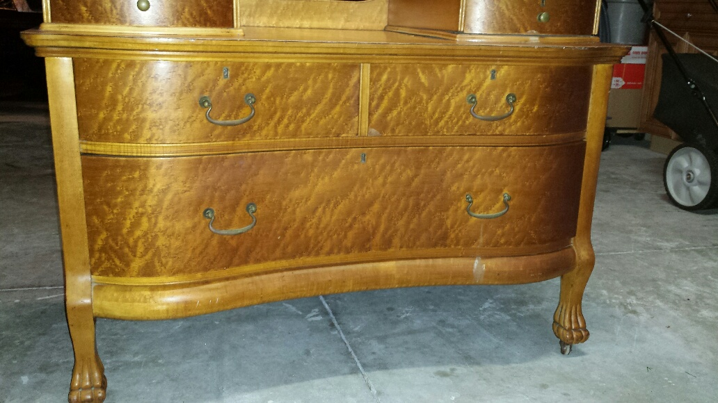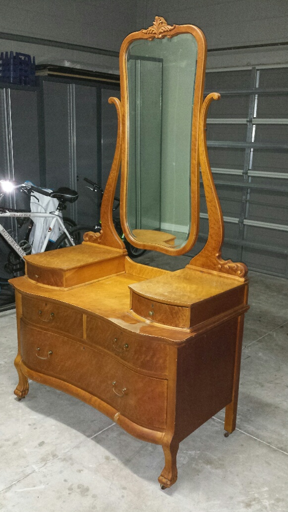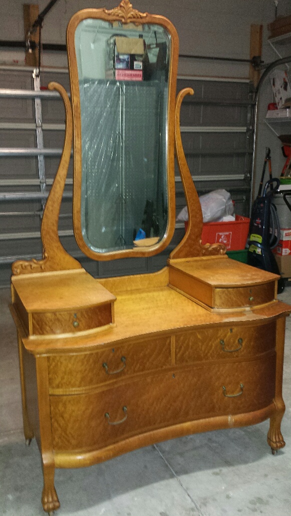 5 drawer dresser with mirror. Wood construction with dovetail joint on drawers. Original hardware.