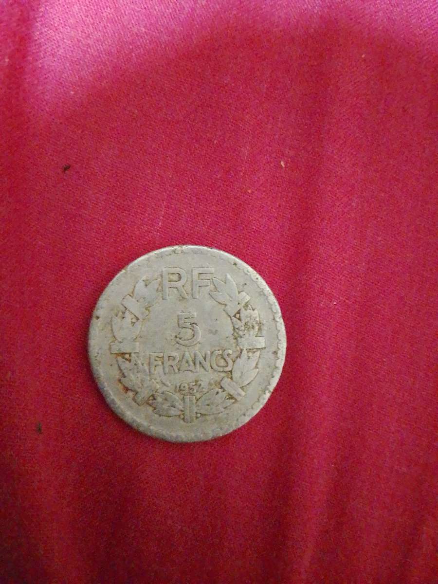 Physical Description: This is a 5 Francs coin from France, minted in 1954. The coin features a diameter of approximately 25 mm and is made of a nickel-brass alloy. The obverse side displays a profile of Marianne, the national symbol of France, with the inscription "RÉPUBLIQUE FRANÇAISE". The reverse side features the denomination "5 FRANCS" surrounded by a laurel wreath, with the year of minting, "1954", at the bottom.
