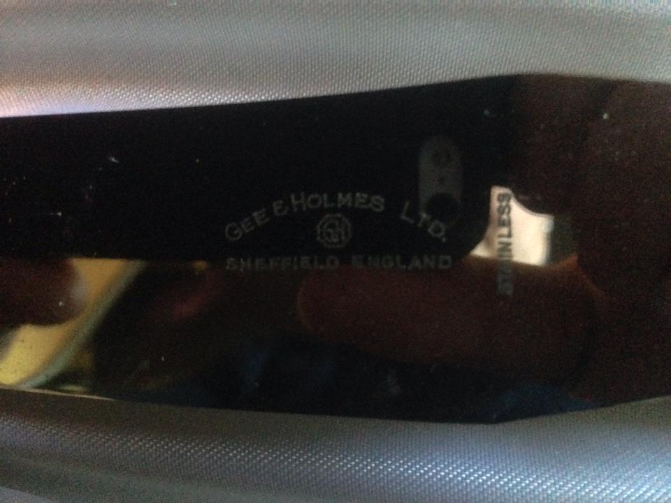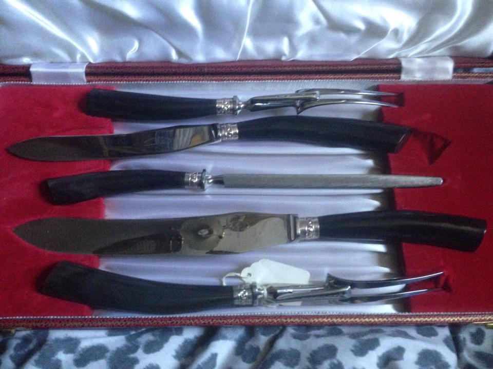 Gee and Holmes 5 piece stainless steel carving set, 2 knives 2 meat forks and 1 sharpening tool all set in a Red leather box