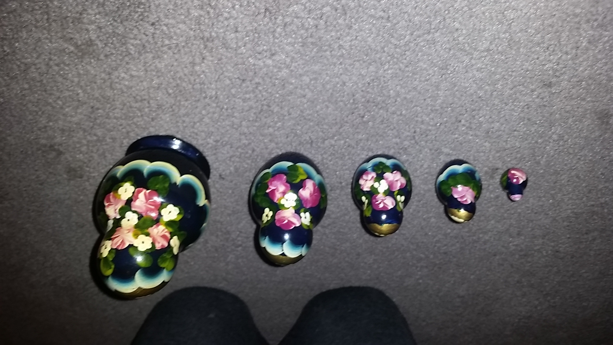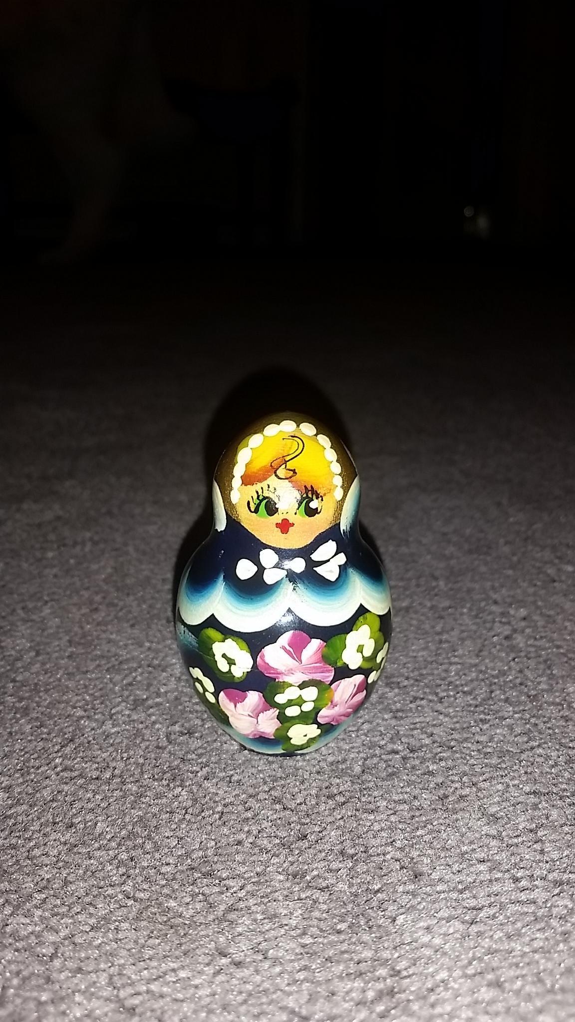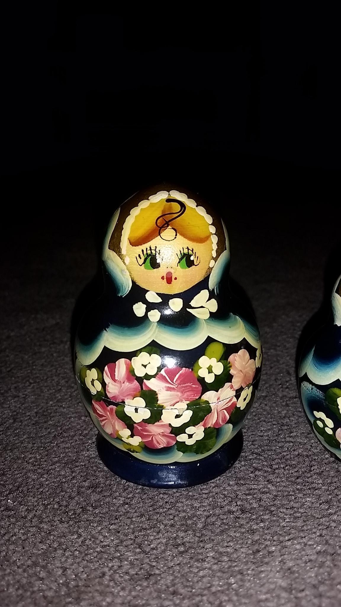 I found this doll at a local yard sale. From what I can tell, all pieces are there. It's hand painted with a floral pattern, has a beveled bottom, the wood isn't discolored, and has minimal chipping. However there are a few noticeable...mistakes. For example, the first two outer dolls have two strands of black hair curling in the middle of the face, the second largest doll also has somewhat of a lazy eye, one of the dolls has a pink dot (the same color as the flowers) in a place where there are no flowers, the smaller the dolls get, the sloppier/rushed the details get, the lips on the first doll appear to be unfinished, and the bottom of each piece has a small square shaped hole in the bottom. I haven't been able to find anything like them online and I would love to find a rough estimate on what they may be worth.