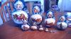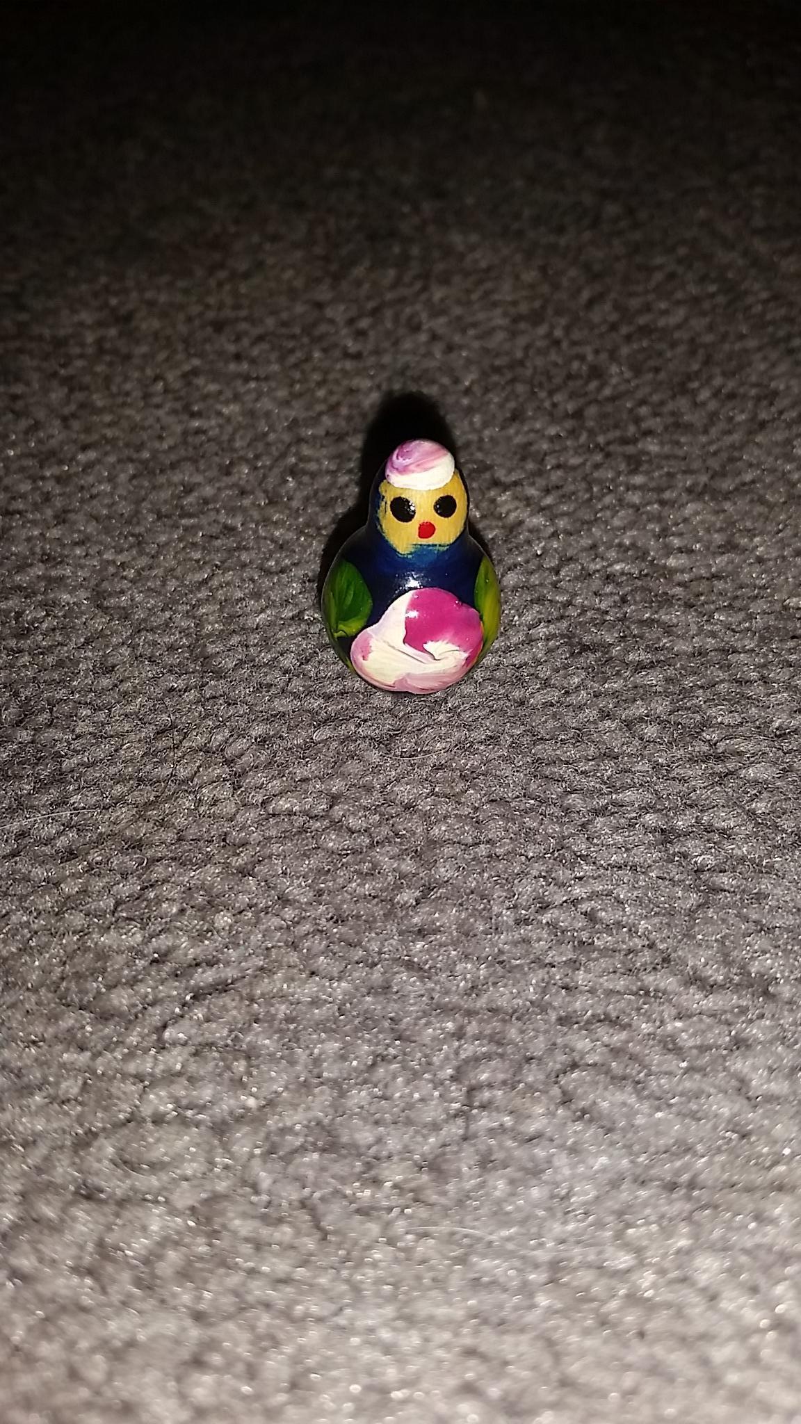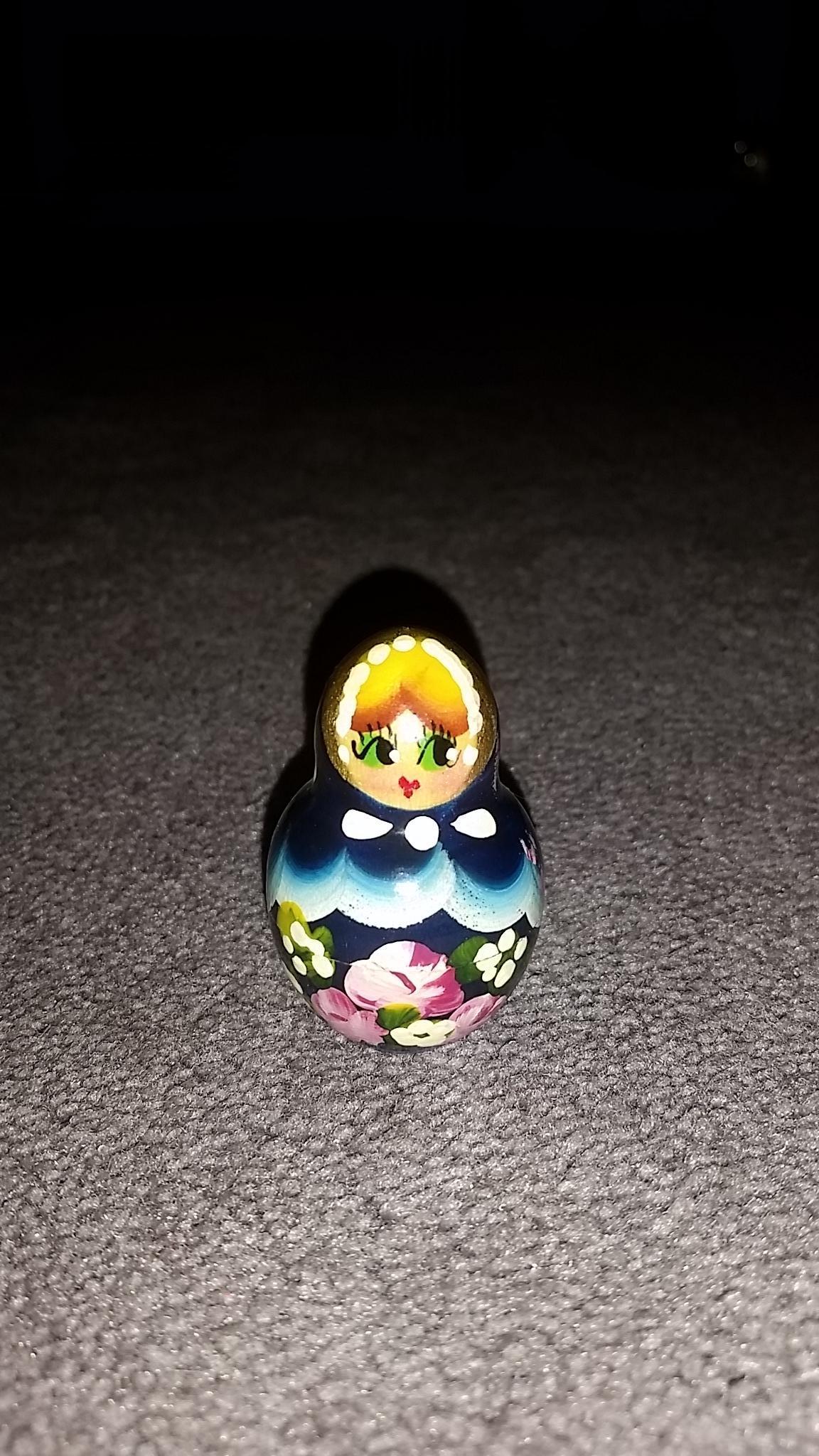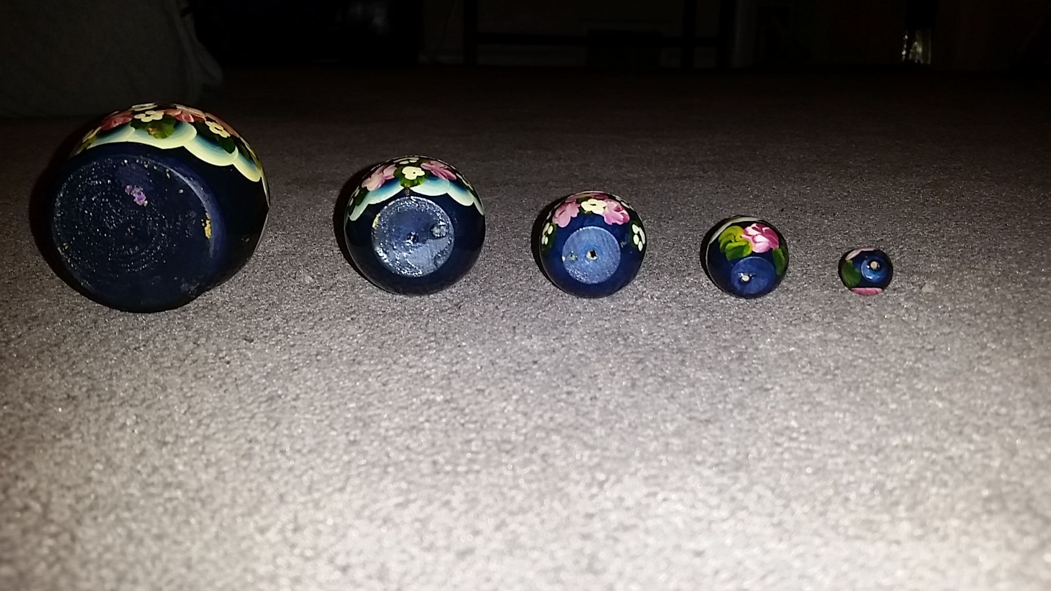 I found this doll at a local yard sale. From what I can tell, all pieces are there. It's hand painted with a floral pattern, has a beveled bottom, the wood isn't discolored, and has minimal chipping. However there are a few noticeable...mistakes. For example, the first two outer dolls have two strands of black hair curling in the middle of the face, the second largest doll also has somewhat of a lazy eye, one of the dolls has a pink dot (the same color as the flowers) in a place where there are no flowers, the smaller the dolls get, the sloppier/rushed the details get, the lips on the first doll appear to be unfinished, and the bottom of each piece has a small square shaped hole in the bottom. I haven't been able to find anything like them online and I would love to find a rough estimate on what they may be worth.