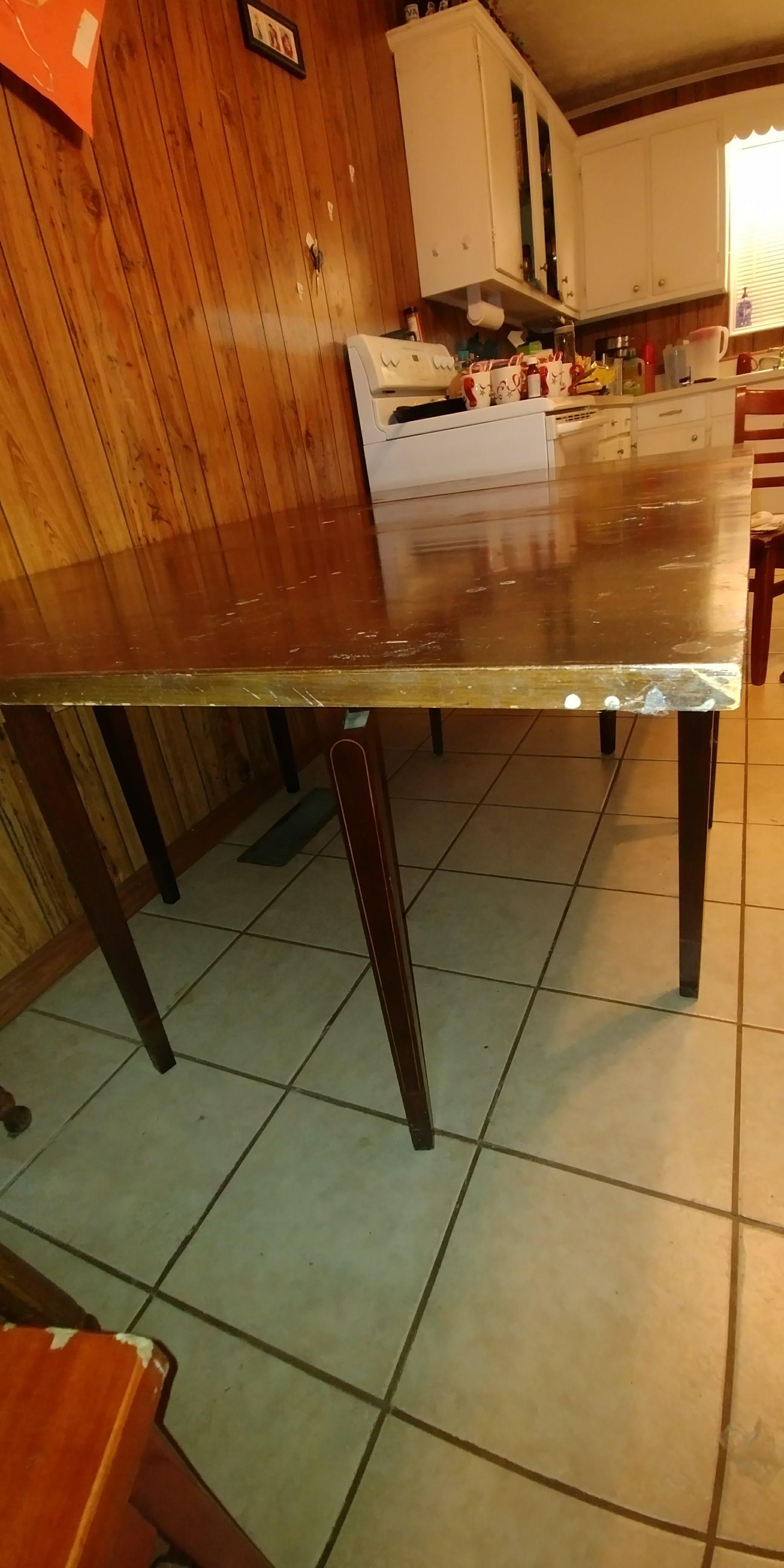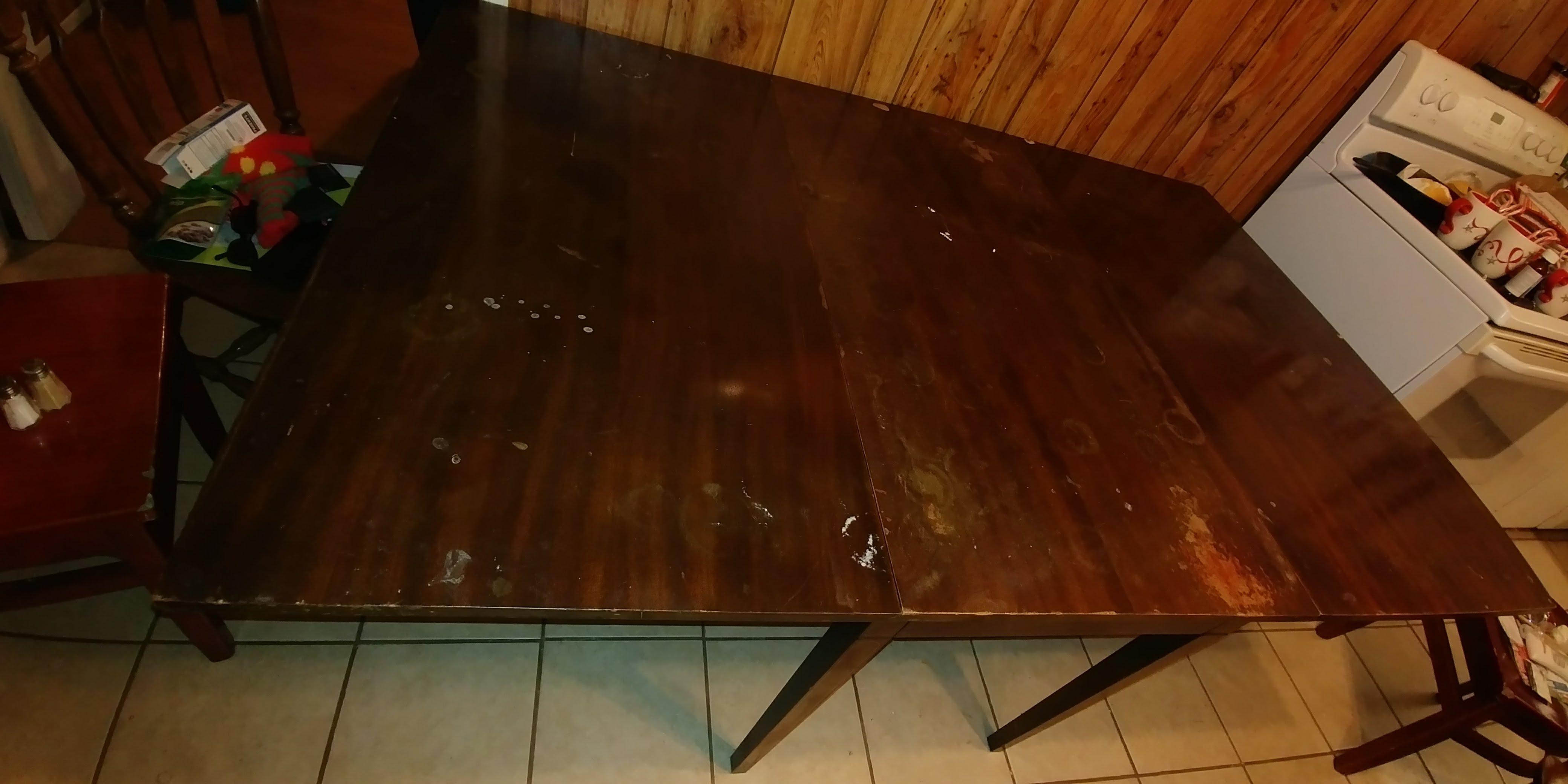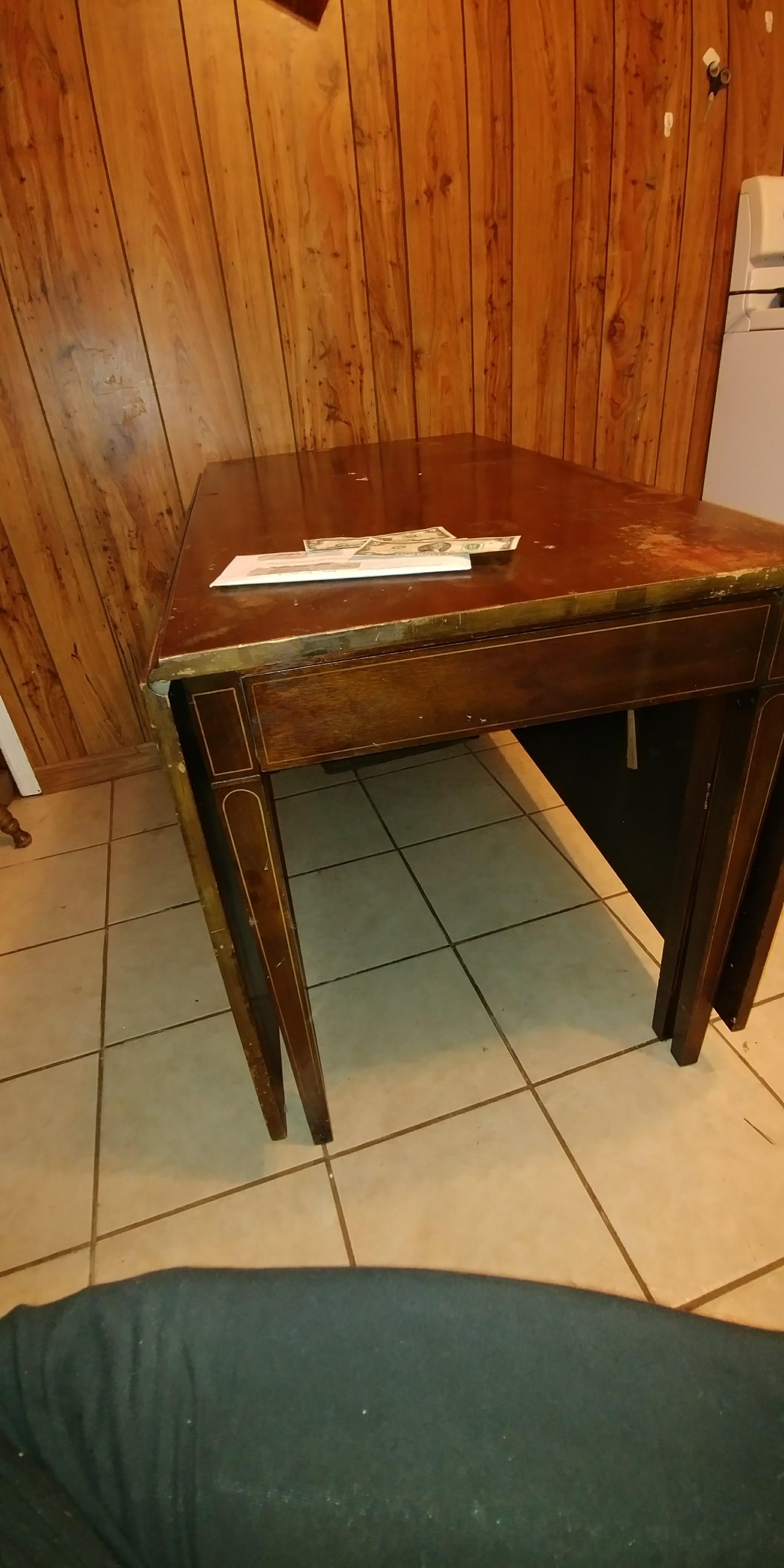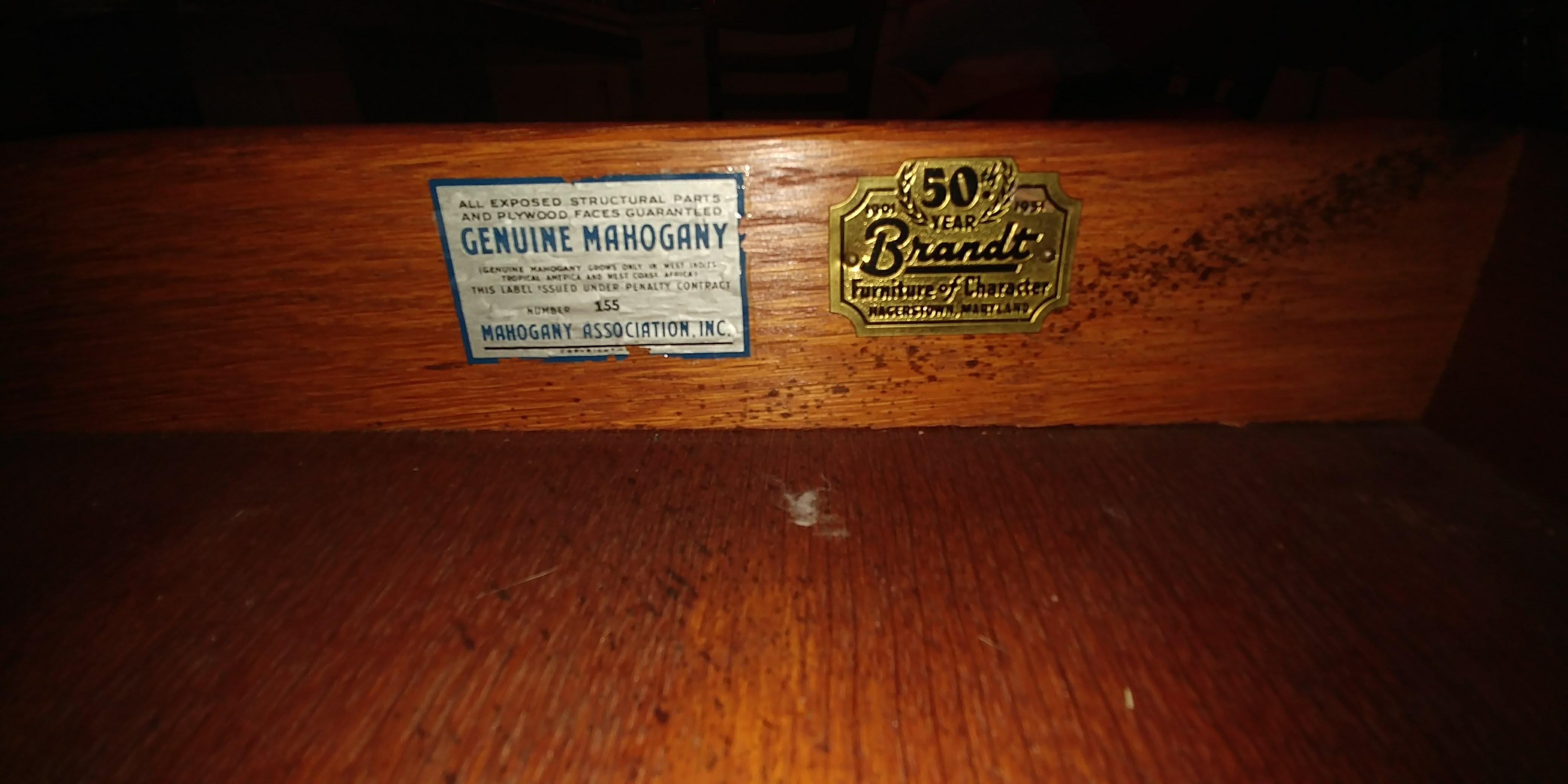 Drop leaf, 4 swing out legs, middle drawer with two labels, one saying Genuine mahogany, and the other saying 50th anniversary Brandt Furniture of character.