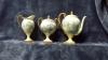 True tone, princess china, bridal wreath, gold trimmed, white flowers with foilage, 8 dinner plates, 8 small plates,8 bread and butter plates, 8 soup bowls w/ rim, 8 fruit bowls, 8 saucers and coffee cups with feet