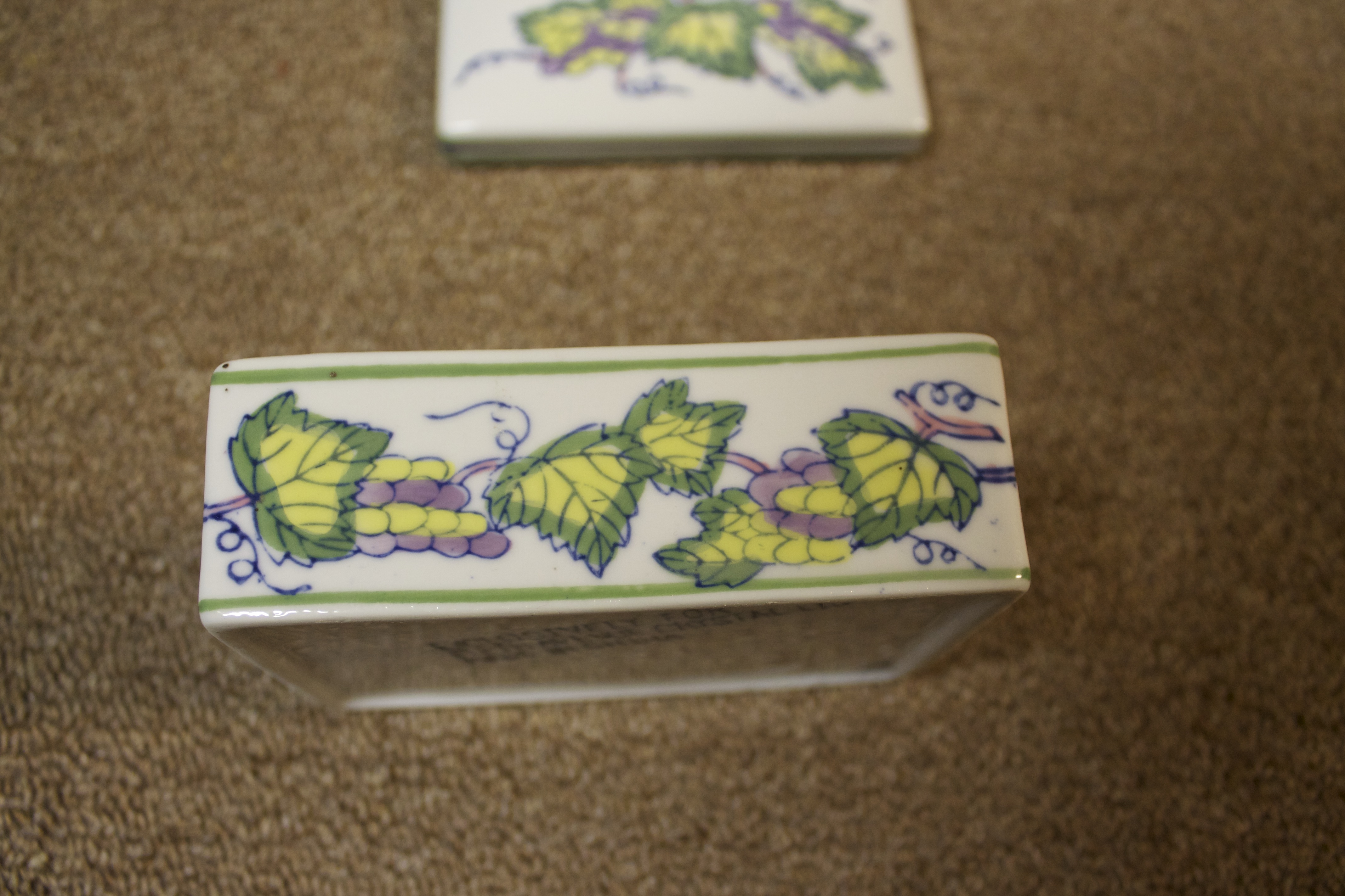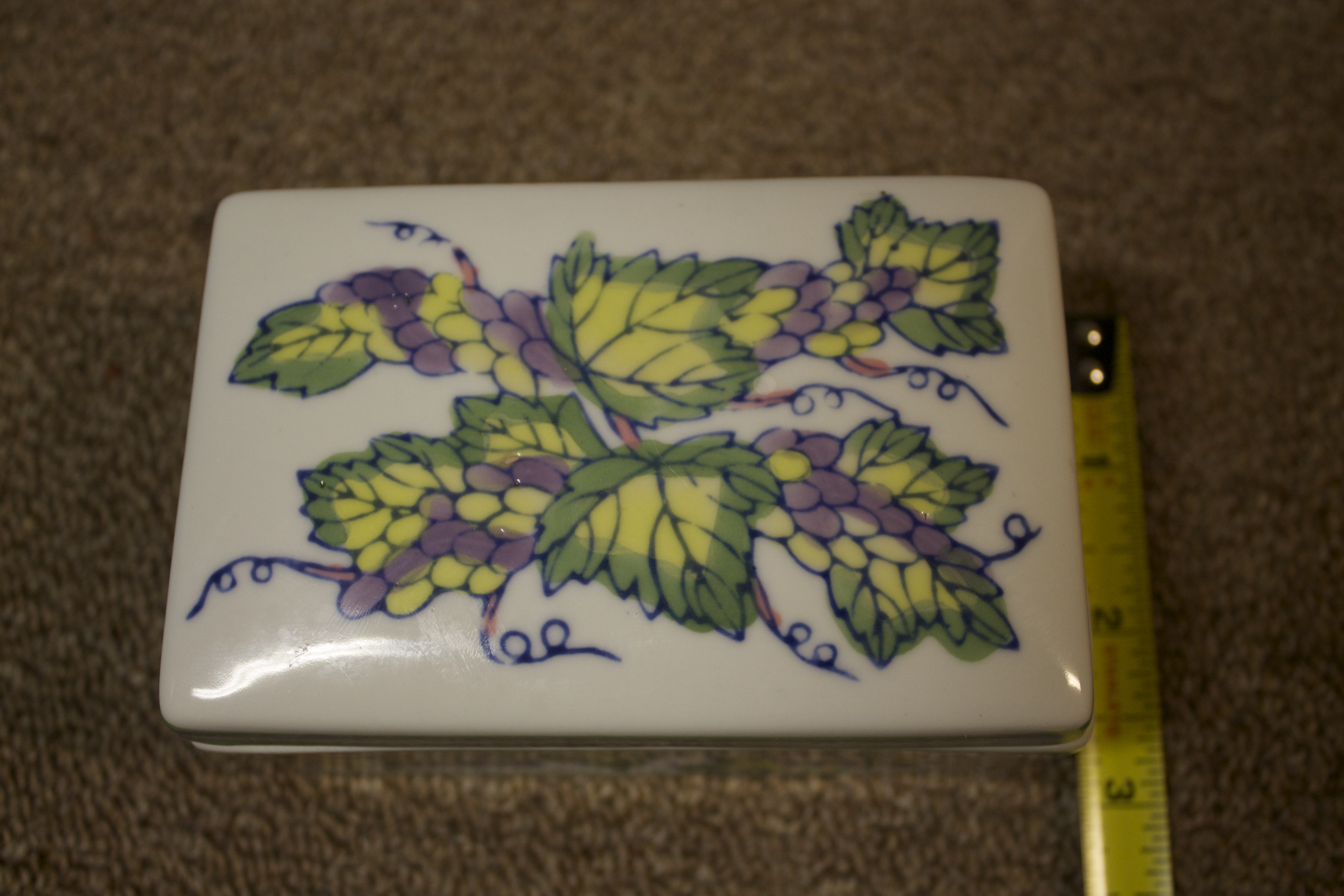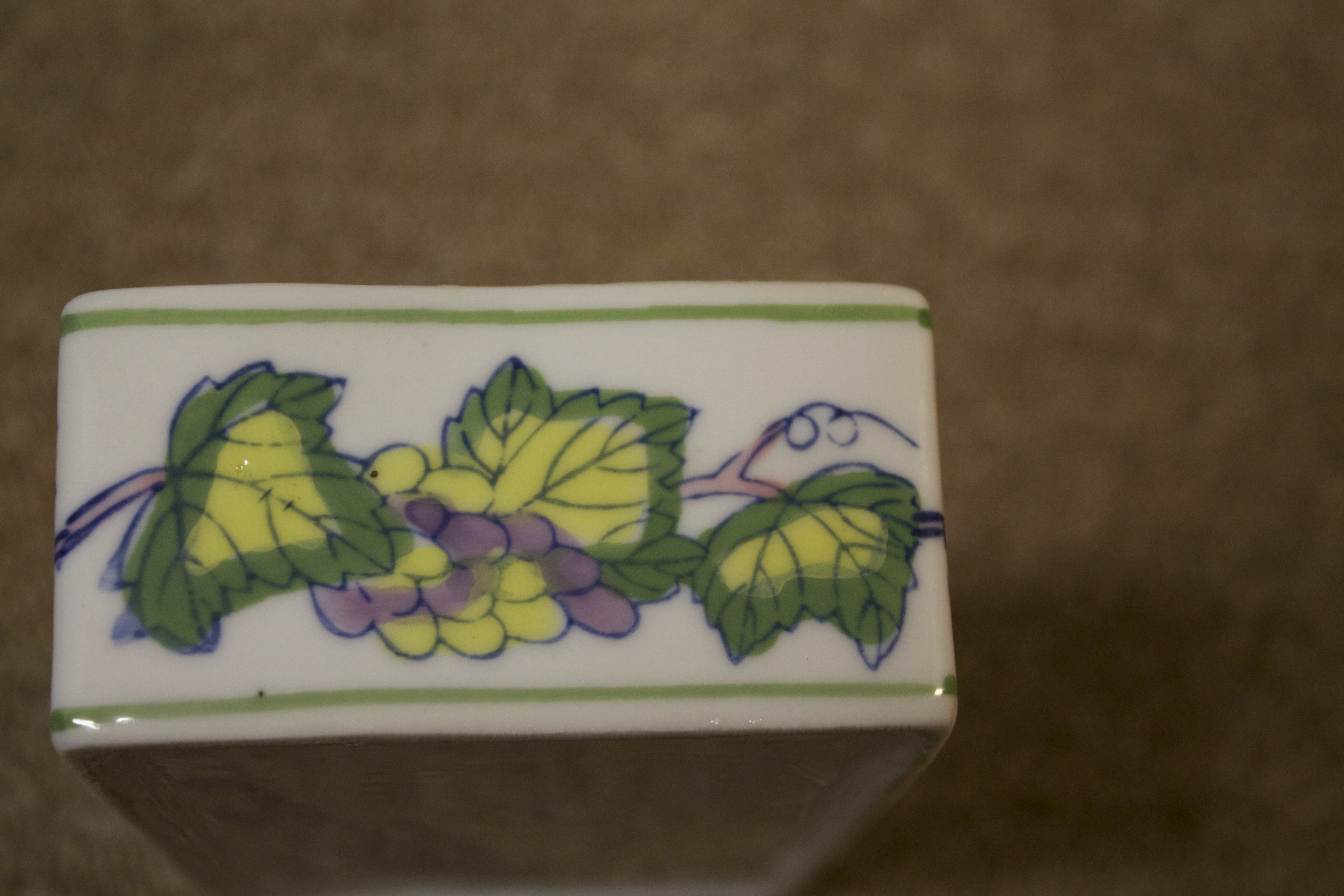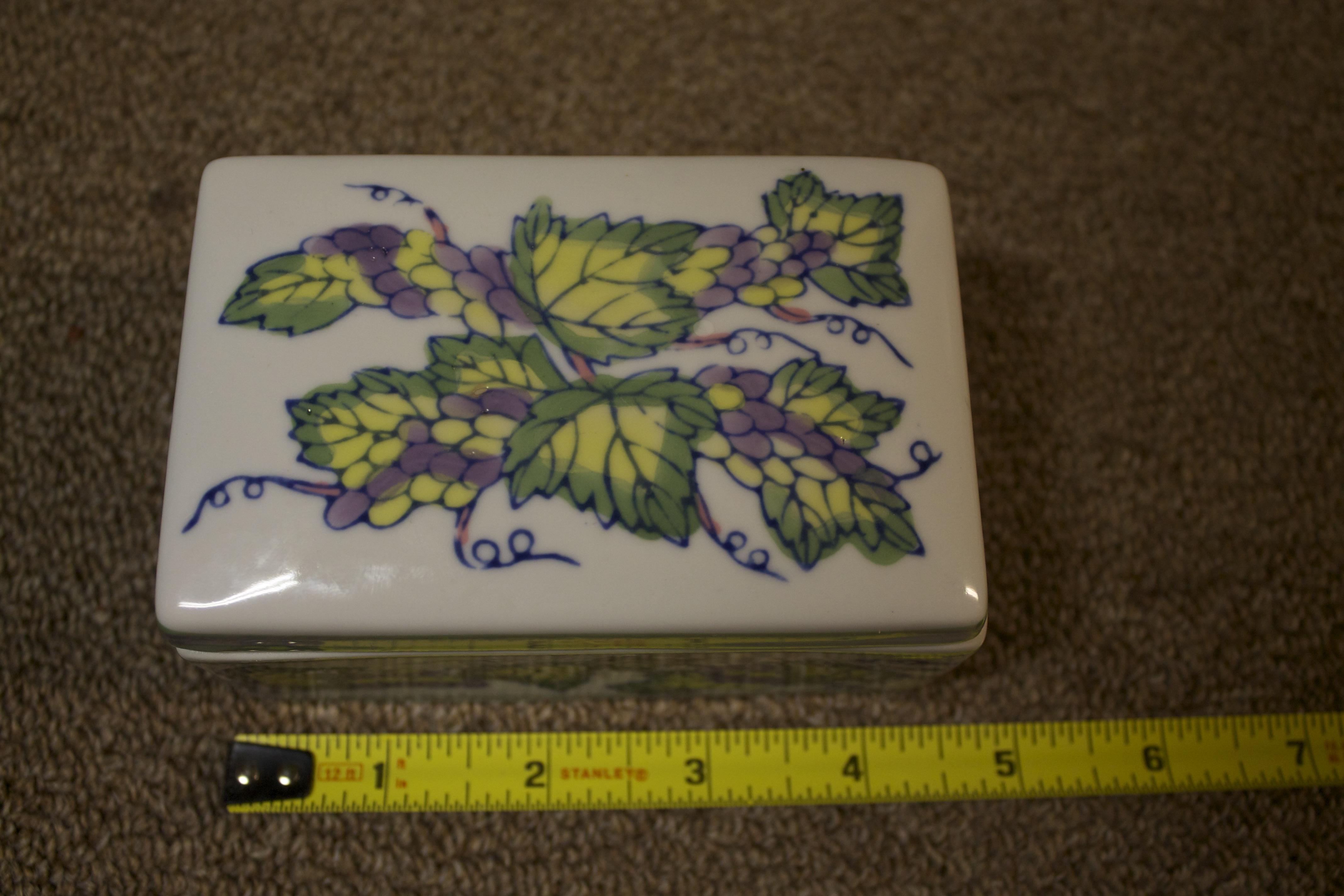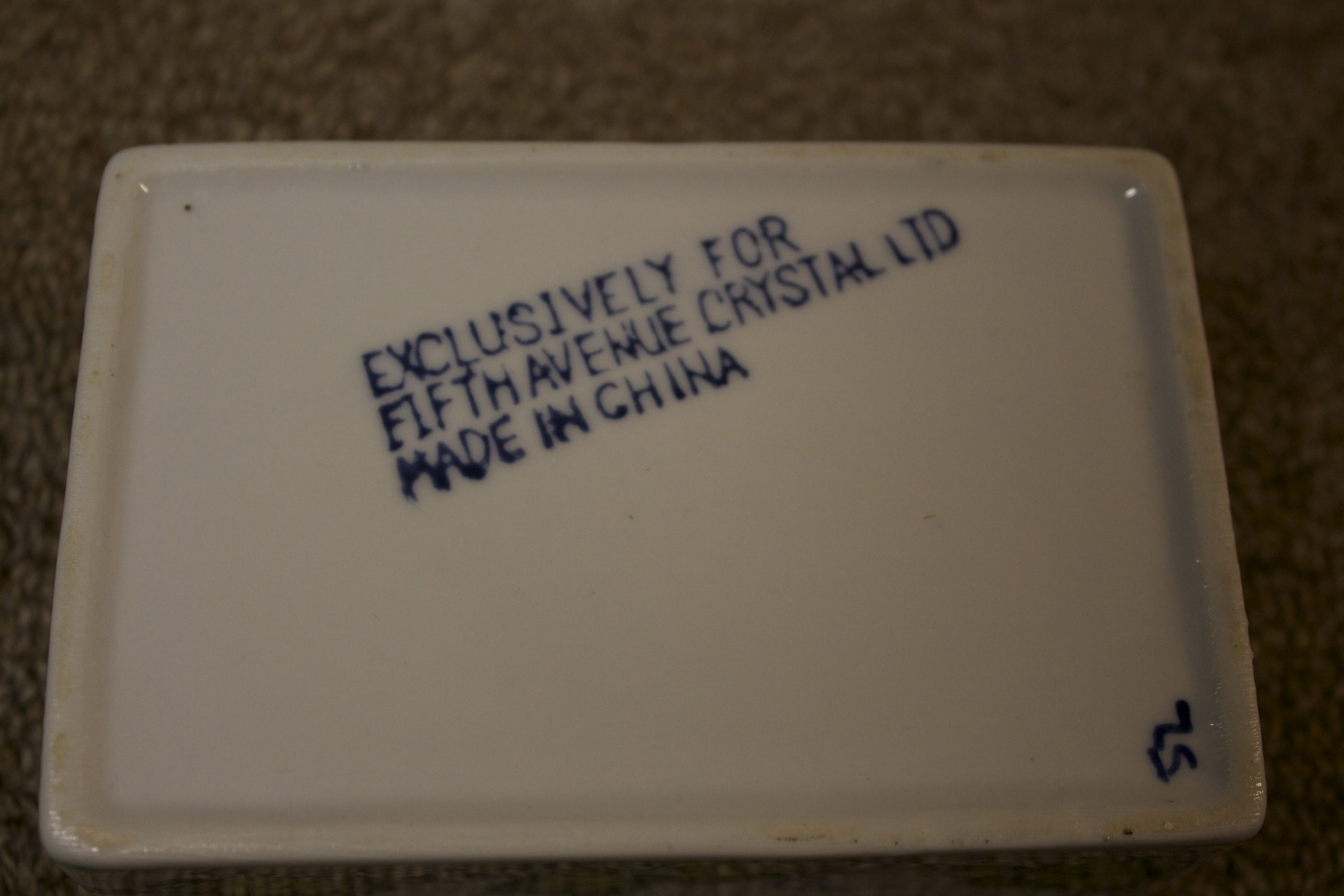 This looks to be something like a soapdish(?) The bottom reads "EXCLUSIVELY FOR FIFTH AVE CRYSTAL LID MADE IN CHINA". There is a number 52 glazed into the bottom right corner. I picked it up at a yard sale, so I do not know anything else about it. Does anyone have any info on ow old it is or how much it may be worth?