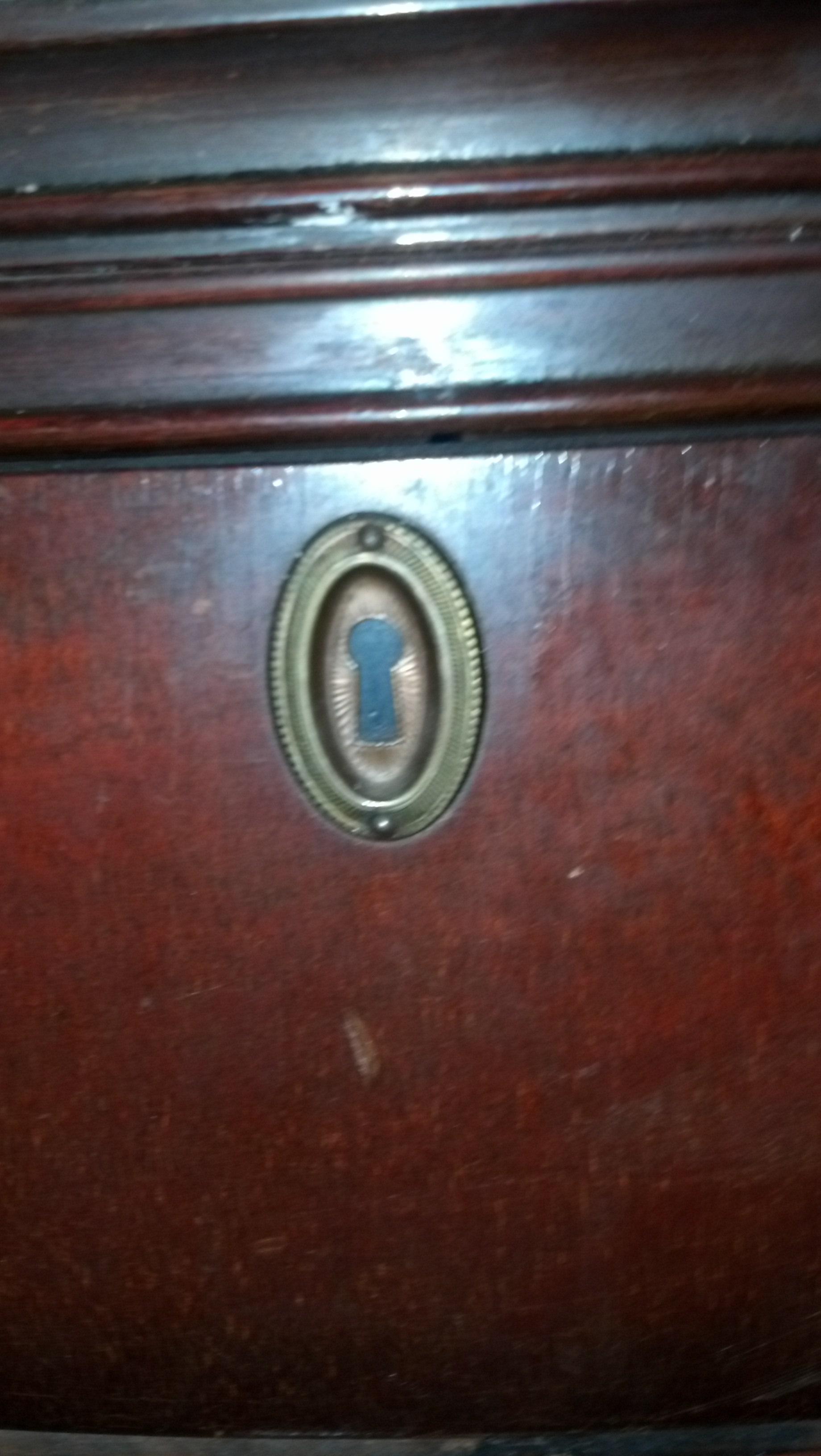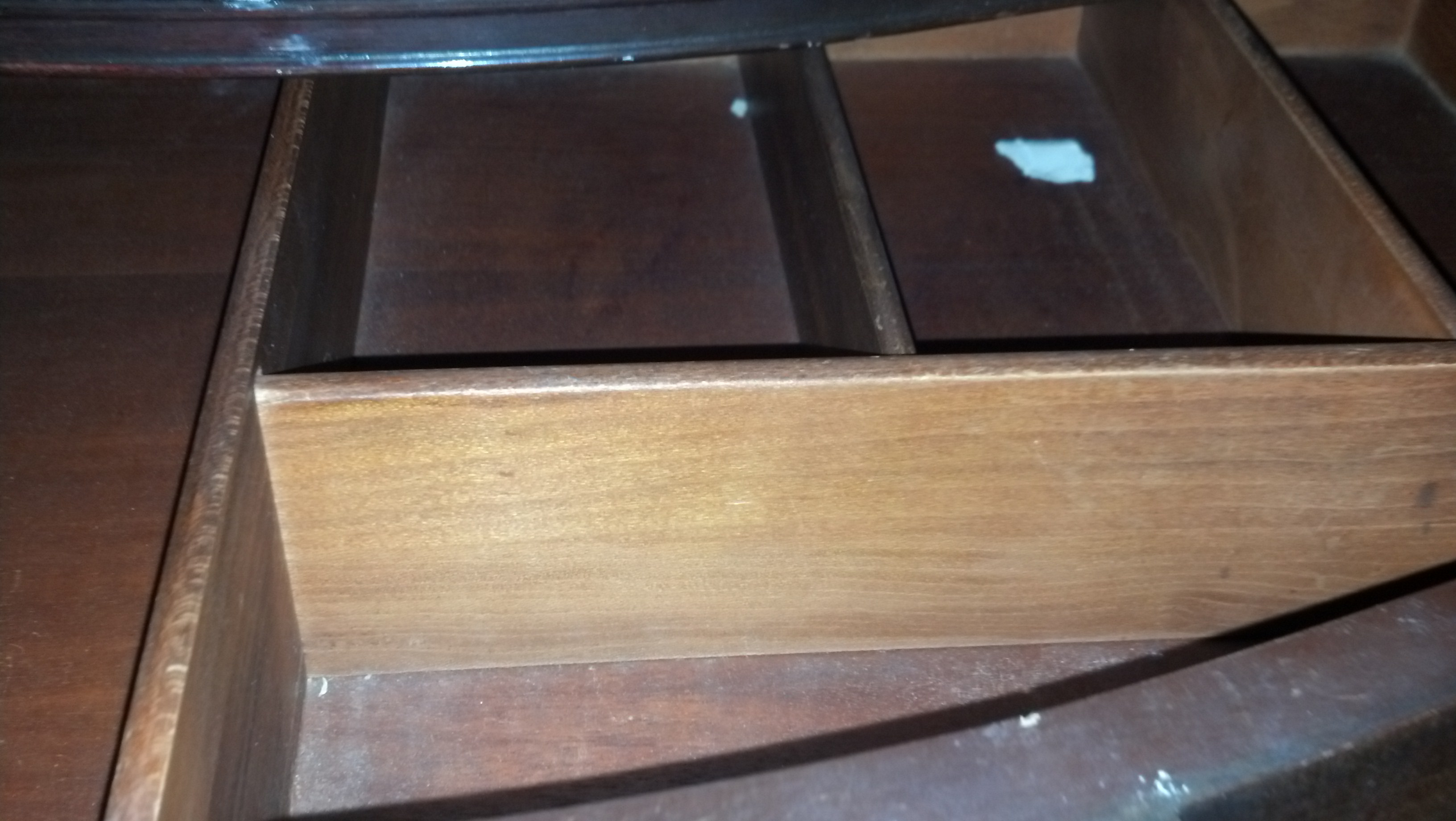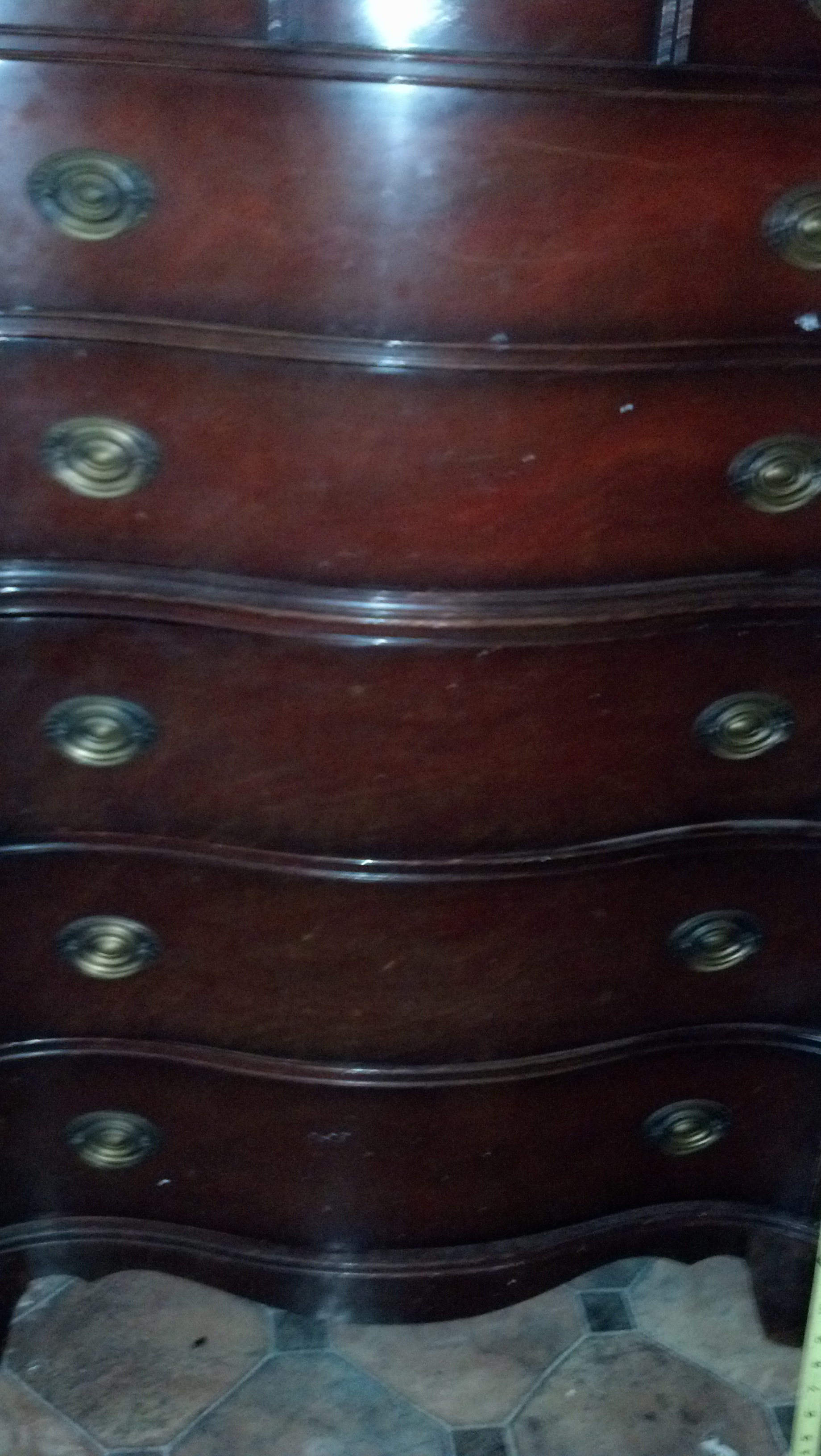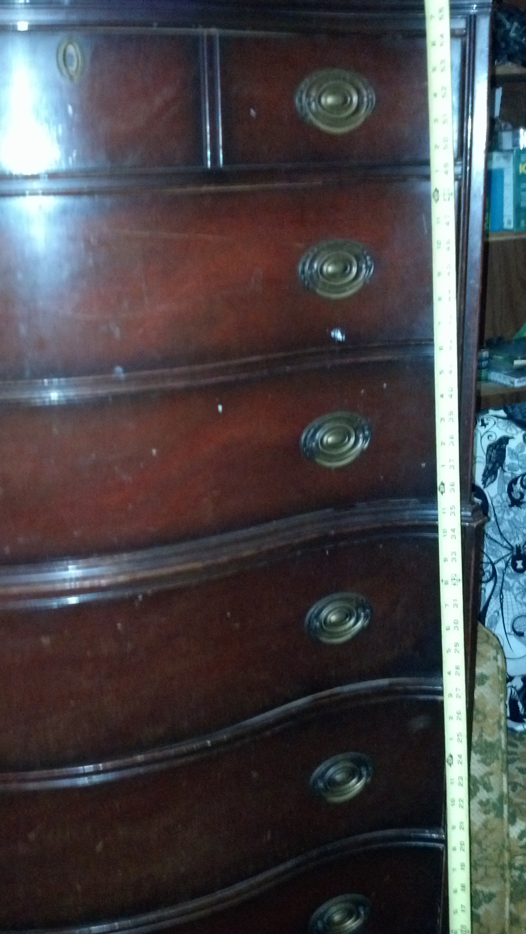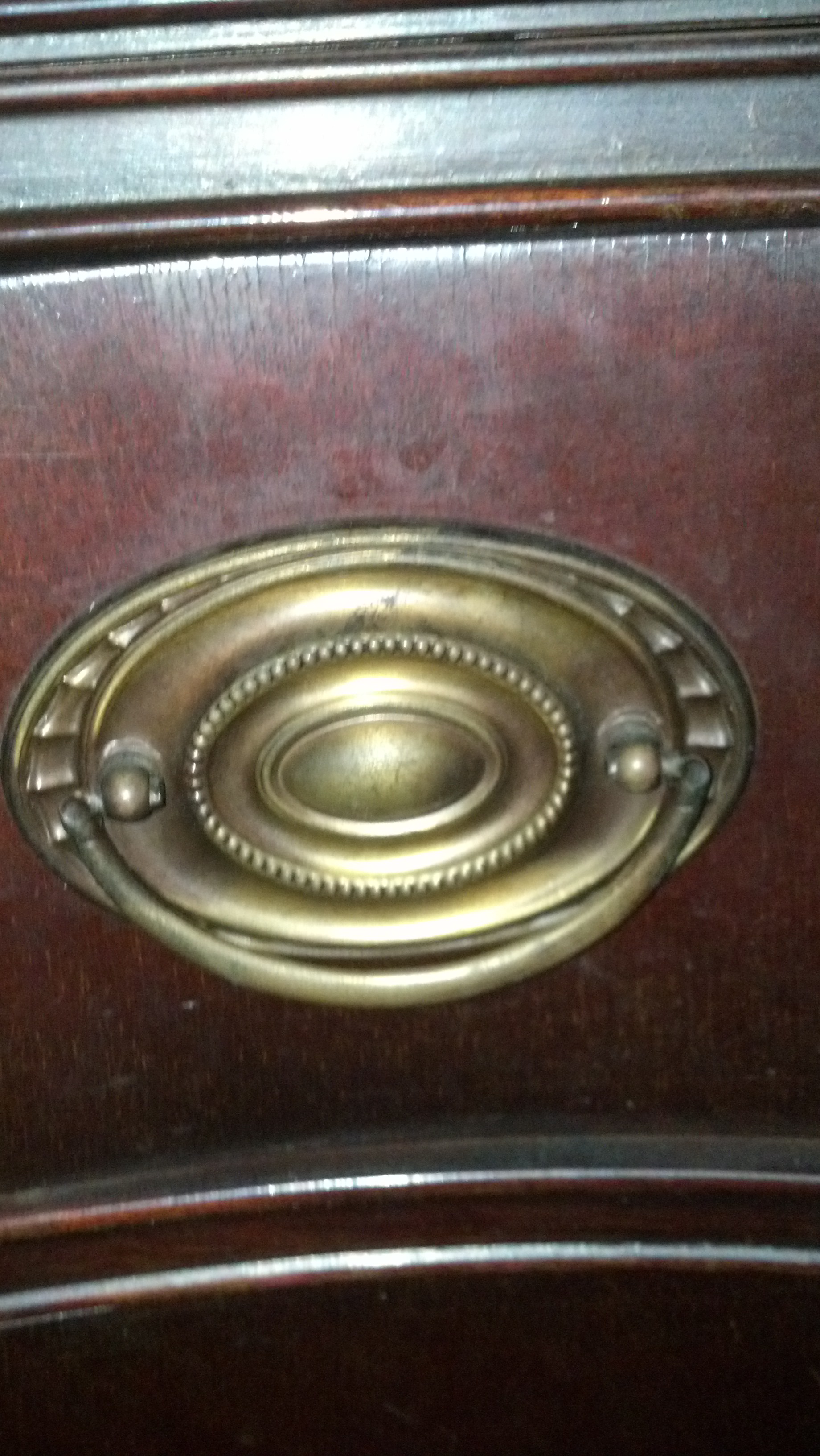 This dresser is 4ft 6in and in beautiful condition. The top drawer has many sections for keeping your things organized. The bottom drawer is seperated into 3 sections. The drawers are dovetailed, although I dont see glue. The back is screwed on. The handles are brass (bail?) single bar. I have looked around the internet and havent seen ones that are exactly like them.The drawer fronts are bowed and the dresser looks as though it is two peices (it is not) 3 drawers over 3 drawers. There is a keyhole on the top drawer. The drawers have a wooden runner down the center (inside the carcass) and there are little blocks at the end of the space to stop the drawer at a certain point. There are no metal inlays or inlays of other woods. It is extreemly sturdy with no signs of disrepair anywhere! Its as though it was used for a short while, put in the attic and forgotton.