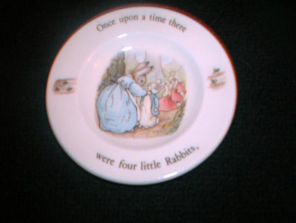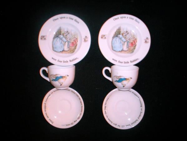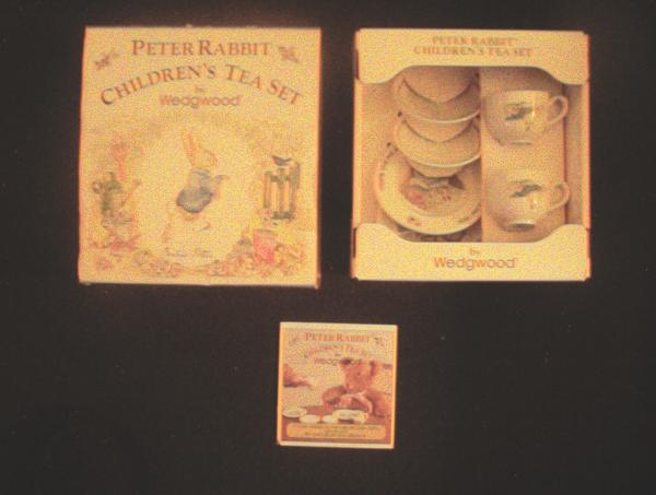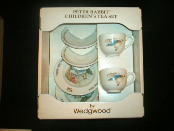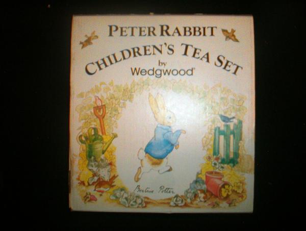 6 Piece Peter Rabbit Children's Tea Set by Wedgwood of Etruria & Barleston. Made in England. Beatrix Potter illustrations reproduced by permission of Fredrick Warne & Co.Ltd.,Beatrix Potter Creations, publishers of the Peter Rabbit stories. Packaged in original 19cm x 20.5cm bow with slide out display box. This set is in immaculate condition with Wedgwood registered trademark and copyright company located on underside of each piece.