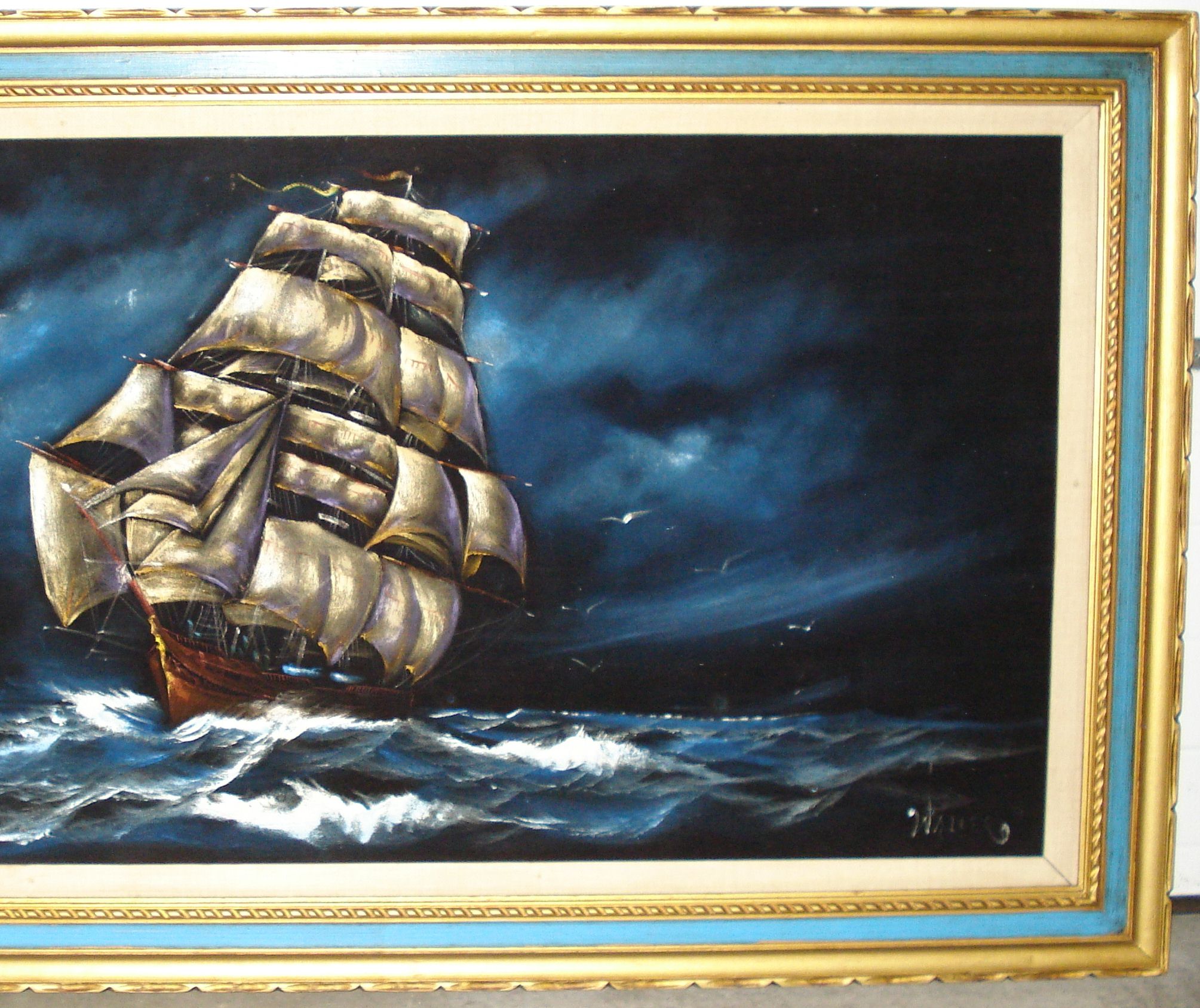 The painting itself is of an old galleon sailing on the open sea. It is an oil painting and, unusually for its age, was completed on black velvet. It is quite large at 3ft by 5ft and the frame is in great condition. My relatives have told me that my grandfather bought the painting as an investment some 55 to 60 years ago after receiving a very generous bonus from his boss one year. He paid $5,000 for it, which was quite an investment at the time.