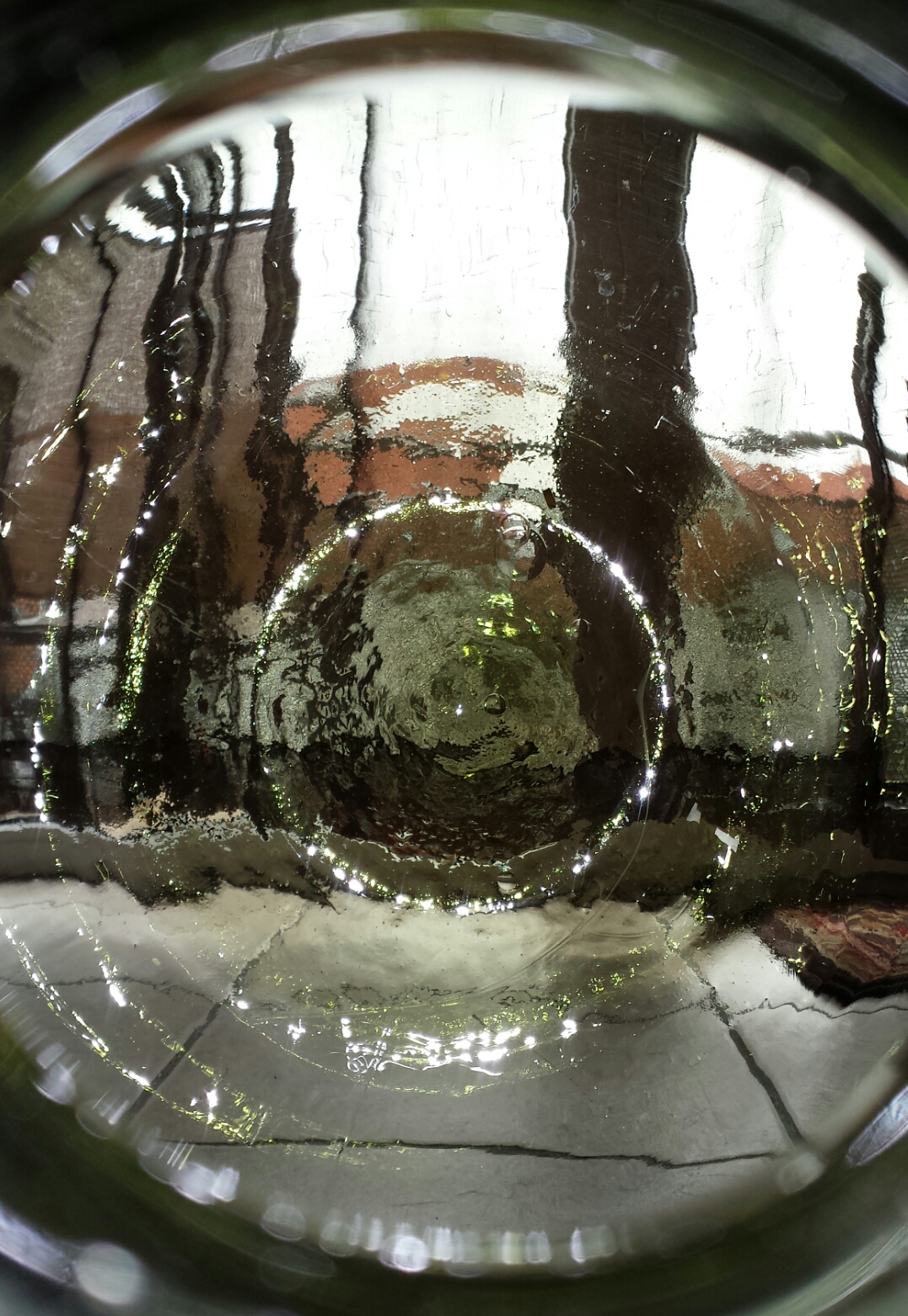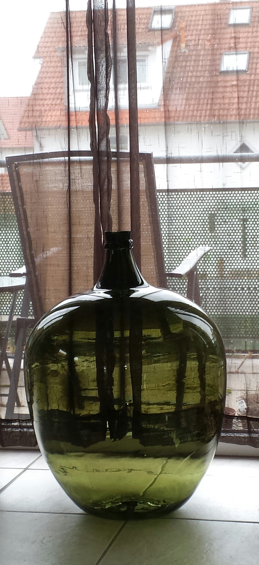 This bottle is about 30 inches tall. It has the name HEYE NIENBURG and the number 64 crimped onto the collar. I can't notice any pontil mark on the bottom. I believe it was made in Germany, but can't find any info about the age. It has a horizontal line around the circumference at the shoulder level, but no vertical lines. It has minor surface scratches and many air bubbles throughout the glass. The mouth opening is very rough. Not sure if this is due to the glass being chipped or possibly where the blow rod was broken off. TIA