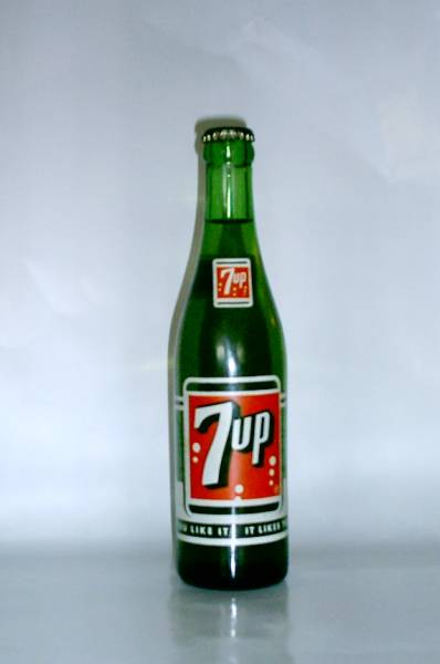 I'm not positive, but this may be a first generation 7UP bottle, bottled by Joyce Beverages. It's still capped with the origonal contents intact. It features a painted label with the old slogan "You like it It likes you" It's a 10-Oz. 10 inch bottle. If this helps, there's some numbers and letters on the bottom of the bottle. First an X. Below that a 9 followed by an encircled "I" followed by 61. Below that a 9. Below that "Duraglas" and finally below that a G-1524.