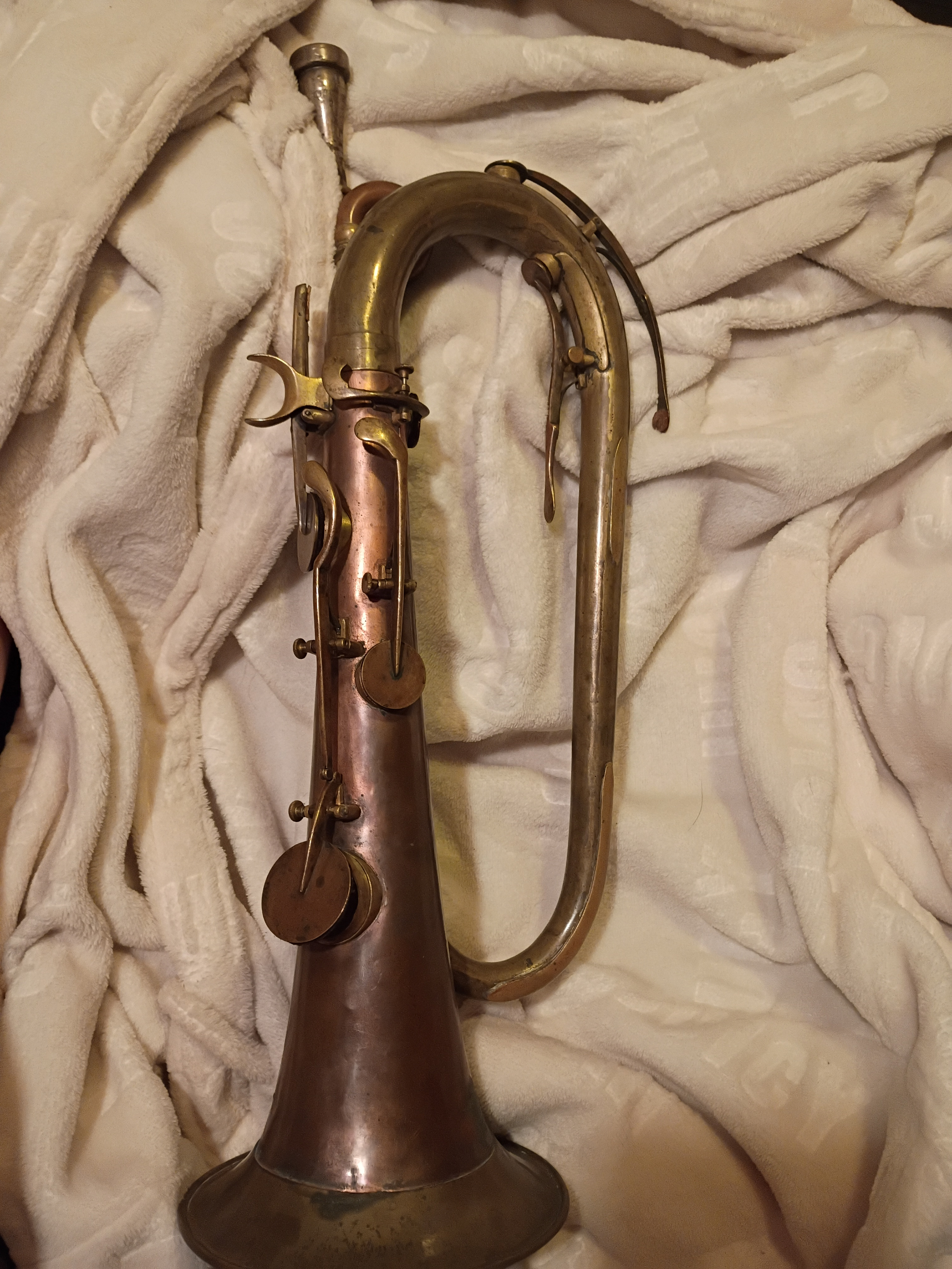 7 Key Bugle. Dating to Late 19th to early 20th century. Materials: Brass. Estimated value: $150 – $300. Condition: Good. The market for vintage brass instruments is currently moderate, with prices varying based on condition and historical significance.