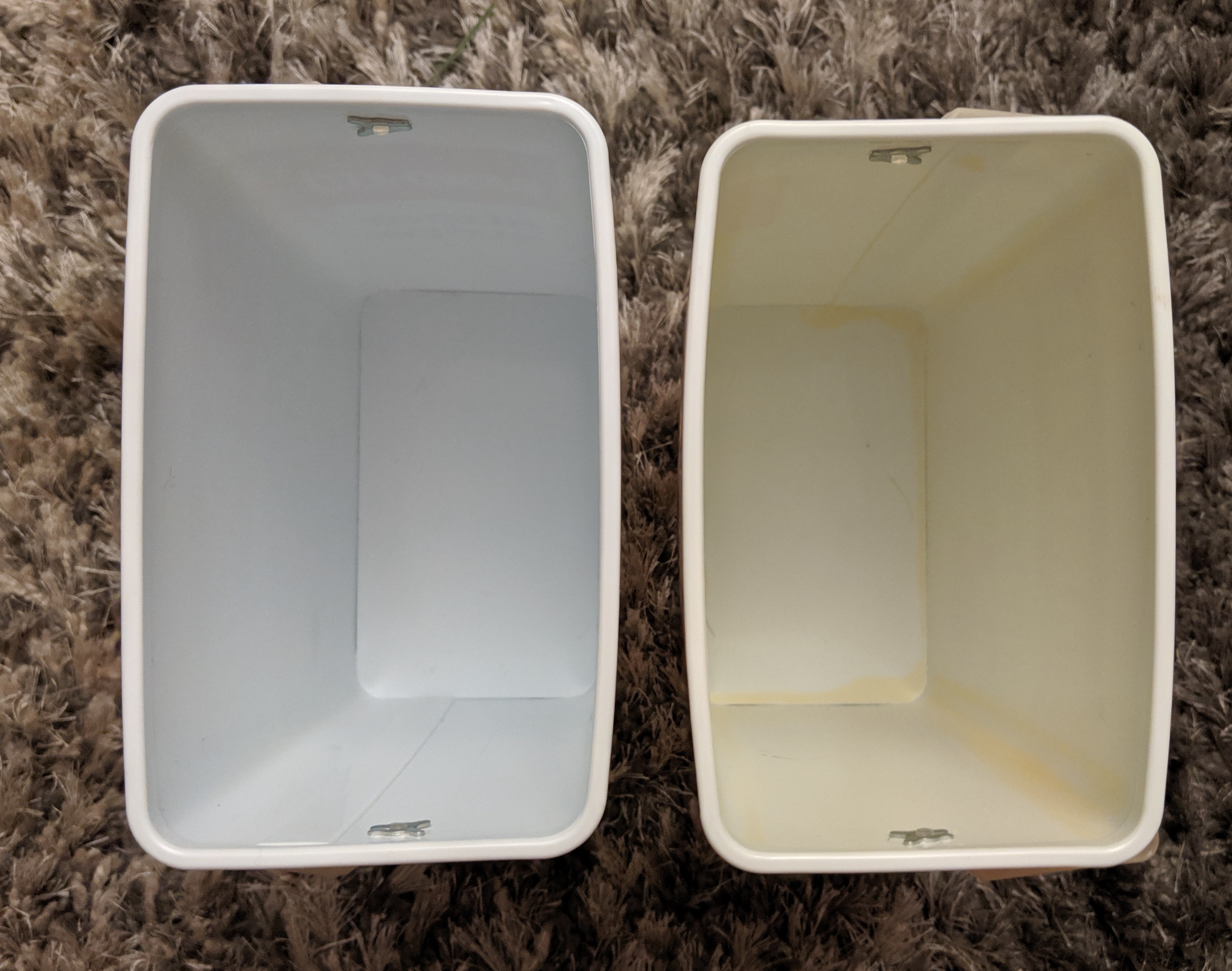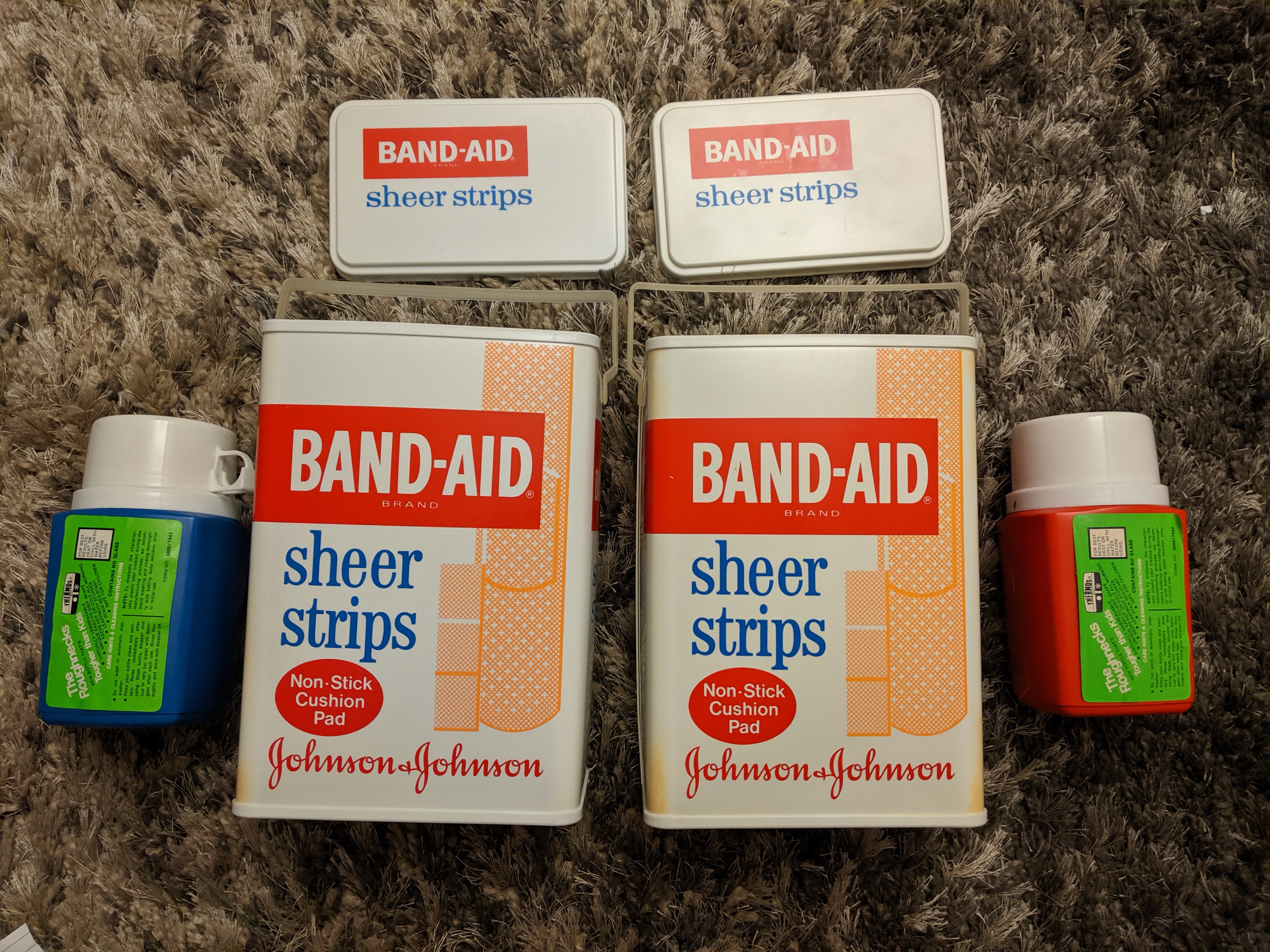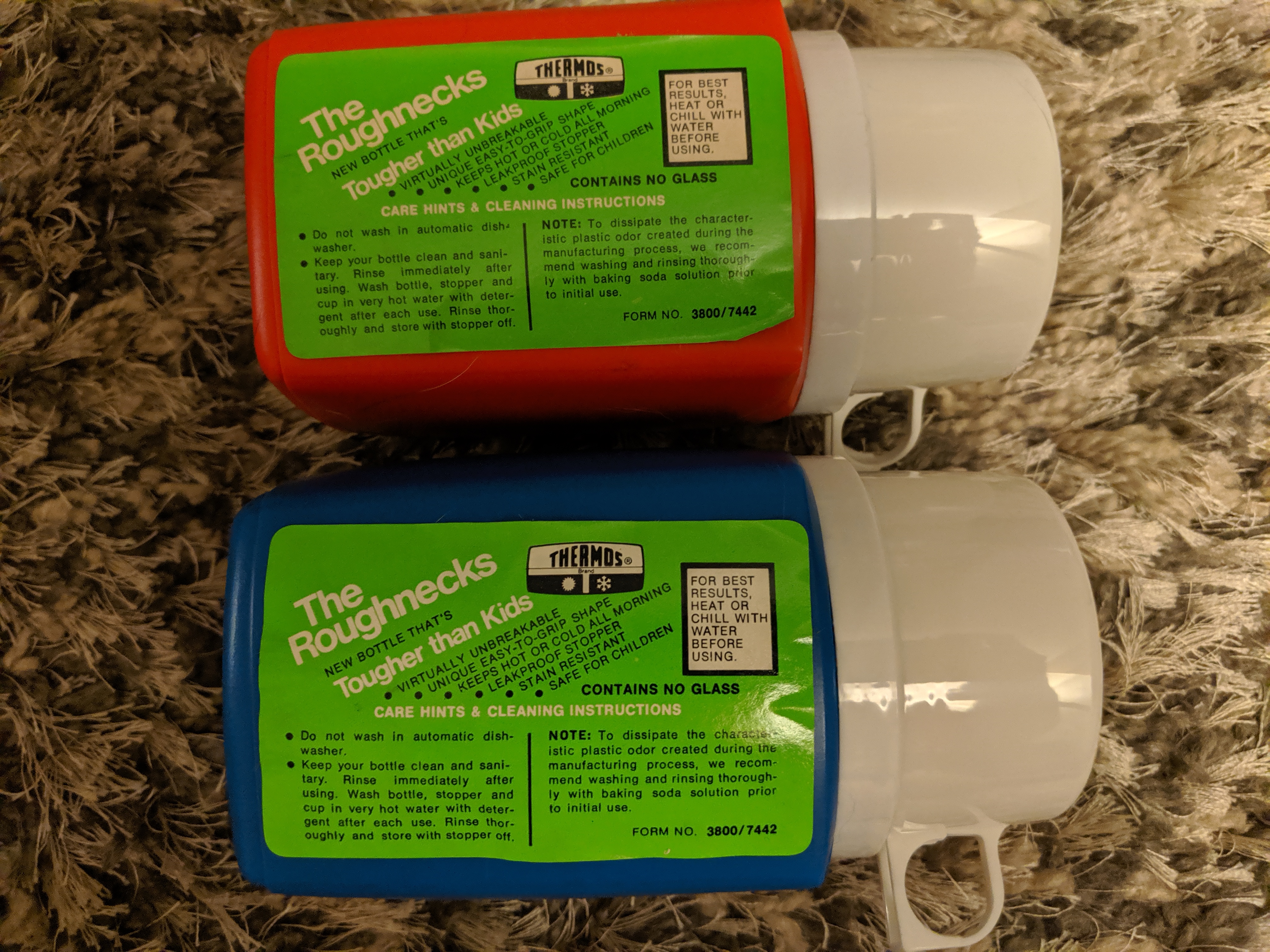 Red thermos set was opened, looked at & returned to original box. Some yellowing. I believe good condition for age.