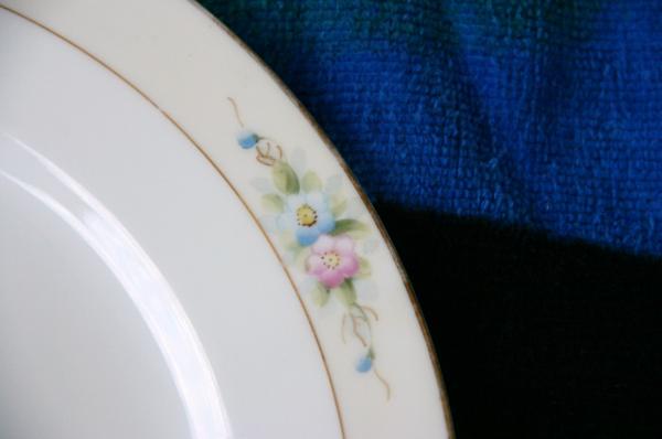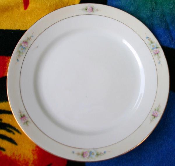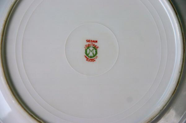 Not not until 1914 after a long series of trials and errors the first fine porcelain dinnerware suitable for export was produced. On of the first patterns to be produces was the "Sedan" (11292). A piece of the dinnerware in the Noritake factory in Nagoya shows this to be a bleak white plate with a cream border of small flower sprays and the typical Noritake back stamp, the letter "M" in a wreath and the words "Hand painted." As a general rule the earliest dinnerware plates were mostly decorated with a liberal applications of gold. To identify the early Noritake porcelain, it is important to remember their intended adaption to the western taste. The "M in a wreath" mark was used between c 1914 until 1940.