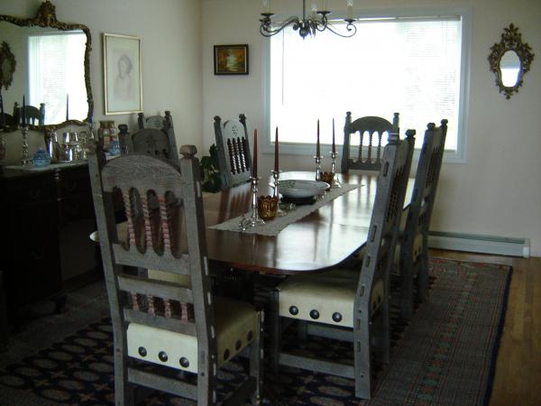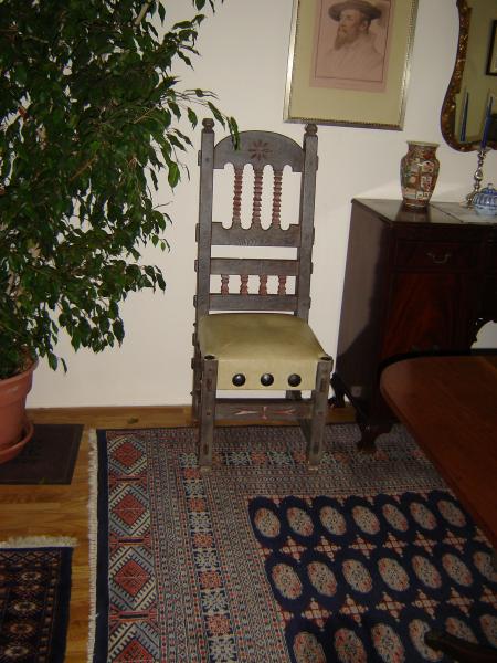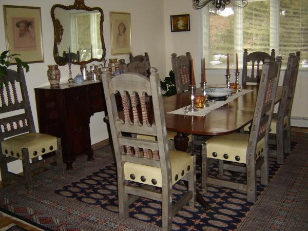 Eight beautiful hand carved chairs, very Spanish in style.