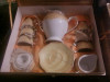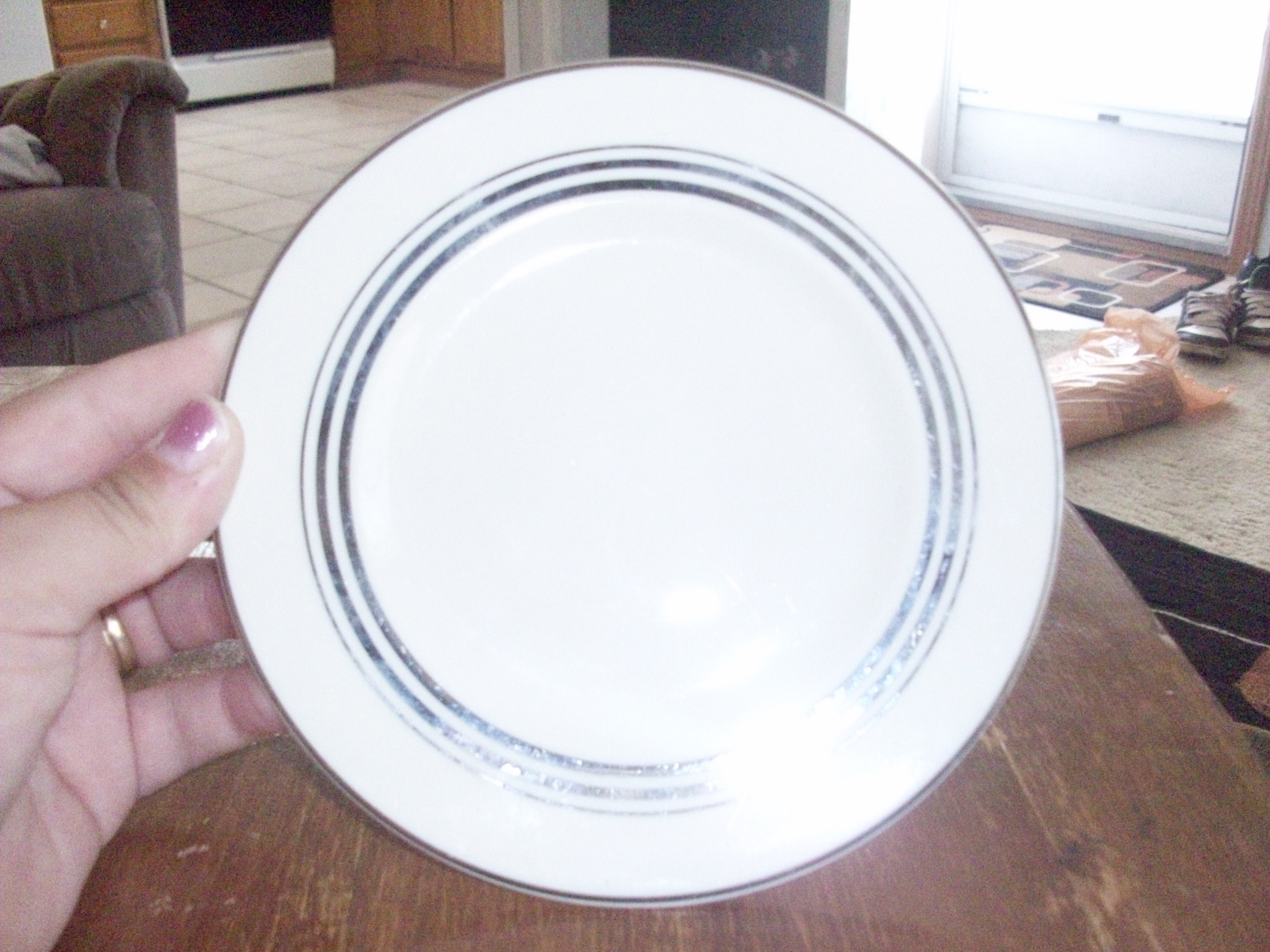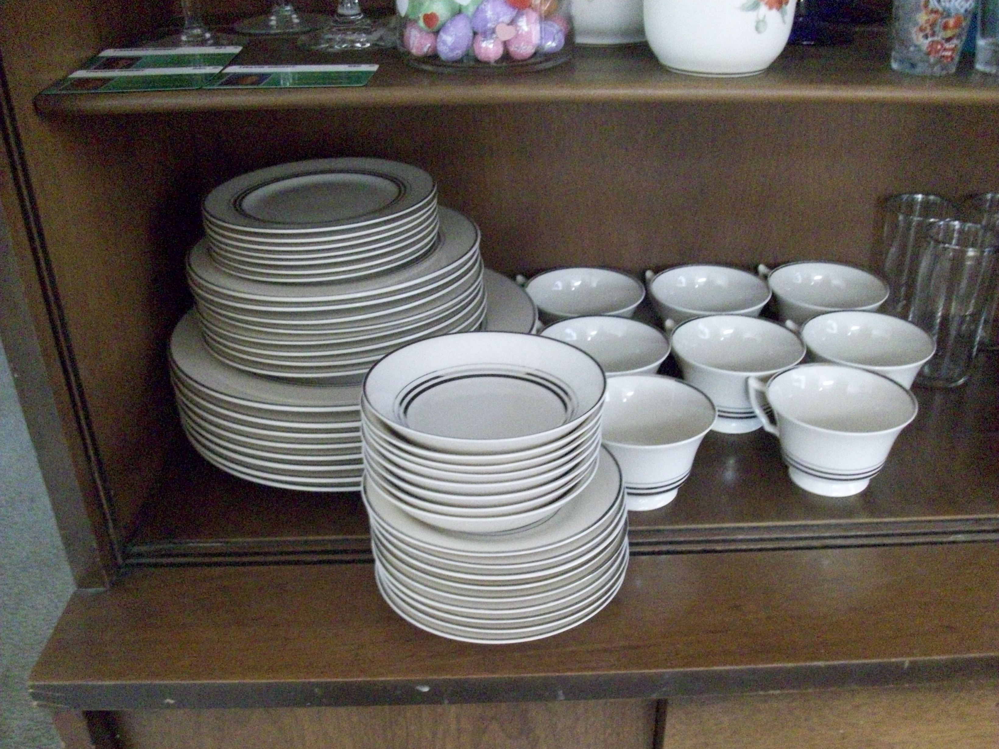 There are 8 large plates(26cm), 8 medium plates(20.5cm), 8 small plates (16cm), 8 smaller plates(14.5cm), 8 saucer plates(13cm), and 8 tea cups!0cm). They each have a silver ring on the trim, and three silver rings torards the center.