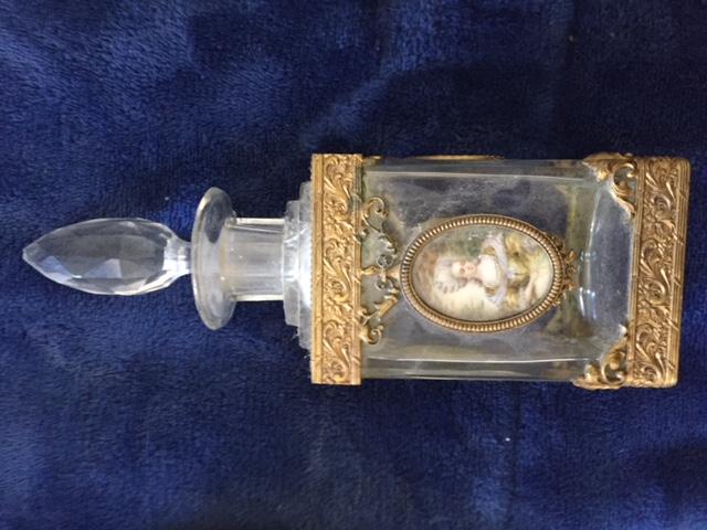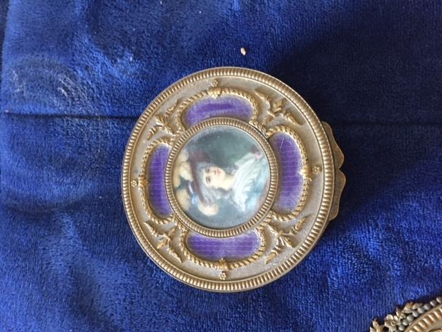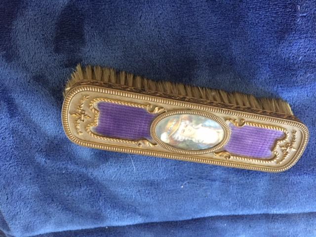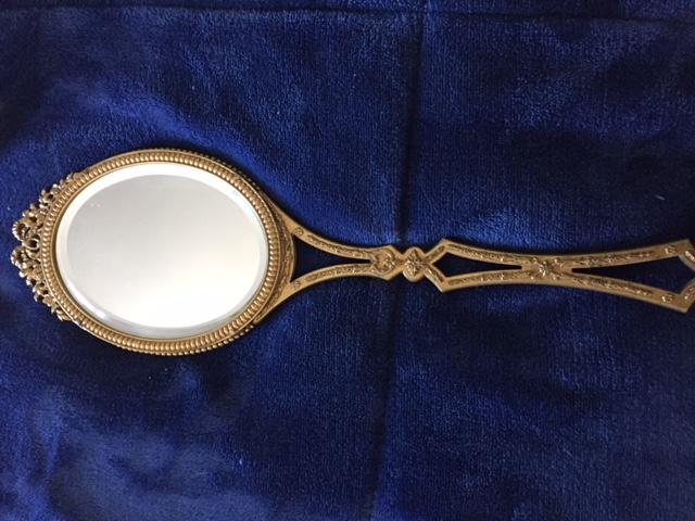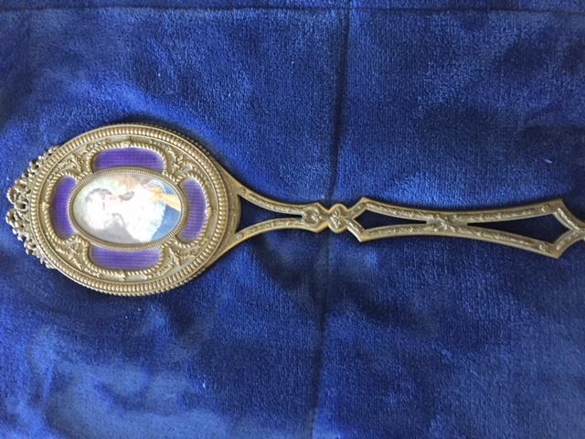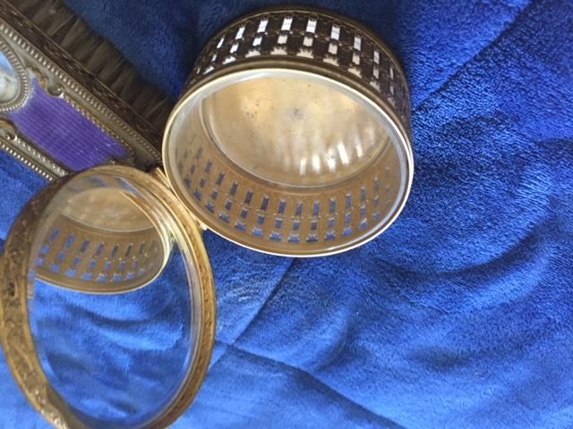 Old Vanity kit. Brush x2 comb, perfume bottle x2, powder box, mirror. Looks like gold with portraits on the back of the mirror and bottles.