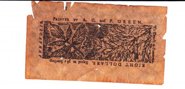 eight dollars? this intended bill of eight dollars shall entitle the bearer thereof to recive bills of exchange payable in london, or Gold and silver, at the rate of four shillings and six-pence sterling per dollar for the faid bill, according to the directions of an act of athembly of maryland dated in annapolis this 10 day of april anno domini 1774 it is signed by some one i cant make out the name looks like wlahham mceddis?? the back side has a stamp of two leaves and states around the box printed by a.c. and f. green tis death to counterfeit EIGHT DOLLARS Equal to 36s sterling annapolis