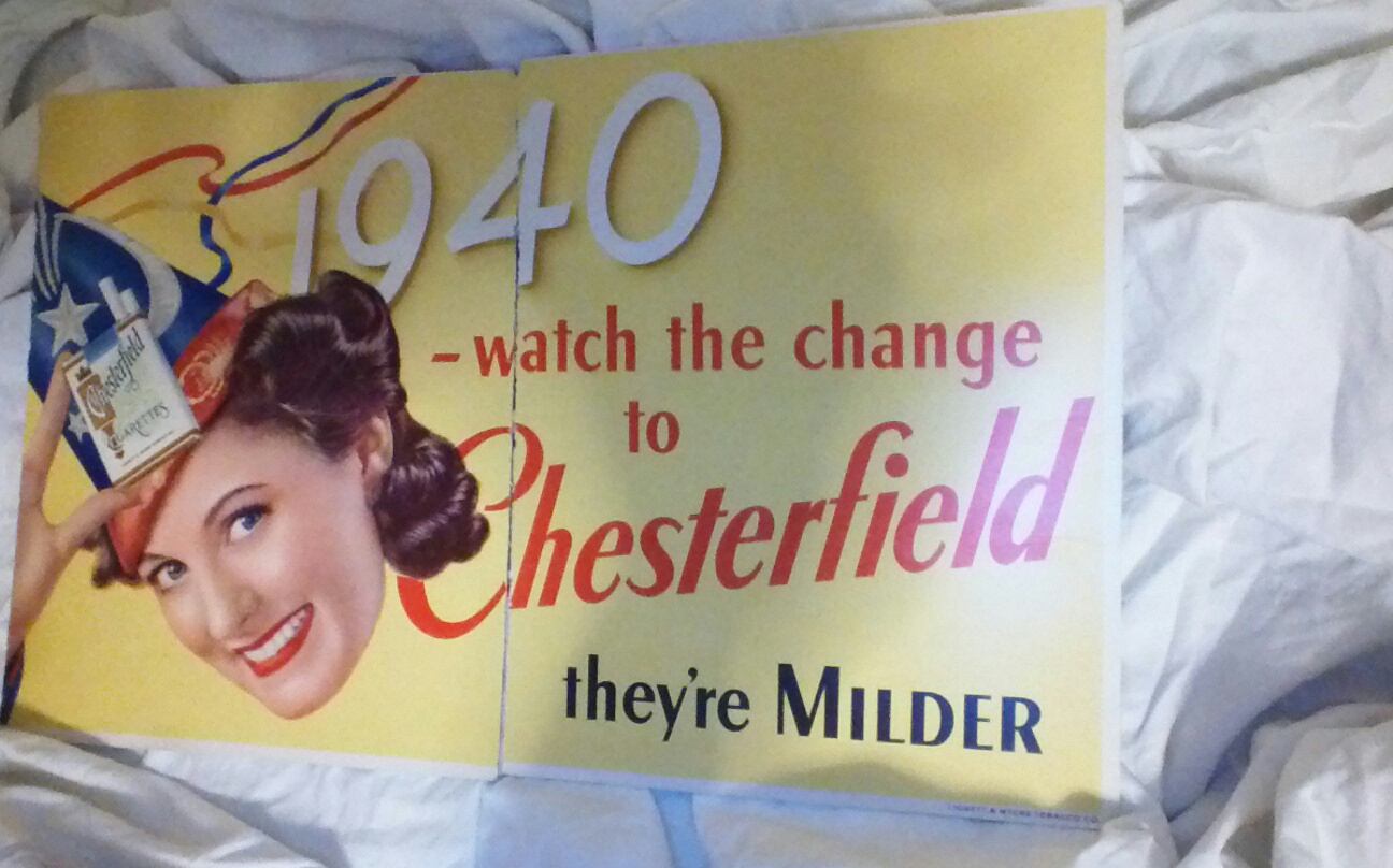 There was pieces  of cardboard  cut From 1940  chesterrfield cigarette ad  display between them it looks original to me