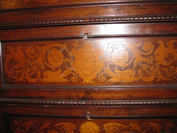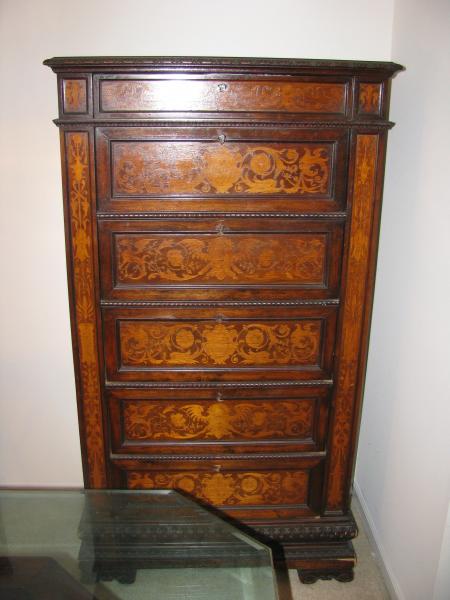 This piece of furniture is very nice with 9 drawers. Looks like it is made very well. The color is a very light yellow/off white. It is painted but has a rough or textured feeling. It is stamped in the back "The White Furniture Co."