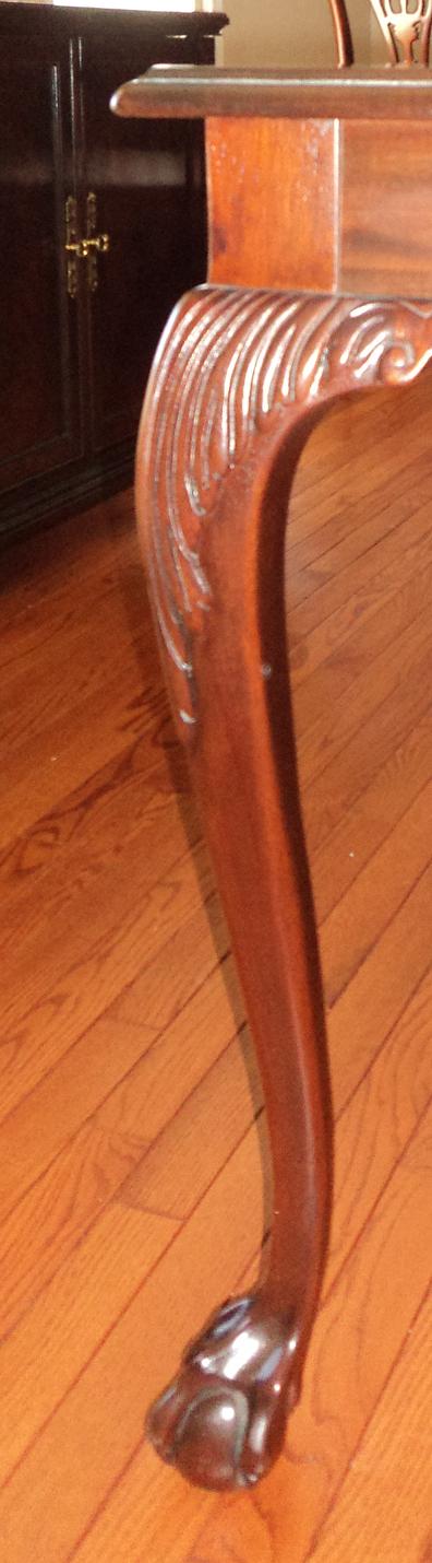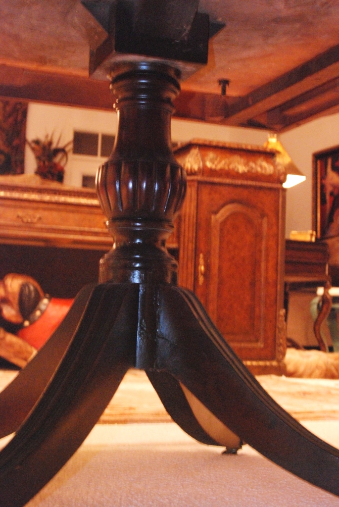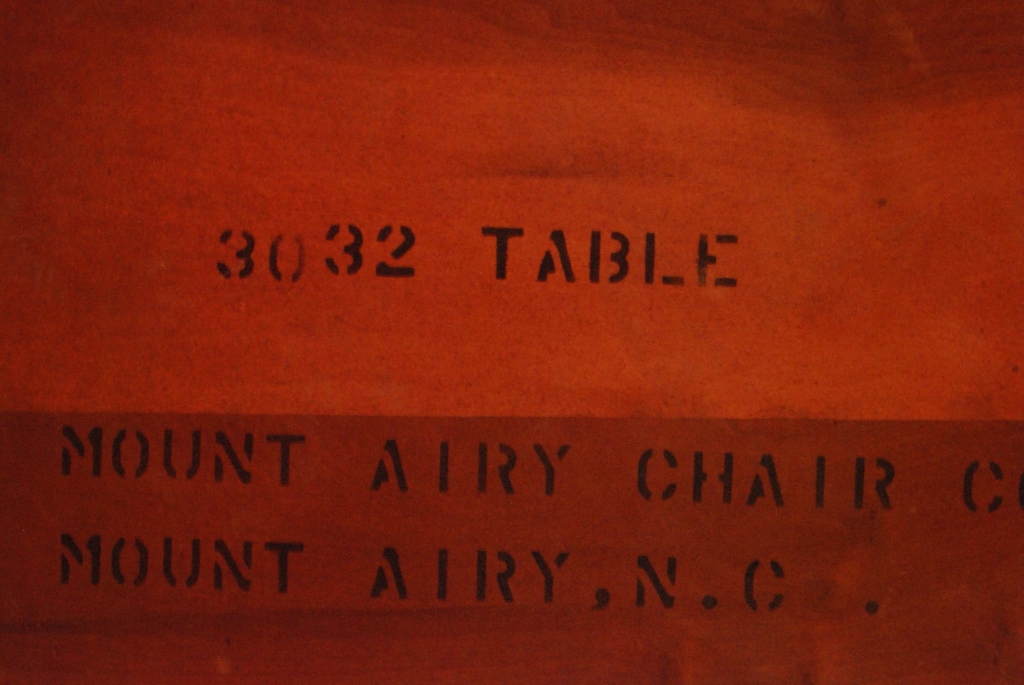 Boardroom table with solid slab top - no leaf - measures 96" long and 48" wide. It has two pedestals with four legs per pedestal. Brass caps and wheels on all legs. Stenciled on bottom side of table: 3032 Table, Mount Airy Chair Company, Mount Airy NC