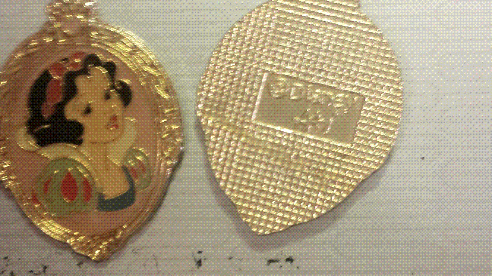 gold snow white clip on earrings words Disney and AAi printed on the back