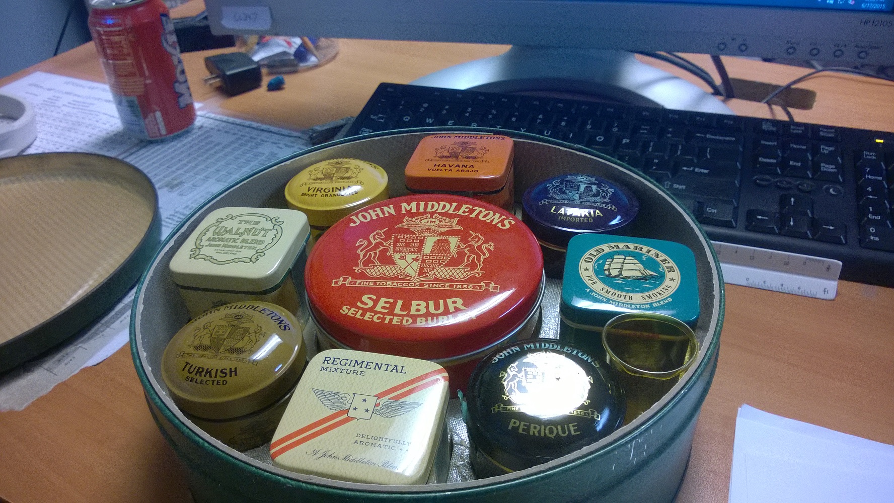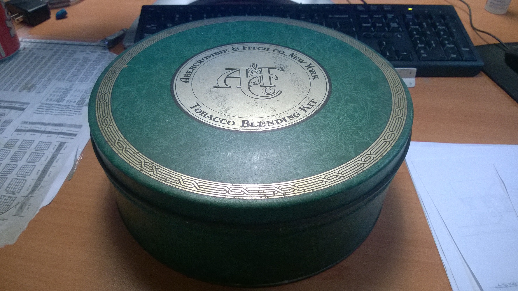 My wife's grandfather passed away almost a year ago. We came across an Abercrombie & Fitch Co. New York - Tobacco Blending Kit. Inside the kit it has 9 different tins of various tobaccos from John Middleton. Each tin has a stamp which states"U.S. INTER. REV. ACT OF FEB. 26.1926 ONE AND THREE EIGHTS BUREAU ENGRAVING AND PRINTING. These seals have all been broken. Each tin has a full compliment of tobacco wrapped in an orange cellophane.