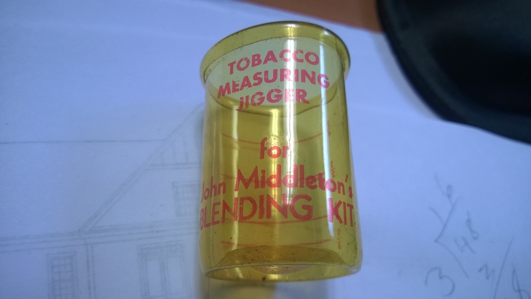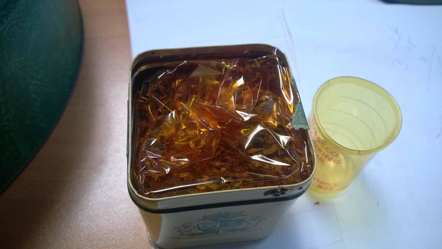 Along with the tins and tobacco there is also a tobacco measuring jigger. It is slightly warped but has no cracks. Inside the tin there is a cardboard like spacer for the tins to fit in to. This is bent (what seems like from taking the tins out and putting them back in).
